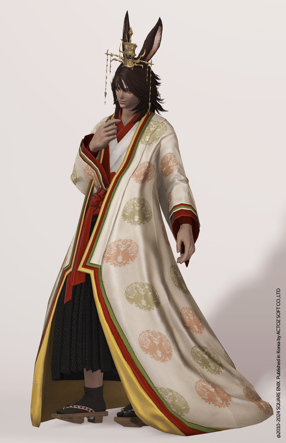 천을 아낌없이 사용해 길게 늘어트린 상의는 땅에 끝자락이 끌리는 형태로 되어있어, 평소에 찾아보기 어려운 실루엣을 자아냅니다. 전투 등 행동에 방해가 될 법 하지만... 모험가들은 전혀 개의치 않으니 아무렴 괜찮습니다. 안에 받쳐입은 상의는 총 두 겹으로, 깔끔하게 정돈하여 넉넉한 폭의 천을 사용해 허리에 묶어 고정시켜 두었습니다. 같은 세트의 하의와 마찬가지로 골반 즈음에서 깔끔하게 끊기는 의상이며, 따라서 하의 매치 시에도 여러 조합을 시도해 봄직합니다.