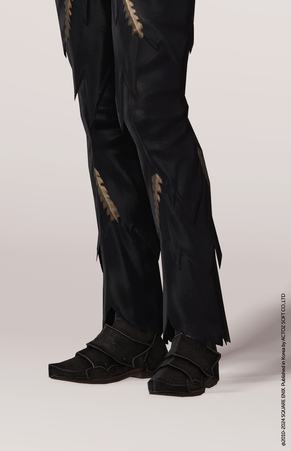 로자리아 공국의 제 1왕자, 클라이브 로즈필드의 신발입니다. 다소 빳빳한 소재를 사용해 만든 단순한 형태의 신발 위로 사바톤(발등을 보호하려 덮은 갑옷의 부분)의 역할을 할 수 있도록 금속판을 다듬어 보강하였는데 그러면서도 너무 투박해 보이지 않도록 심플하게 라인을 주어 디테일과 심미성을 챙긴 부분이 시선을 사로잡습니다. 발 뒤꿈치 역시 특유의 곡선에 맞추어 철판을 구부려 달아두었습니다. 유사시 내지른 발차기가 묵직하게 들어갈 수 있도록 금속 소재를 덧댄 뒤꿈치 굽 부분의 디테일도 빼먹으면 섭섭하지요.