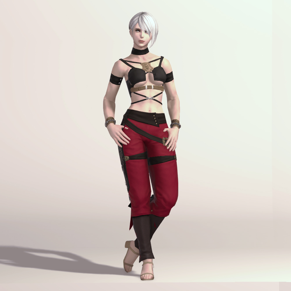 허벅지의 벨트가 포인트이며 주로 허벅지 장화와 같이 매치합니다.