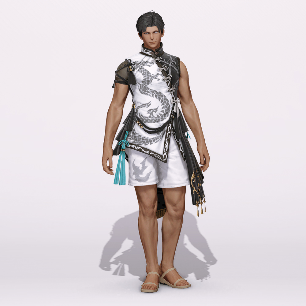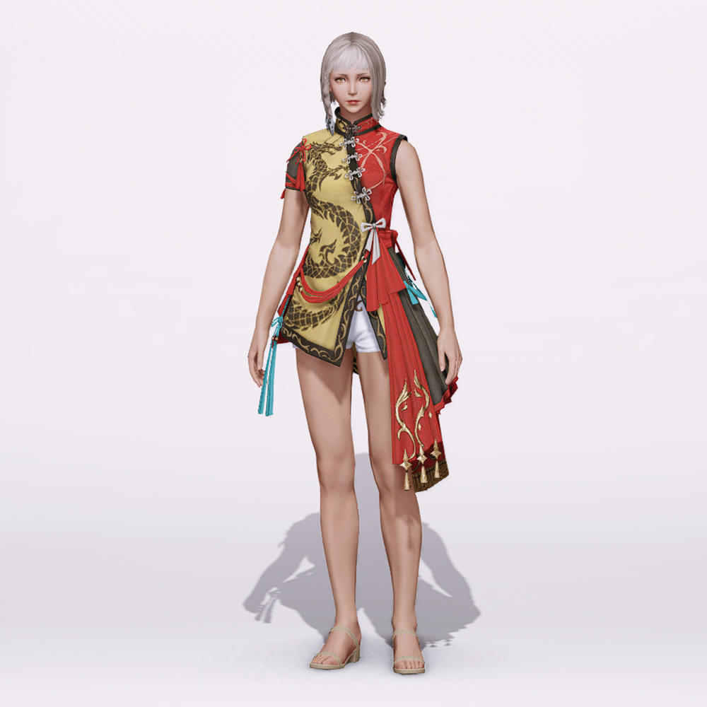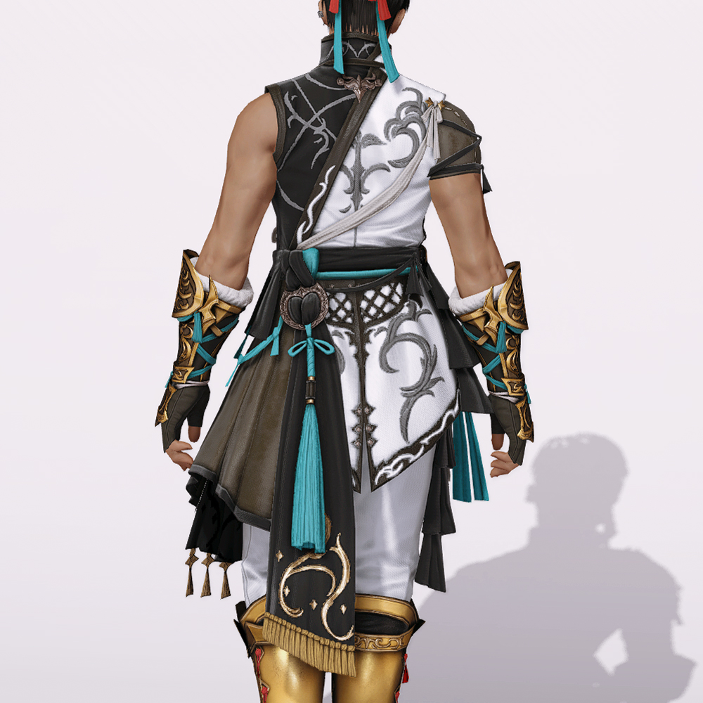 여러 끈과 천이 모이는 허리에는 깔끔히 매듭지은 천을 늘어트리고, 금속 장식을 사용해 노리개와 술장식처럼 연출한 부분이 어느 장비에서도 찾기 힘든 은둔승 도복만의 아이덴티티. 옆으로 살짝 비껴난 트임이 있어 어떻게 활용하느냐에 따라 여러 조합을 낼 수 있어 보입니다.