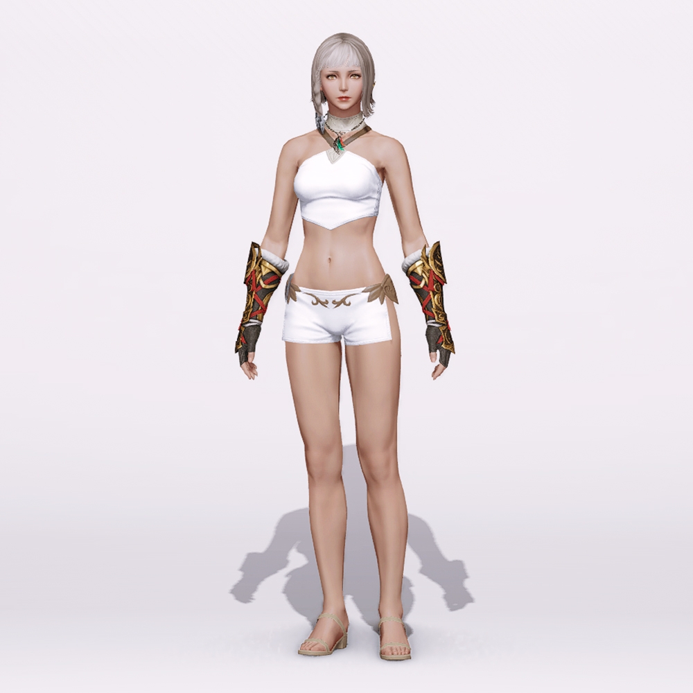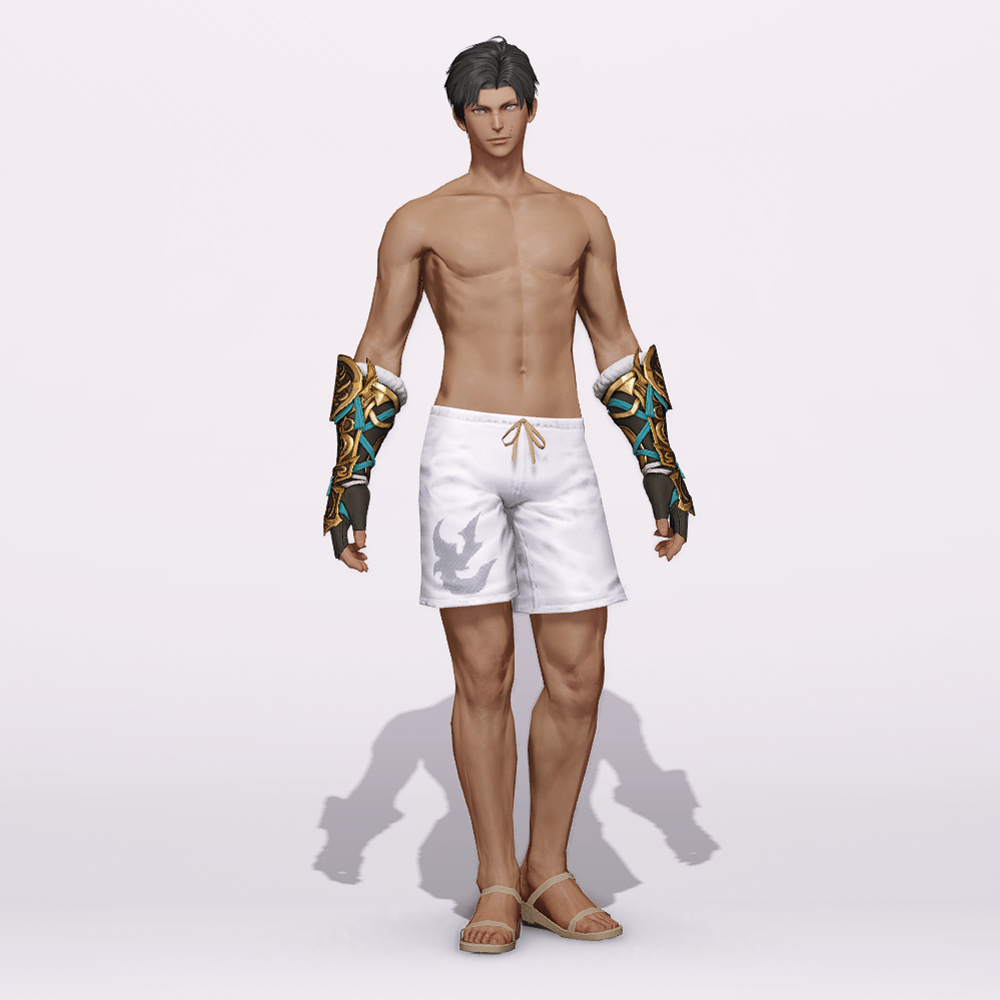 단순히 팔을 보호하는데서 그치지 않고, 그 팔 자체를 무기로 사용하는 투사들을 위한 완갑입니다. 충격을 어느 정도 받아낼 수 있도록 두툼하게 안감을 덧대고, 손 끝을 섬세히 다룰 수 있도록 반장갑의 형태를 취했습니다. 팔 바깥쪽과 손등을 덮는 금속판은 우아하면서도 강인함이 느껴지는 모습으로 세공되어 착용자의 힘을 가늠케 합니다. 금속판들을 엮는 데 사용한 끈은 깔끔하게 매듭지어 장식적인 요소로 삼은 센스가 돋보입니다. 아쉽게도 금속 부분은 염색이 안 되지만, 끈과 장갑 부분으로 포인트를 줄 수 있습니다.