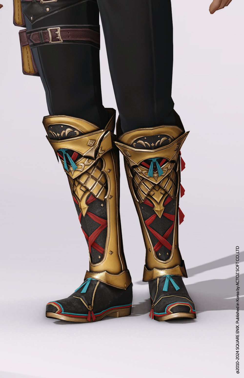 가볍게 발에 딱 붙는 단화에 금속보호구를 덧대었습니다. 뒷면처럼 앞도 완전히 덮은 게 아닌, 일부를 틔워 그 밑으로 고정을 목적으로 지나는 끈을 장식으로 활용한 점이 좋습니다. 우아하면서도 묵직한 모습으로 세공된 금속들이 주변의 얇은 끈장식들과 어우러져 균형감이 좋은 스타일을 자랑합니다. 금속부분과 청색 끈은 아쉽게도 염색이 되지 않아, 보호대와 고정용 붉은 끈으로 조합하여 컬러감을 맞추는 것을 추천드립니다.