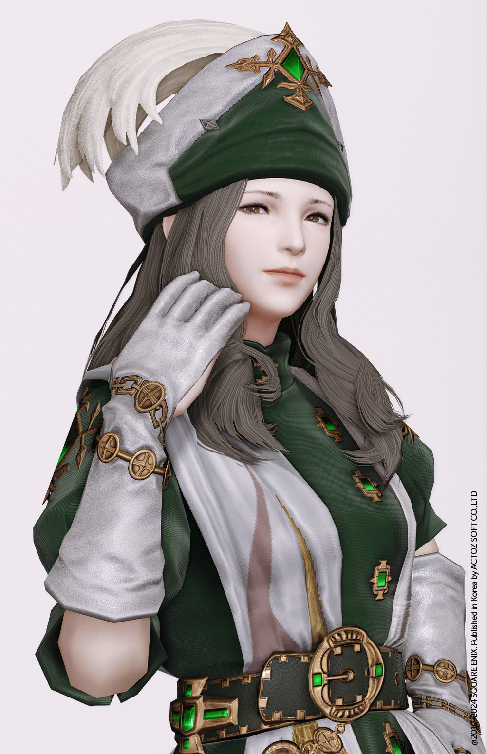 마치 성직자를 연상케 하는 형태가 독특한 모자입니다. 몸통은 큼직하게 두 부분으로 나누어 색이 다른 원단을 잇고, 그 제일 위에 보석과 귀금속을 세팅하여 장식했습니다. 비스듬하게 모자를 덮도록 깃장식까지 얹어 풍성한 마무리까지 완벽합니다. 장식이 화려함에도 깔끔하고 정돈된 이미지를 주므로, 심플한데 화려한 것을 추구하신다면 슬쩍 건네고 싶은 모자입니다.