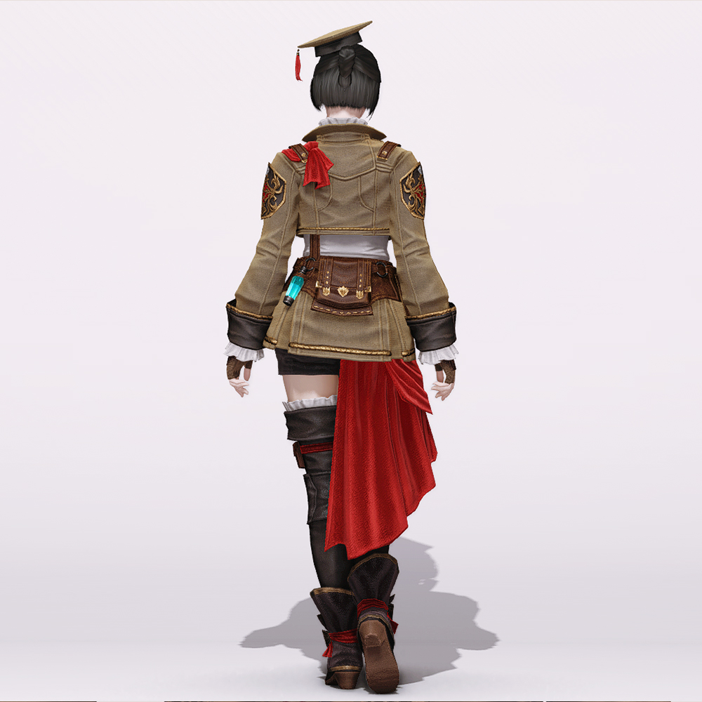 지식을 나누어 널리 이롭게 하고자 한다면, 그 방안으로 교육자의 길을 걷는 것도 한 방법일 수 있겠지요. 허벅지 위를 살짝 덮는 기장의 셔츠에 화려한 장식이 돋보이는 크라바트를 메고, 크롭 기장의 재킷을 매치해 활동성을 높혔습니다. 그러면서도 작은 가방 등을 단 허리보호대를 매치하고 재킷과 같은 양식의 장식들을 듬뿍 달아 나누어져 있음에도 하나로 이어져있게 보이게 하는 착시효과가 특징적. 군학자에서 기원한 직업 답게 제복 다운 양식을 곳곳에 차용한 점이 타 의상과의 차이점이라고 볼 수 있습니다. 온통 묵직해보이는 장식들로 가득함에도 불구하고 시원하고 활동적인 분위기를 내는데 제격이므로, 하의의 디테일을 비교적 심플하게 비워 매치하는것도 좋습니다.