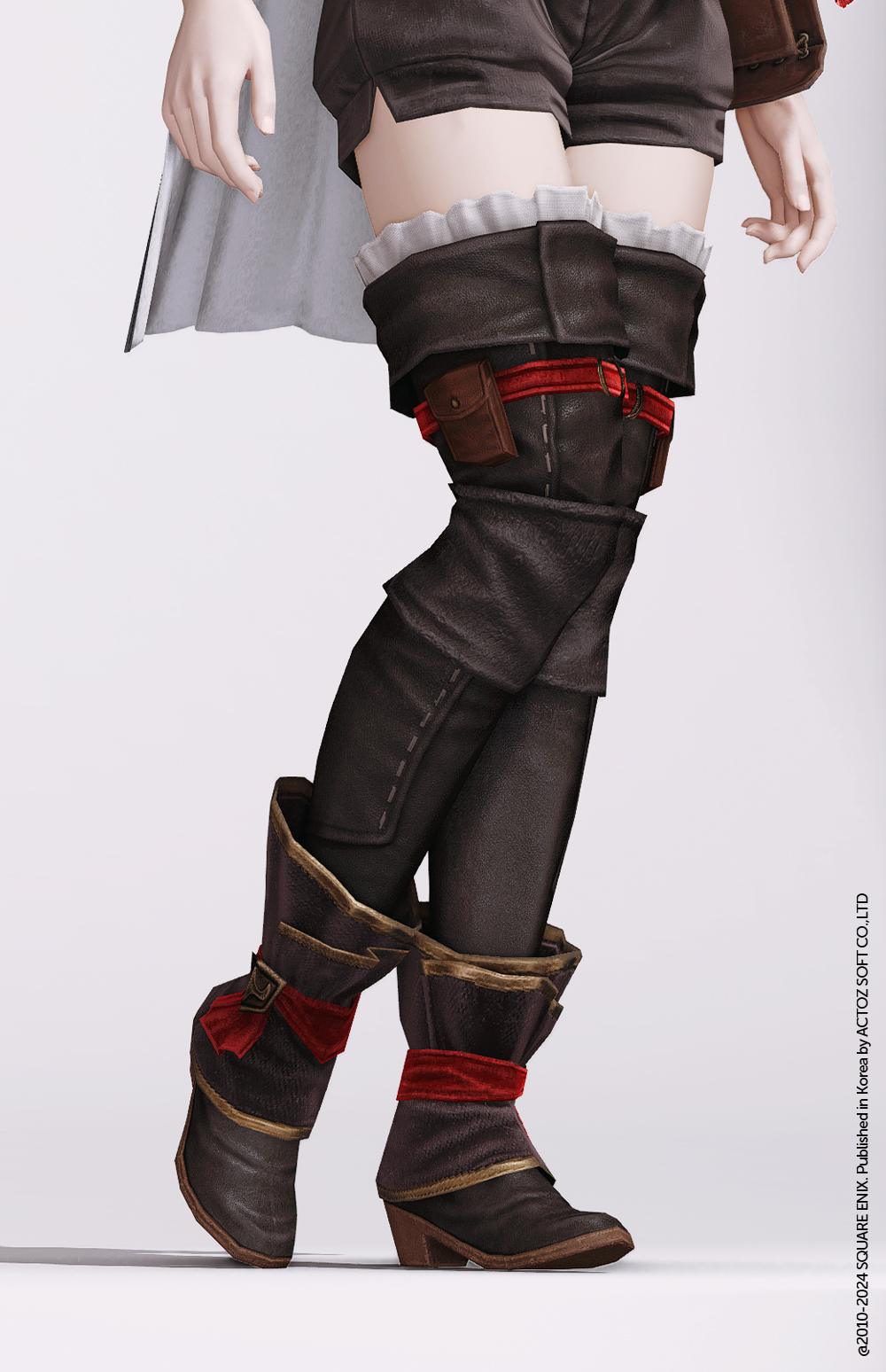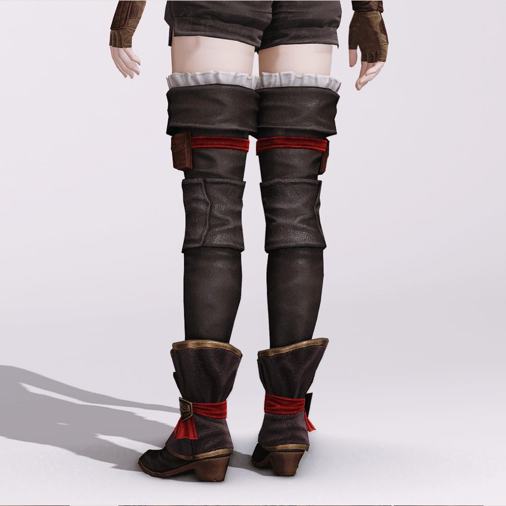 도톰하고 부드러운 가죽을 사용해 제작된 긴장화입니다. 이리저리 분주하게 이동하는 착용자의 특성상 무릎과 발목 부근에 한 번 보호대를 덧대어 관절을 탄탄히 잡아주고, 그 보호대를 그대로 장식으로 삼은 점이 좋습니다. 쉽게 벗겨지지 않도록 붉은 끈으로 발목과 허벅지 위를 한 번 매고, 큼직한 스티치나 가죽 테두리의 마감을 일부러 눈에 띄게 만들어 묻힐뻔한 디테일들을 전부 살려내는 데서 나오는 심미적인 구성이 아이덴티티.