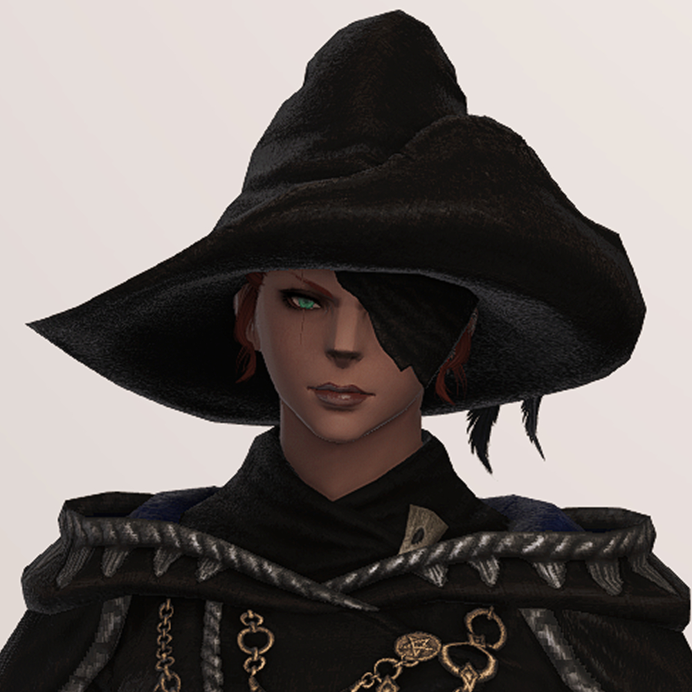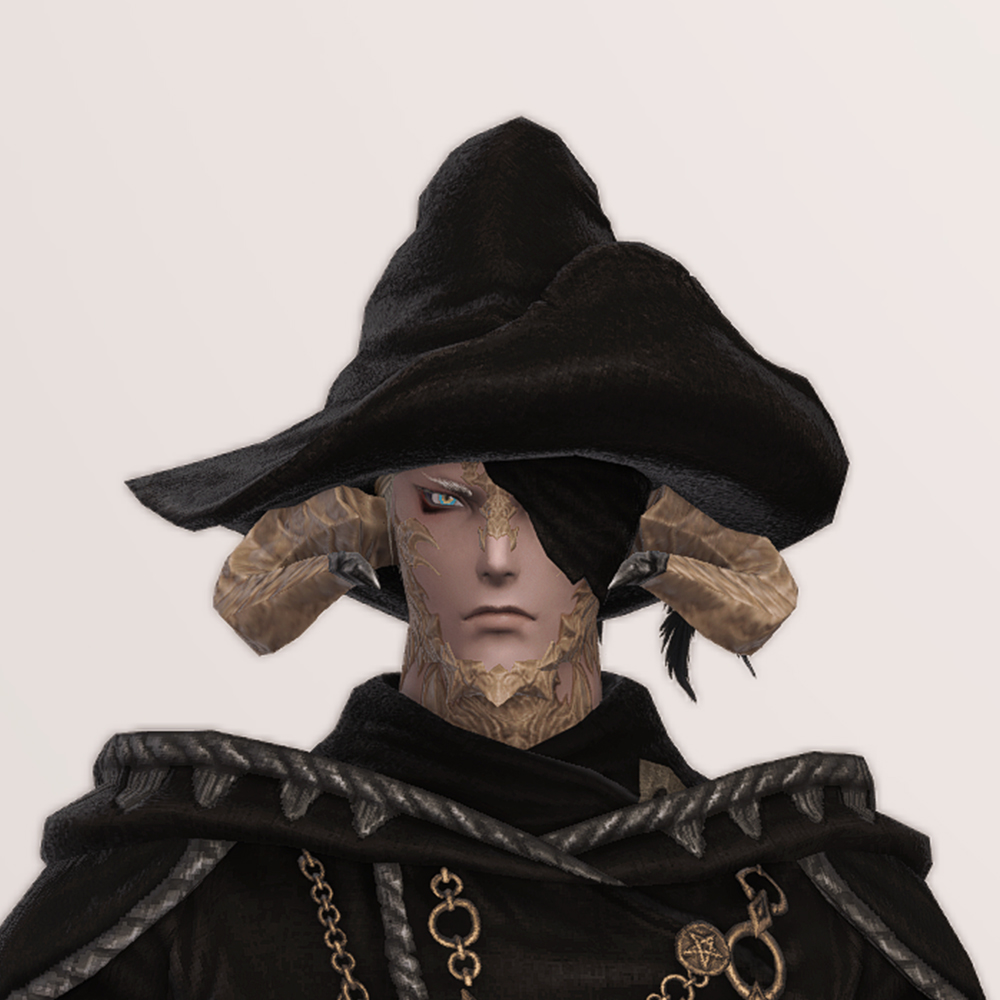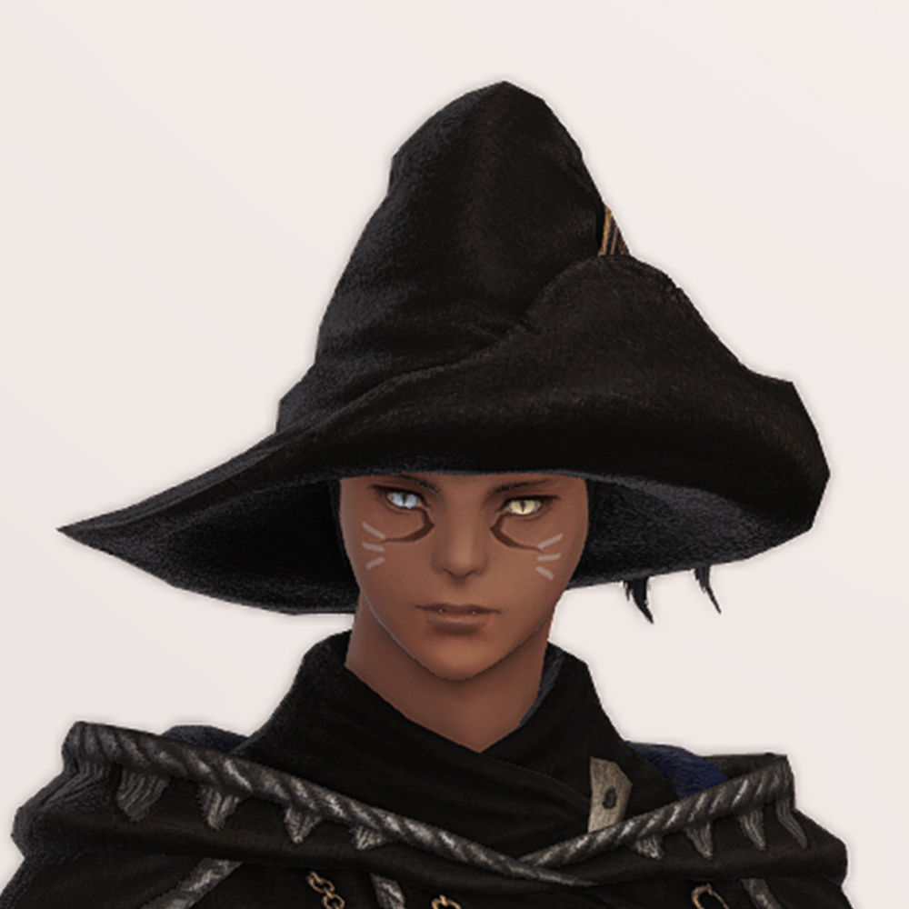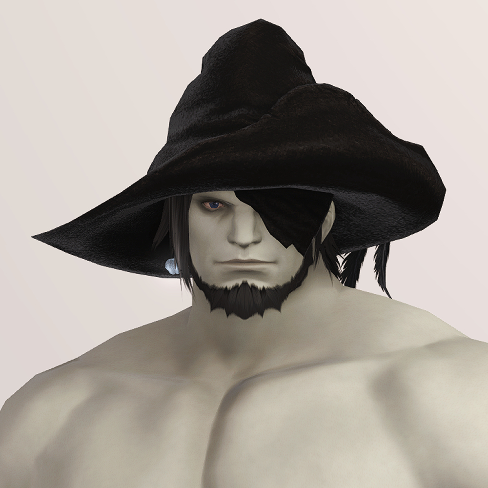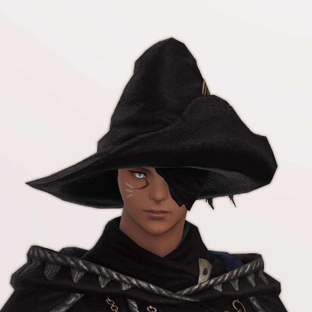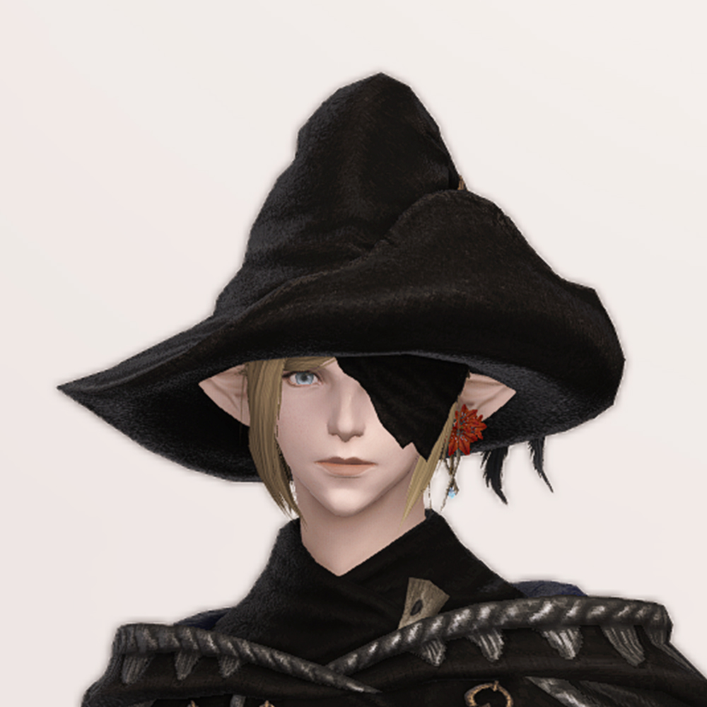 흑마하면 떠오르는 것은? 꼬깔모자와 안대입니다. 구부러진 꼬깔모자로 끝부분에 검은색 깃털 3개가 포인트로 꽂혀 있으며, 보는 사람을 기준으로 오른쪽에 안대가 달려있습니다. 내 머리 장비 조작으로 안대 유무를 설정하실 수 있습니다.