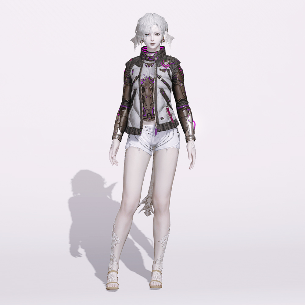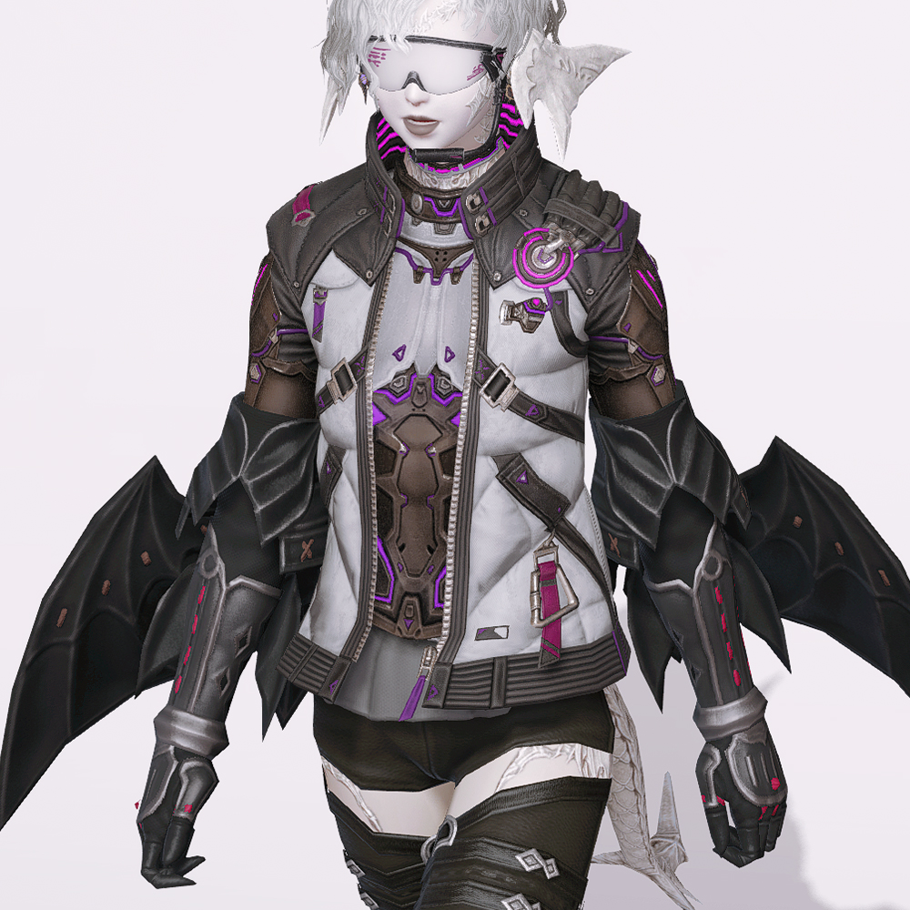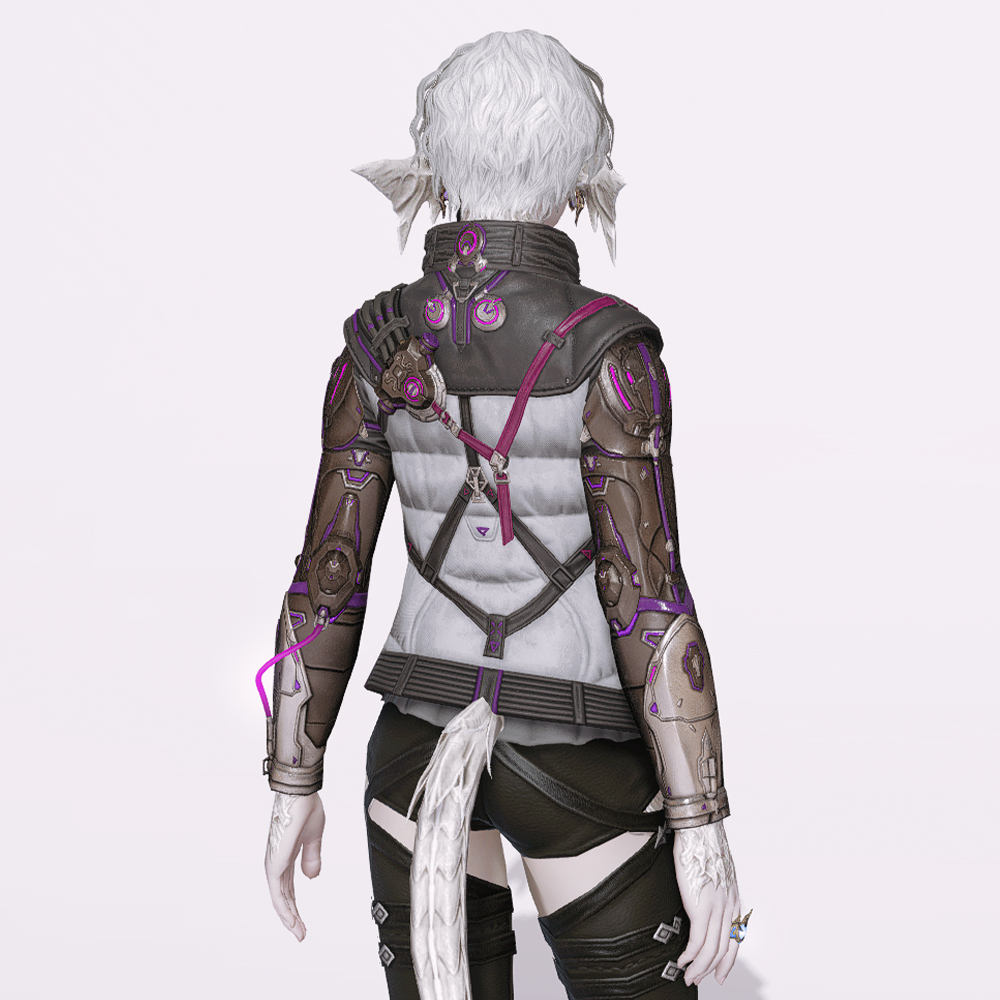 기계 의수를 연상시키는 팔 디테일이 독특한 상의입니다. 상의 이름은 조끼이지만, 실제 의상은 손목까지 오는 긴팔 상의입니다. 조끼 내부의 몸통부터 손목까지 전체적으로 자주색의 led가 도드라지는 기계 장식으로 이루어져있으며, 상체와 팔부위의 근육과 관절을 연상시키는 디테일한 장식이 돋보입니다. 섬네일 모델처럼 견고한 느낌을 자아내는 금속 건틀릿과 매치하는 것을 추천드립니다. 팔의 실루엣이 깔끔해 딱떨어지는 가죽장갑도 좋겠습니다.