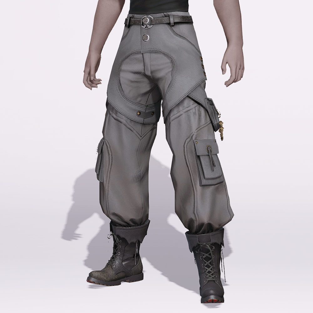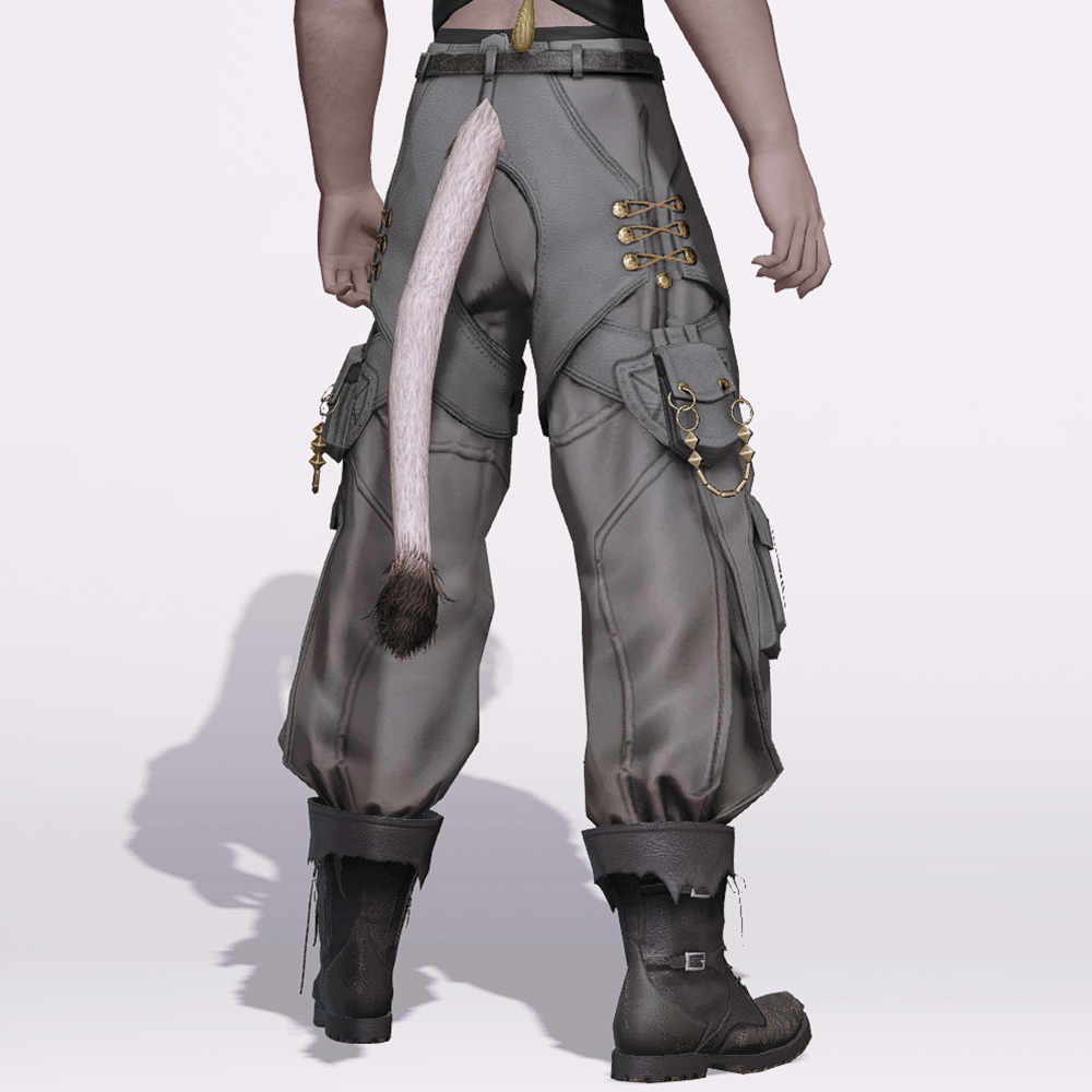 작업자의 바지라고 함은 첫째는 튼튼함, 둘째는 편안함, 셋째는 편리함을 갖춰야 하지 않을까요? 질기고 힘 있는 원단을 넉넉히 사용해 만든 헐렁한 바지입니다. 핏은 아무래도 좋고, 튼튼히 만들다 보니 원단을 이어붙인 재봉선 디테일이 꽤 진합니다. 그 위로도 얇은 가죽제 보호대를 허벅지 부근에 덧대어 허리띠로 함께 고정할 수 있게 두었습니다. 넉넉한 깊이의 주머니와 작은 가방에는 간식부터 여러 소품들을 수납할 수 있어 실용적. 기능에 충실하다고는 하지만 일부에선 금속 장식들을 사용해 포인트를 주어 굳이 작업자가 아니어도 입고다니기 좋습니다. 아무렴, 보기 좋은 떡이 먹기도 좋은 법이죠. 여러모로 묵직한 정보값이 들어간 바지다 보니, 그에 맞춰 상의를 매치하는것을 추천드립니다. 다행히도(?) 허리 선이 깔끔히 정리되는 편이라 그 부분의 고민은 덜 수 있습니다.