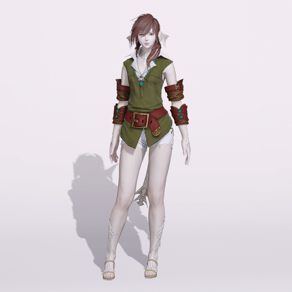 파판9의 인물 아마란트 코랄의 오마쥬 의상으로, 조끼에 시원시원하고 널찍한 카라를 달고, 큼지막한 벨트를 둘러 클래식한 느낌을 챙겼습니다. 또한 팔의 보호대를 둘러 안전도 든든하게 챙겼죠. 바이퍼 70 잡룩이 생각나실 수도 있으나 조끼라인을 캐주얼하게 뽑아 시원한 여름룩으로 매치하기 좋을 것 같습니다. 자유로운 느낌의 맵시있는 조끼 상의를 찾으신다면 이 상의를 추천드립니다.