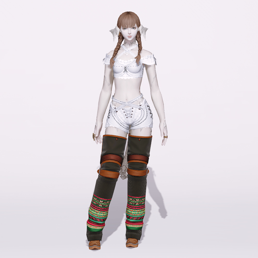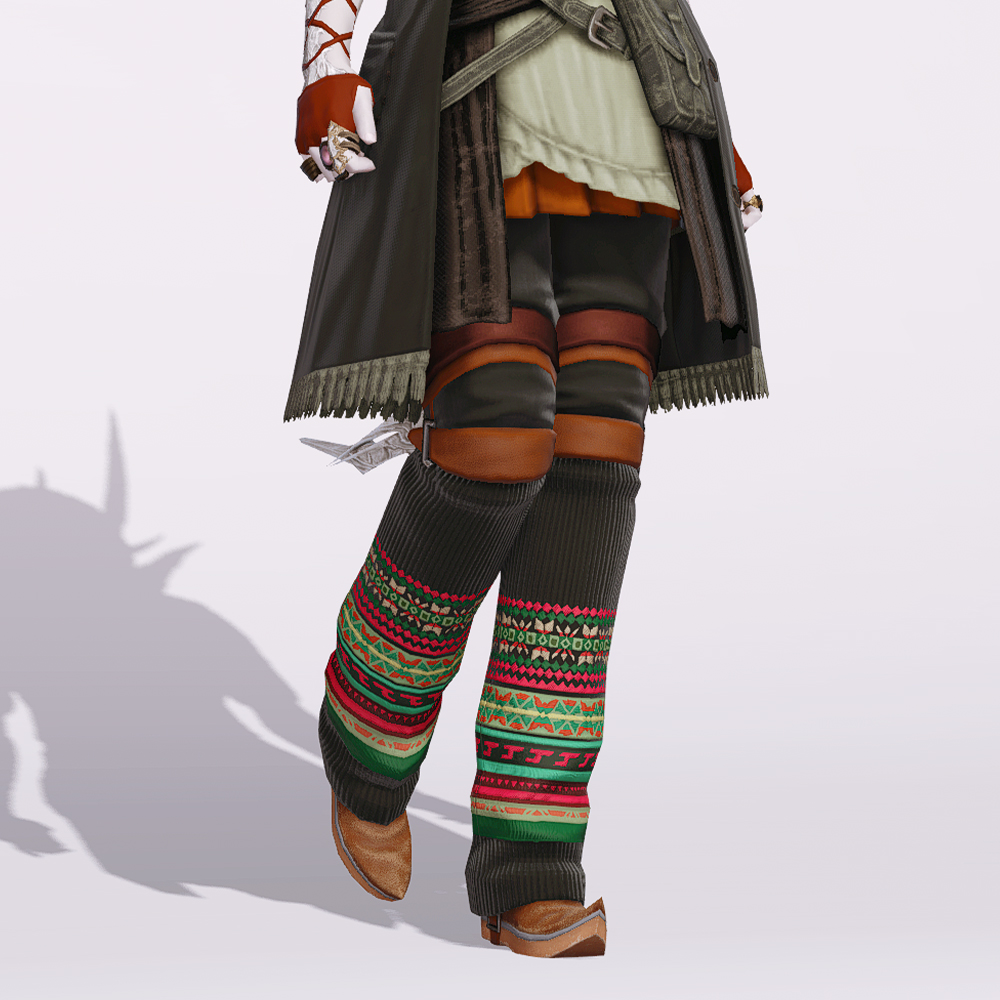 보온과 패션을 동시에 신경쓸 수 있는 고유패턴이 화려한 레그워머를 더한 허벅지 장화입니다. 어떠한 추위가와도 든든하게 막아줄 두툼한 가죽으로 만들어진 허벅지장화에 스트랩으로 고정해 활동성을 높였으며, 화려한 기하학패턴으로 개성을 더했습니다. 레그워머가 장화부분과 분리되지 않아 생각보다 조합이 어려울 수도 있겠으나 모델분처럼 학생 치마 등으로 패턴을 더하는 것도 좋은 선택이 될 수 있겠습니다.