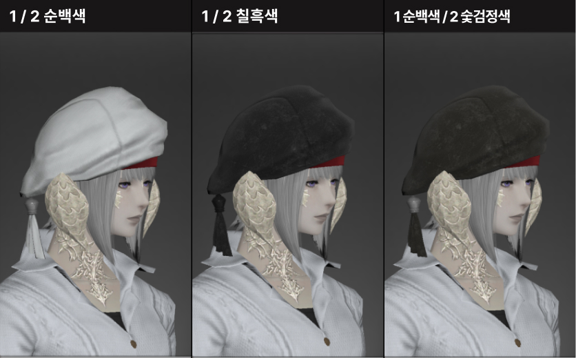 염색1 - 후면에 있는 태슬의 금속장식 / 염색2 - 모자 천(벨벳 장식은 염색되지 않습니다)