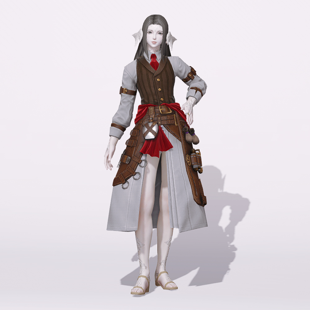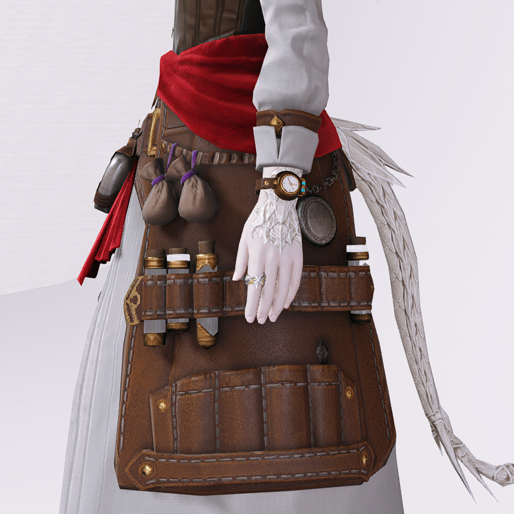 본격적인 작업복과 정장의 모양새를 두루 갖춘 작업용 외투입니다. 붉은색의 벨벳 천으로 곳곳을 장식해 포인트로 삼은 부분이 인상적입니다. 섬세한 작업을 위해 팔에 가죽 스트랩으로 고정하고, 외투 하단엔 작업에 필요한 각종 약품과 장비를 달아둘 수 있는 수납용 주머니가 빼곡합니다.