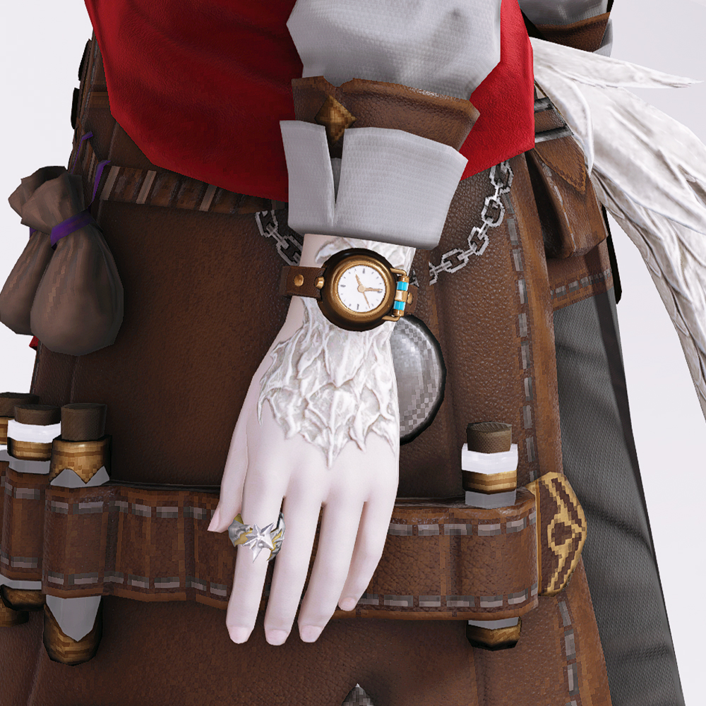 섬세한 작업에 생명인 시간을 체크하기 위한 시계와 작업용 장갑을 착용한 모습입니다. 시계에 달려있는 독특한 푸른 장식이 손목측정기라는 독특한 이름을 가진만큼 연금술사가 작업에 필요한 에테르 농도등을 측정할 수 있는 기능이라도 있는걸까요? 시계 아이템과 장갑 아이템을 동시에 착용하고 싶은 분께 적절한 장비라 생각합니다.
