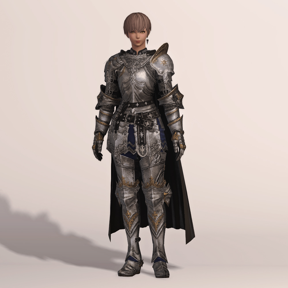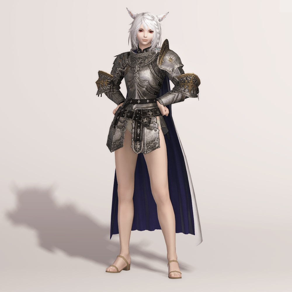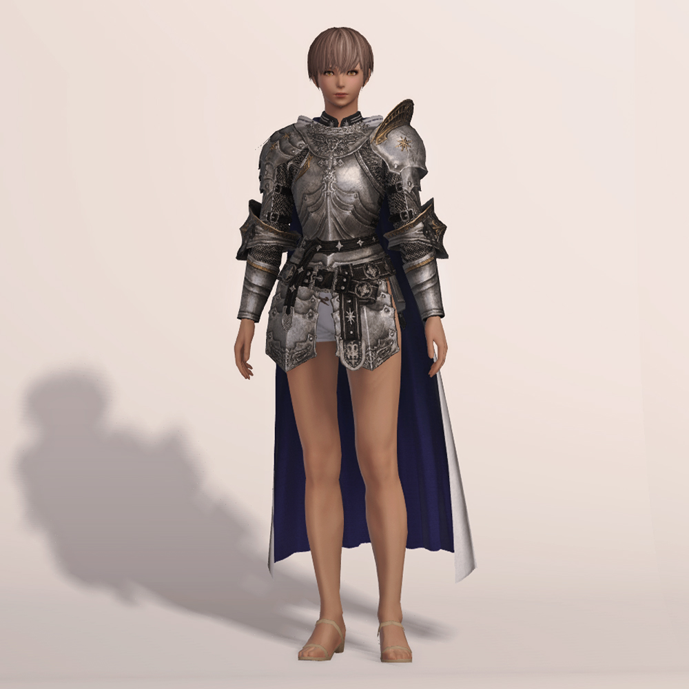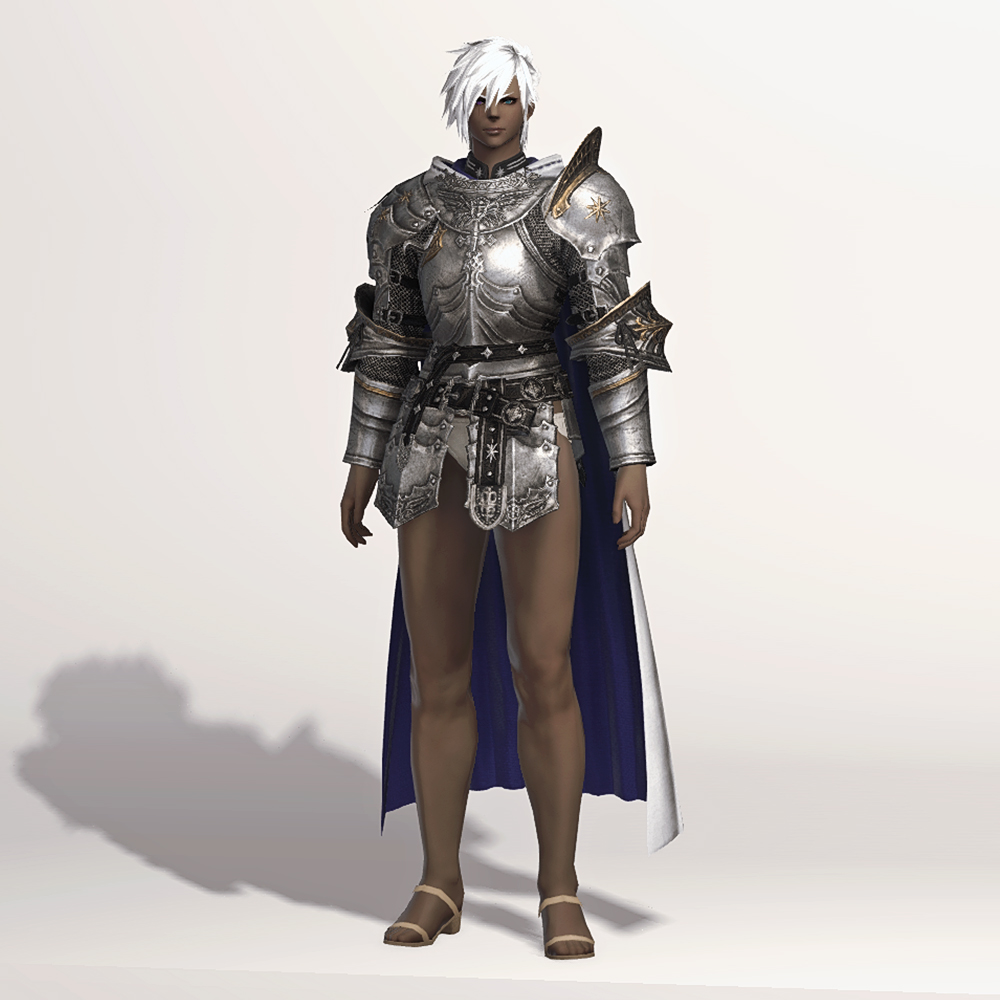갑주입니다. 빛의 전사가 시간의 흐름을 따라 여정의 끝에 도달했듯, 갑주 또한 끝내 정석적인 철판 갑옷으로 발전했습니다. 비대칭 견갑과 문장이 그려진 망토로 포인트를 주었습니다. 갑옷에 왜 저리 긴 망토를 달았는지, 흉갑은 왜 겨드랑이를 보호하지 못하는지, 벨트는 왜 두 개씩이나 찼는지 따위는 묻지 마세요. 중무장한 기사 앞에서 어리석은 질문을 던지지 않는 것이 지혜이고, 우리는 충분히 현명한 사람들이니까. -모래늪에서 큰뿔 염소 스테이크 정식을 먹던 기사-