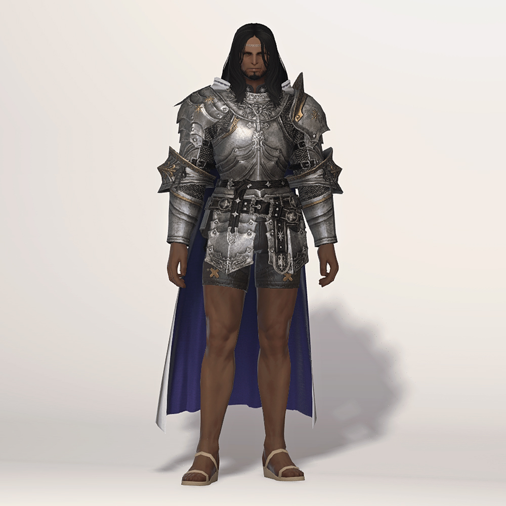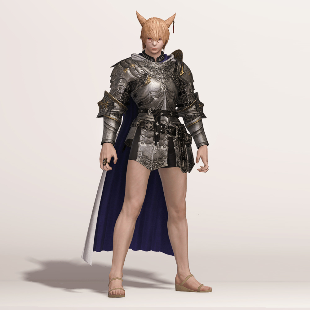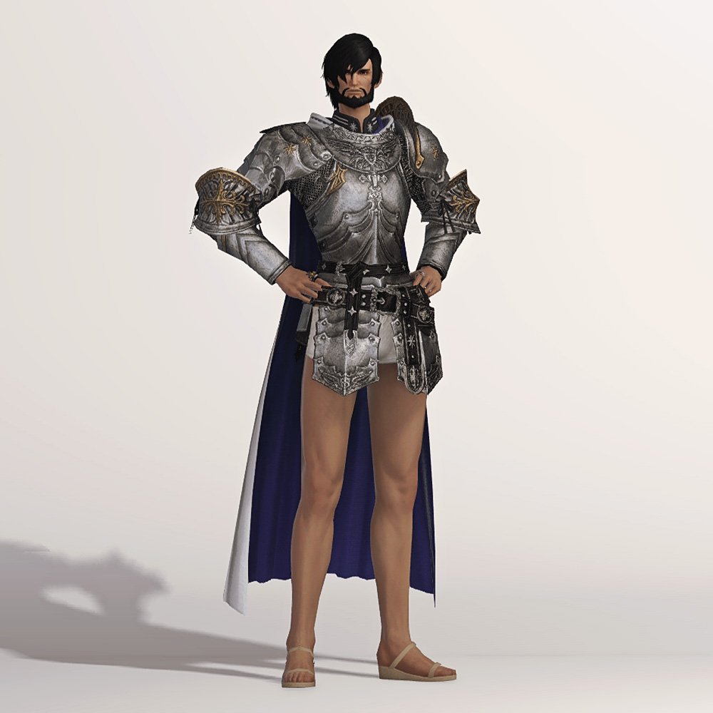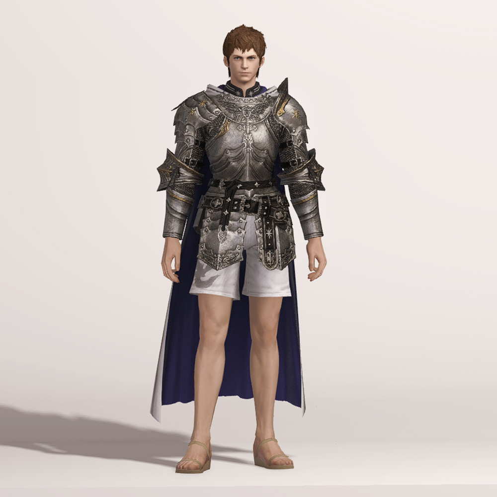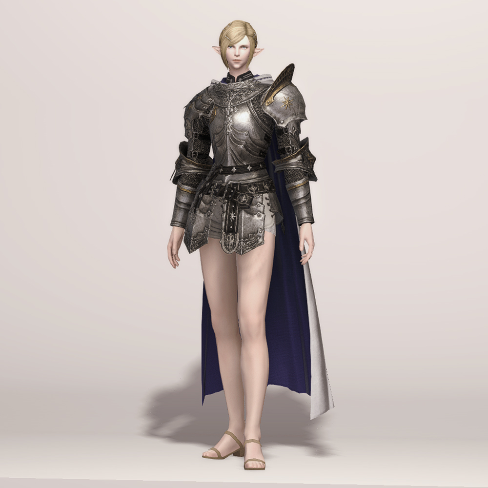 갑주입니다. 빛의 전사가 시간의 흐름을 따라 여정의 끝에 도달했듯, 갑주 또한 끝내 정석적인 철판 갑옷으로 발전했습니다. 비대칭 견갑과 문장이 그려진 망토로 포인트를 주었습니다. 갑옷에 왜 저리 긴 망토를 달았는지, 흉갑은 왜 겨드랑이를 보호하지 못하는지, 벨트는 왜 두 개씩이나 찼는지 따위는 묻지 마세요. 중무장한 기사 앞에서 어리석은 질문을 던지지 않는 것이 지혜이고, 우리는 충분히 현명한 사람들이니까. -모래늪에서 큰뿔 염소 스테이크 정식을 먹던 기사-