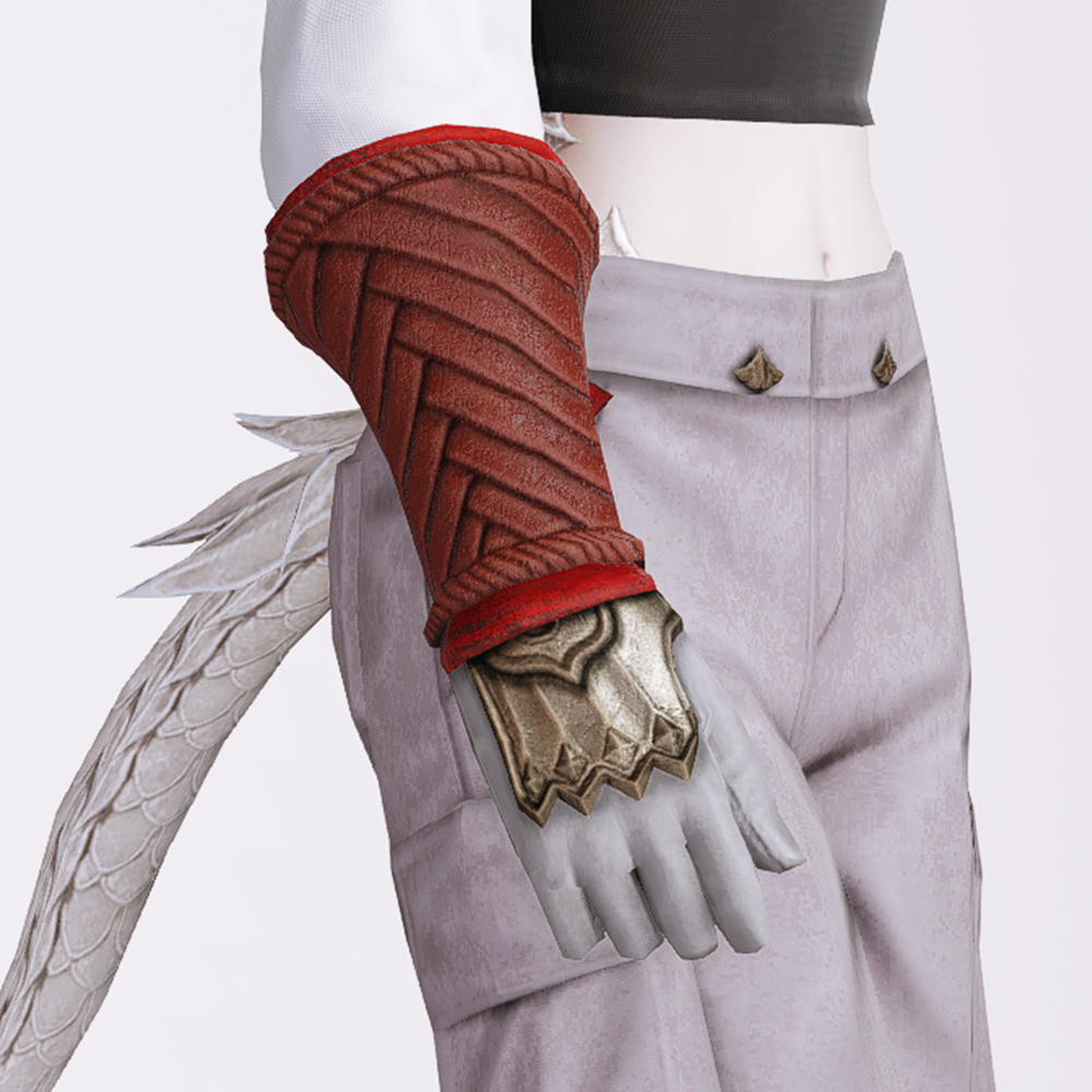 작은 관절부의 부품부터 큼직한 몸통부의 금속판까지 다루는 갑주제작사의 작업 장갑입니다. 열과 무게로 작업하는 특성 상, 그만큼 부상의 위험이 높은 장인의 무엇보다 중요한 팔을 지키는 데 집중되어 있습니다. 부드러우나 두께감 있는 가죽으로 손 부분을 만들고, 그 위로 손목 보호금속대와 가죽을 엮은 보호대를 이용해 전완과 손을 보호함과 동시에 장인이 힘을 쓰는 데 지지대가 될 수 있도록 신경 쓴 것이 특징적. 엮인 가죽의 모양새가 시선이 집중되기 쉬우므로 타 의상에 매치할 때 이러한 점을 신경쓴다면 의도대로 표현할 수 있을 것 같습니다.
