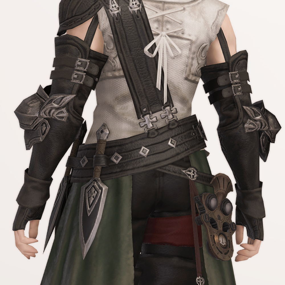 새벽의 현인 산크레드가 창천의 이슈가르드에서 선보인 팔보호구입니다. 섬세하게 치명타 한 방을 날리기 좋은 반장갑과, 팔뚝까지 올라오는 가죽제 보호대를 두 개의 벨트로 단단히 여몄습니다. 팔꿈치에는 금속제 보호대를 달아 적의 공격을 쳐내는 것 뿐만 아니라 유사 시 묵직한 한 방을 먹여주기 용이합니다. 비슷한 전투스타일을 가진 모험가라면 한 번 이용해보셔도 좋지 않을까요?