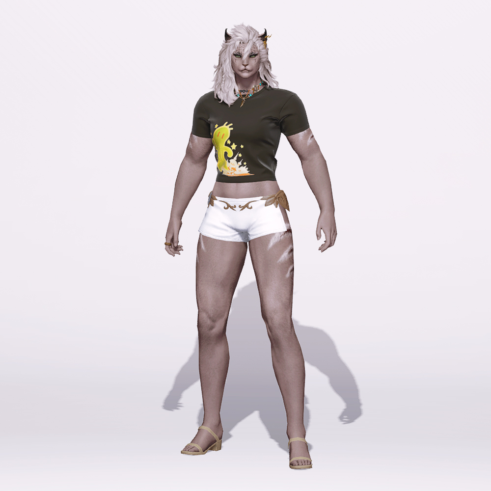 개성넘치는 프린팅이 그려져있는 타이트한 크롭 티셔츠입니다. 이름그대로 현실세계의 티셔츠 핏을 구현한 점에서 매력적인 상의입니다. 전체적으로 여유없이 붙는 느낌이나 활동적인 동작커버를 위해 여분의 주름이 만들어져있습니다.