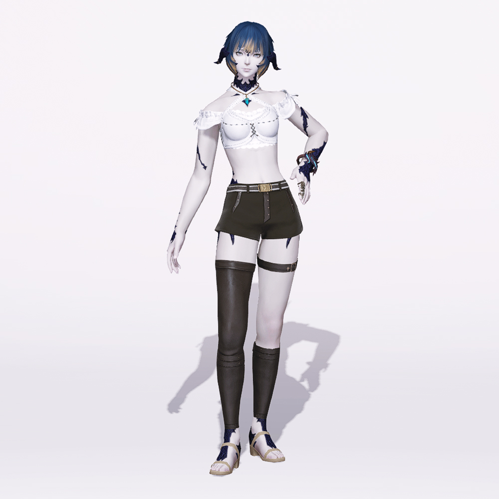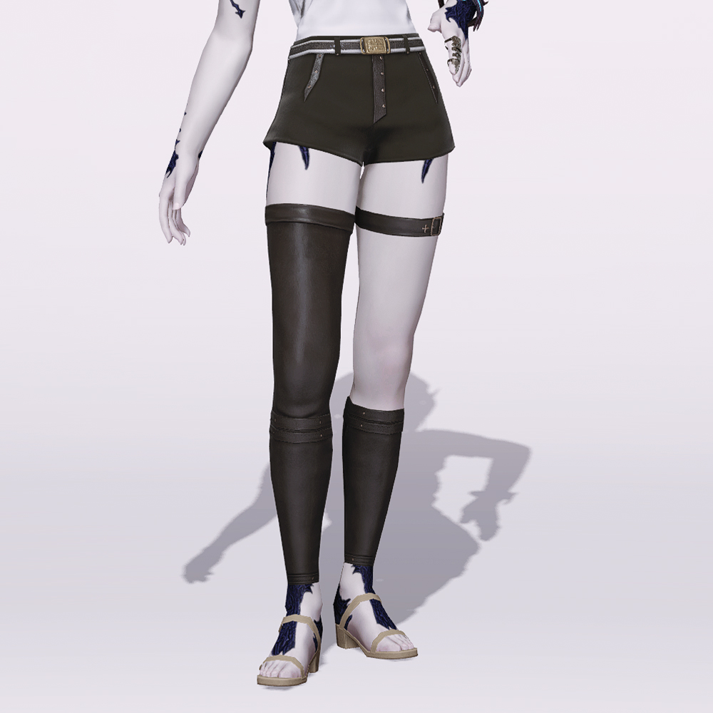 파판14에서 가장 레어하다고 볼 수 있는 전직업 착용가능 언발란스 바지입니다. 깔끔한 숏츠 하의에 어두운 회색으로 줄무늬 장식을 넣은 캐주얼한 벨트를 더해 시원하게 뺐습니다. 또한 언발란스 타이츠에 벨트 마감을 더해 바지하나만으로도 매력적인 코디로 만들어줄 알짜 아이템이라고 볼 수 있겠습니다. 남성은 긴바지로 연출되는 부분이 정말 매우 많이 아쉽습니다.