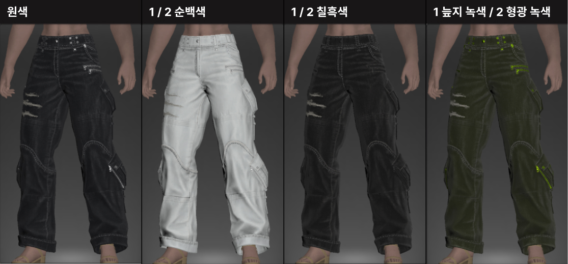 1염색 - 전체적인 바지 염색 / 2염색 - 단추, 지퍼등 장식염색