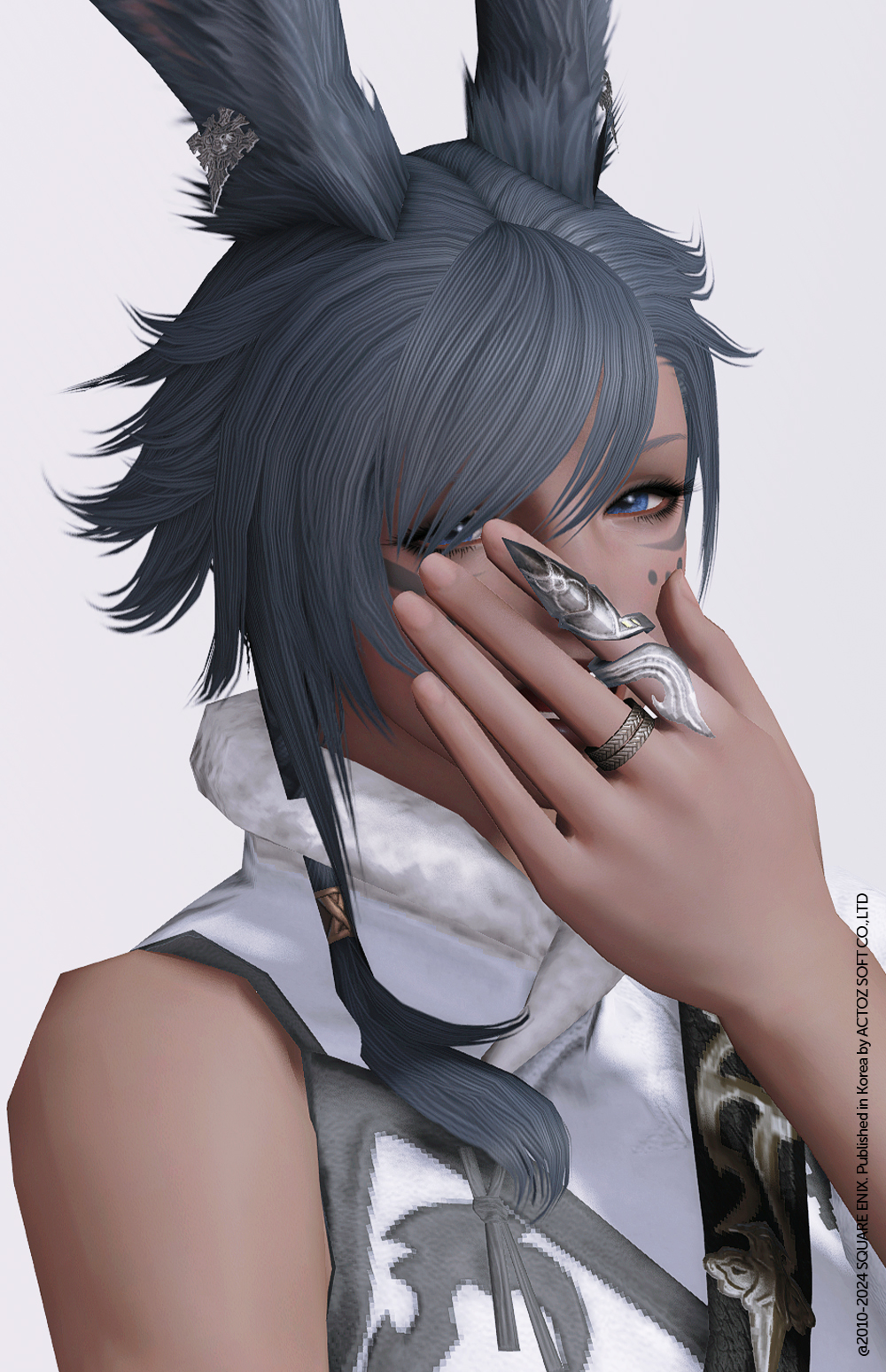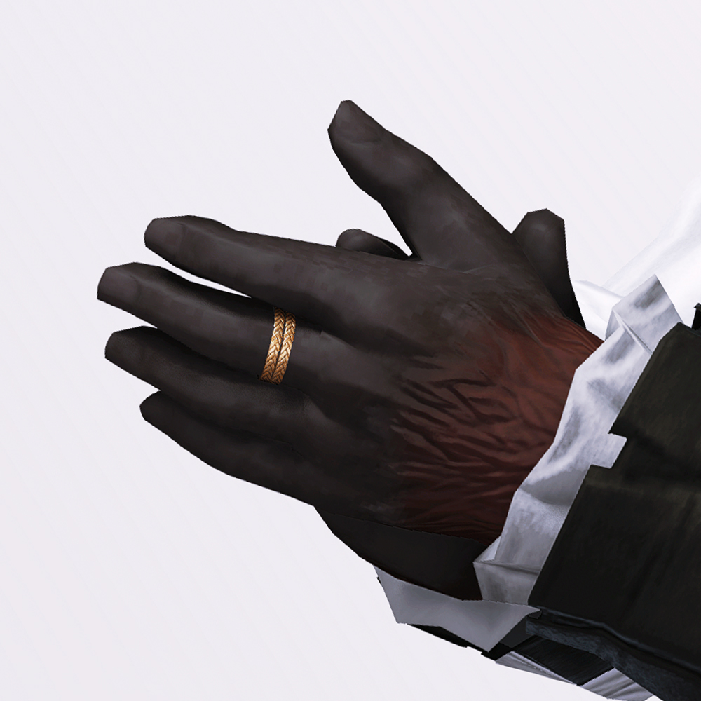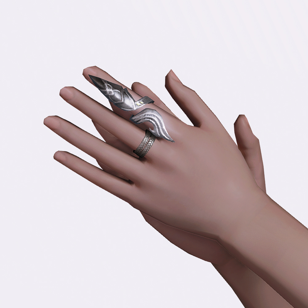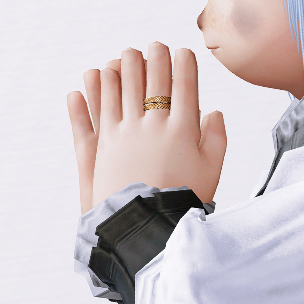 파판11의 NPC 프릿슈의 오마쥬 의상세트입니다. 심플한 밧줄패턴의 2줄짜리 반지로, 왼손 중지에만 착용됩니다. 다른 악세에 비해서 굉장히 섬세한 디테일의 반지입니다. 왼손 반지 악세와 같이 착용가능해 반지레이어드 룩을 연출하는 것도 좋겠습니다.