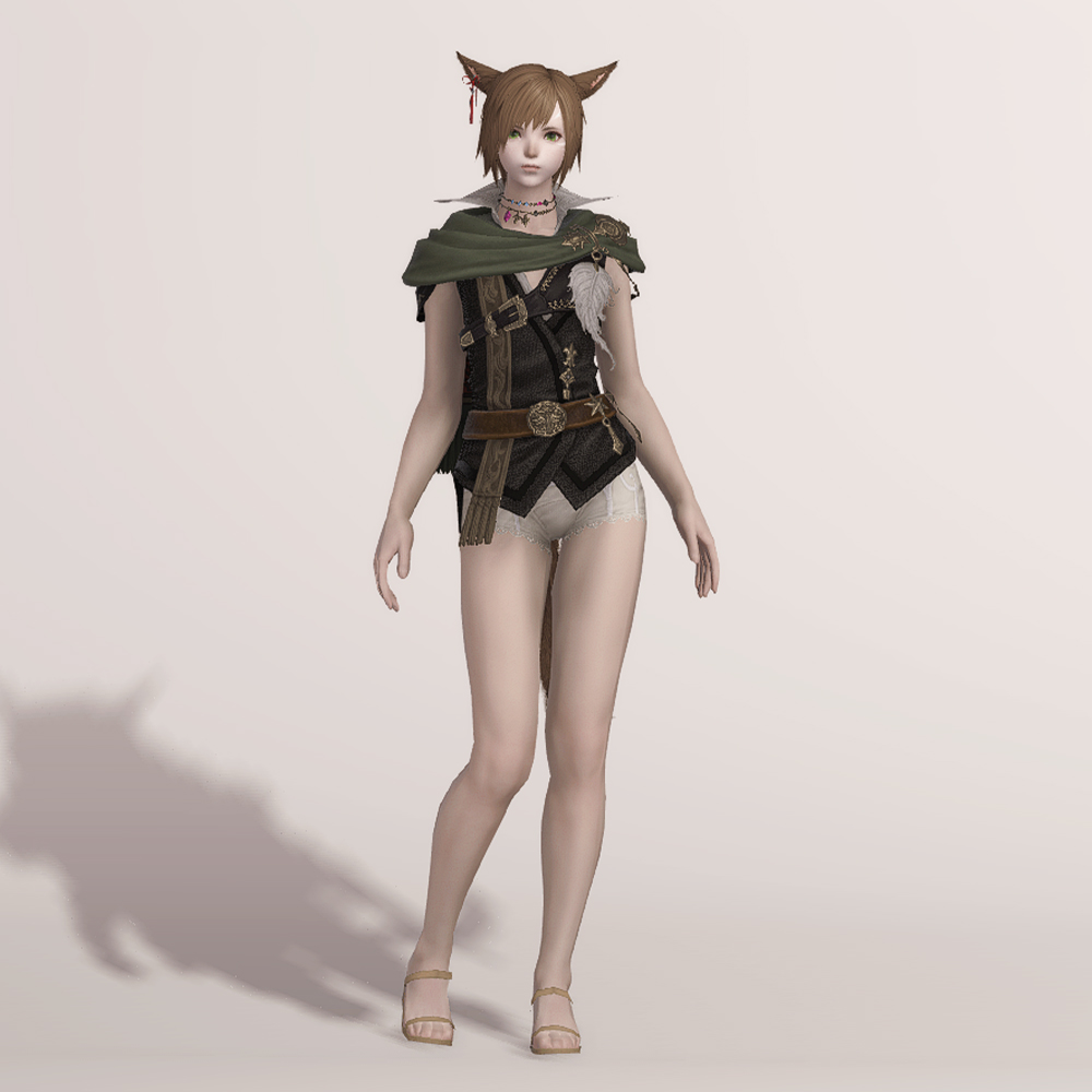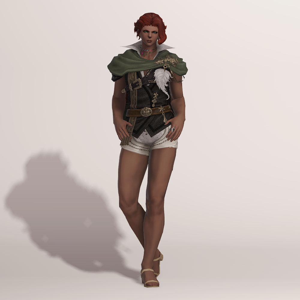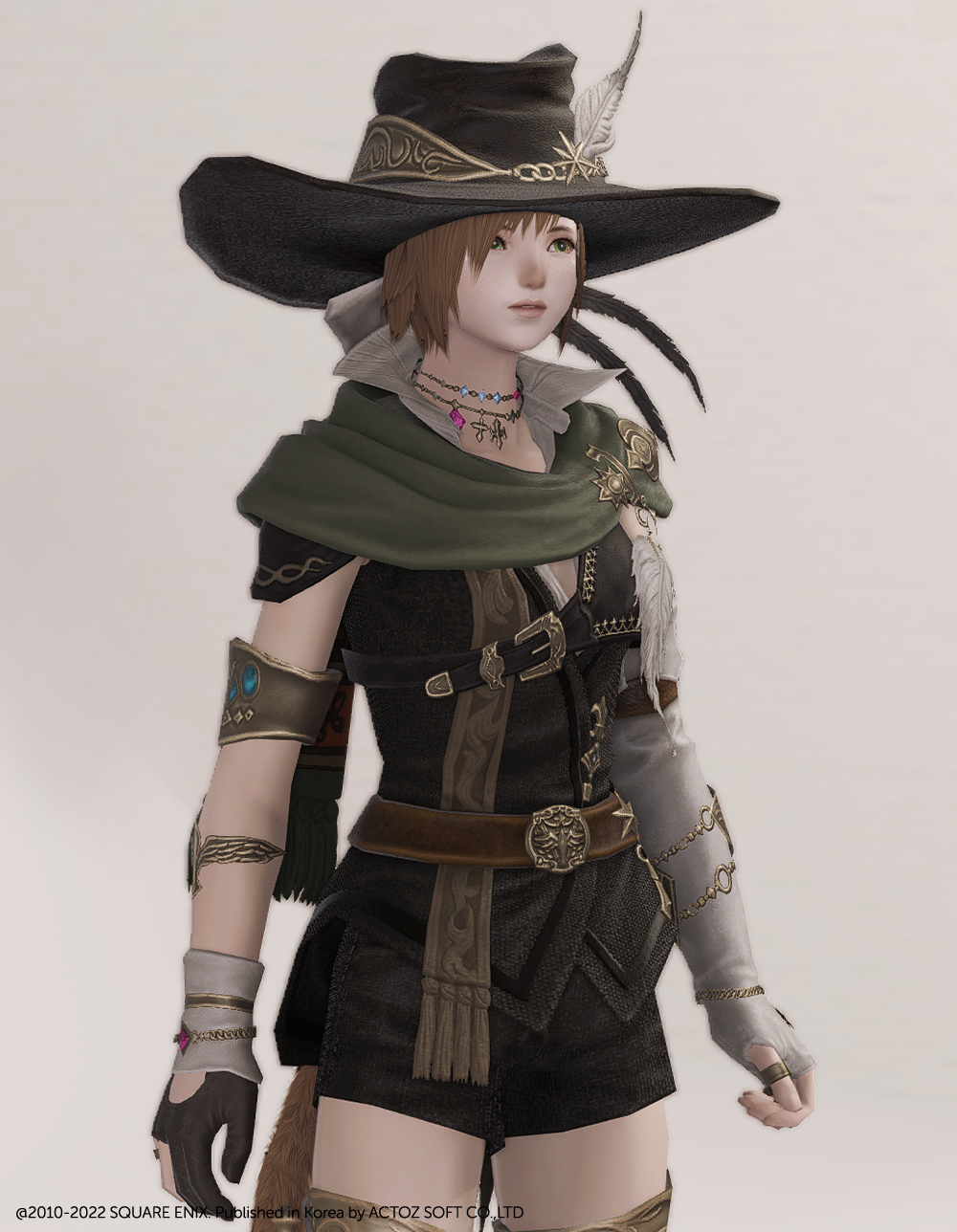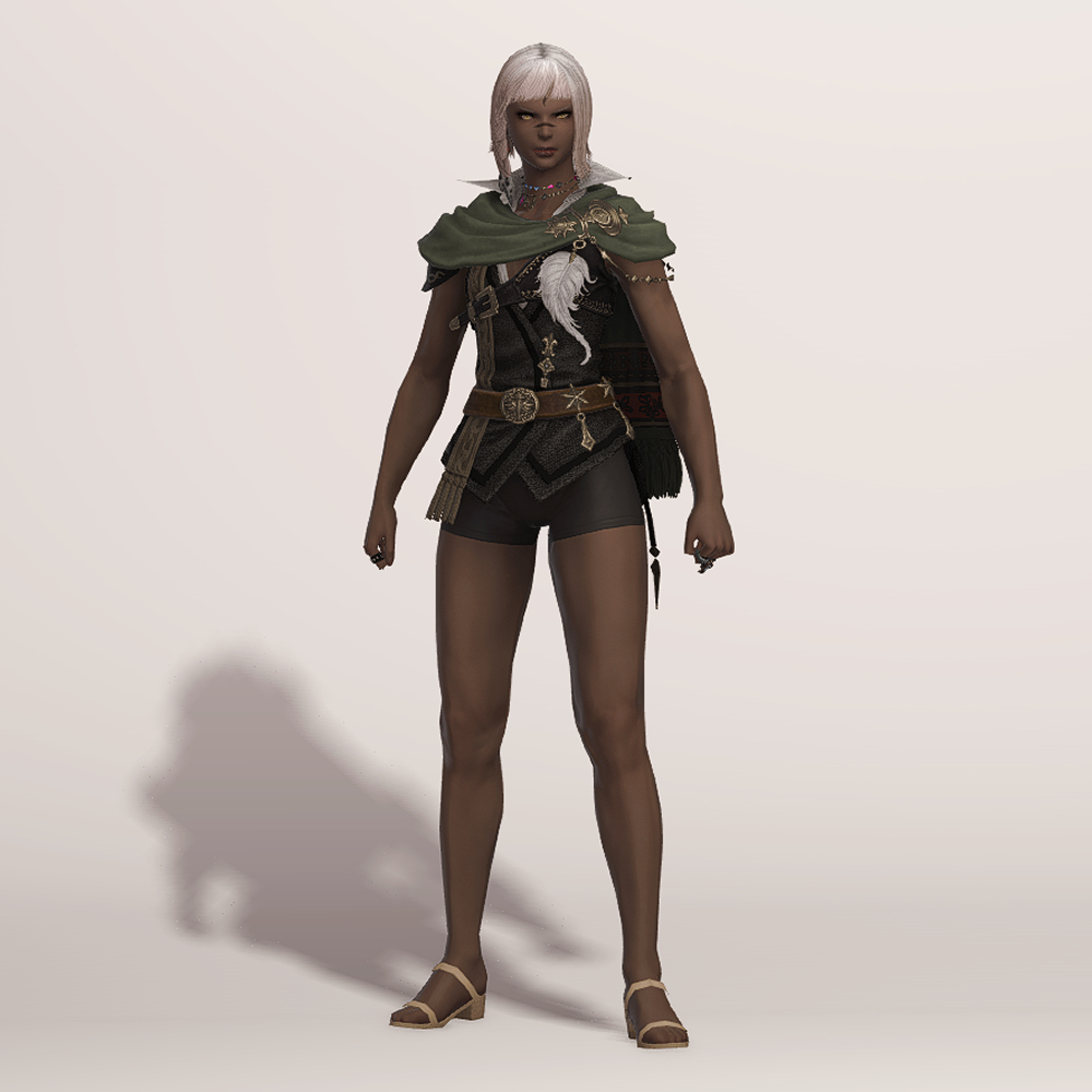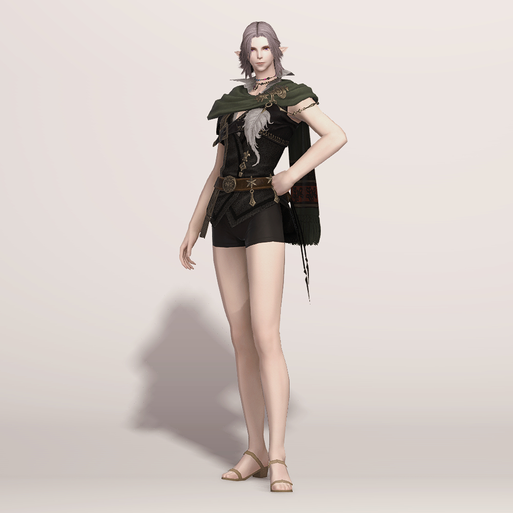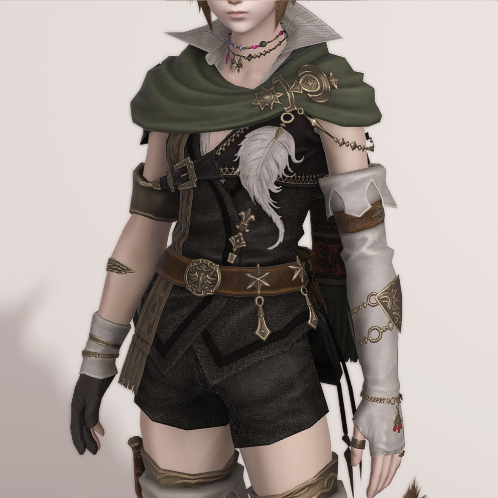 밋밋할 수도 있는 조끼에 금속과 벨트로 포인트를 줬으며, 케이프 머플러의 조합으로 방랑자스러움을 잘 나타낸 음유시인 상의입니다. 오밀조밀한 목걸이와 커다란 깃털은 자칫 옷 전체의 외관을 망칠 수도 있으나 특유의 디자인 덕분에 오히려 귀여운 매력 포인트가 되었습니다.