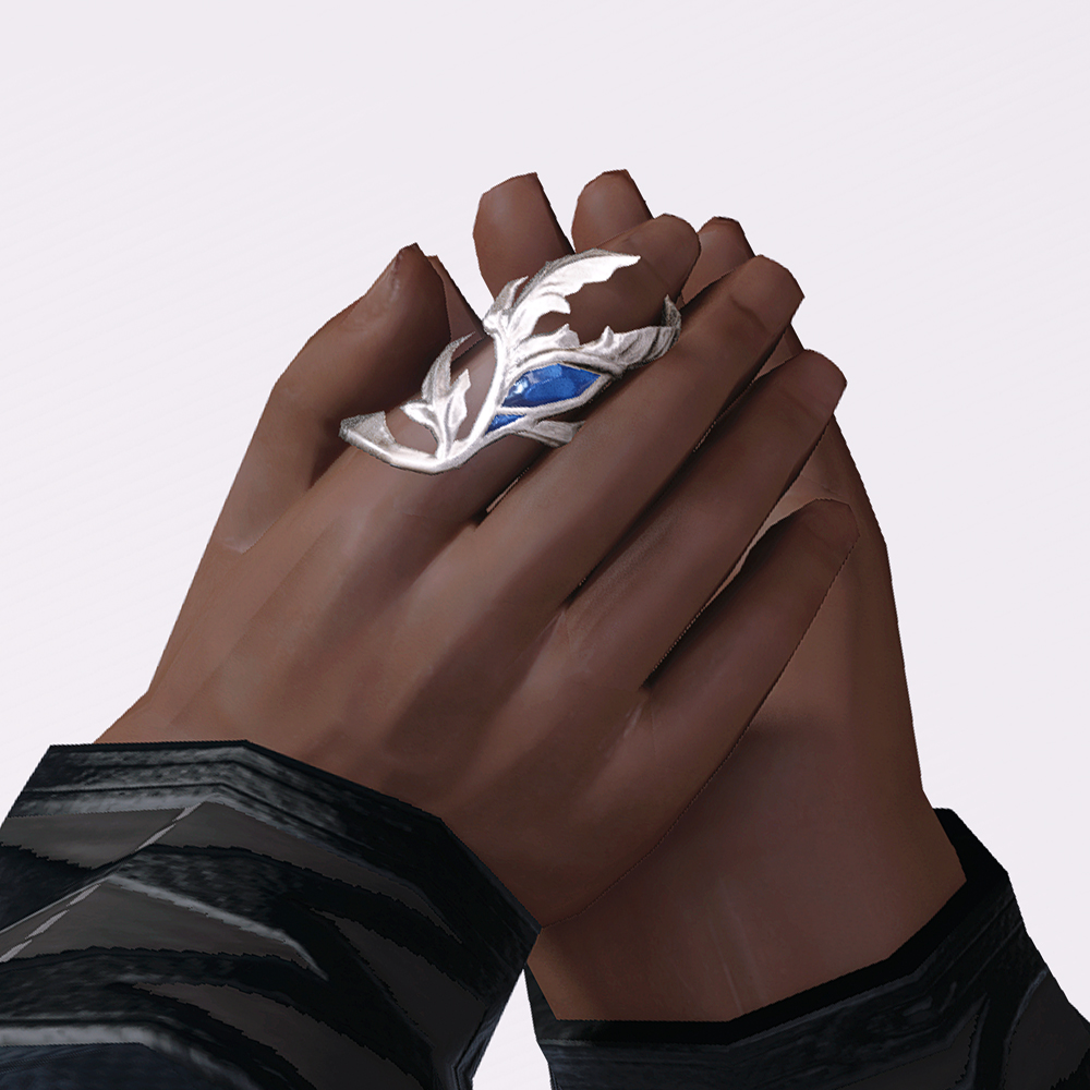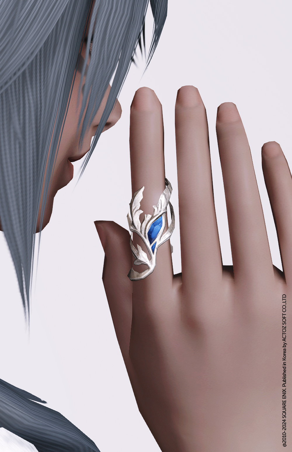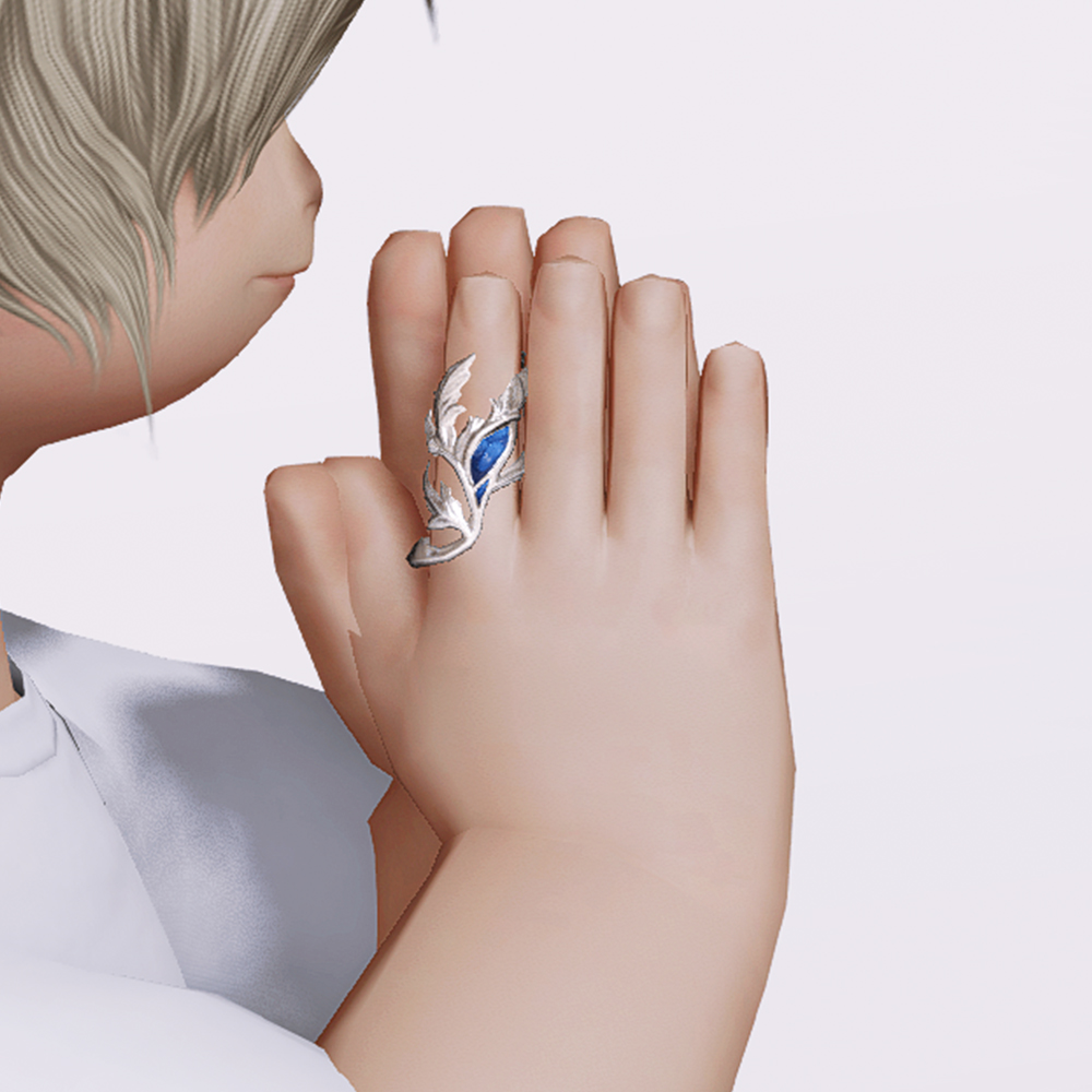 마디 하나를 다 덮을 큼지막한 크기의 잎사귀를 형상화한 보태니컬 느낌의 고급스러운 은색 장신구. 중앙에 청아한 파랑색의 보석을 더해 신비로운 느낌을 더했습니다.
