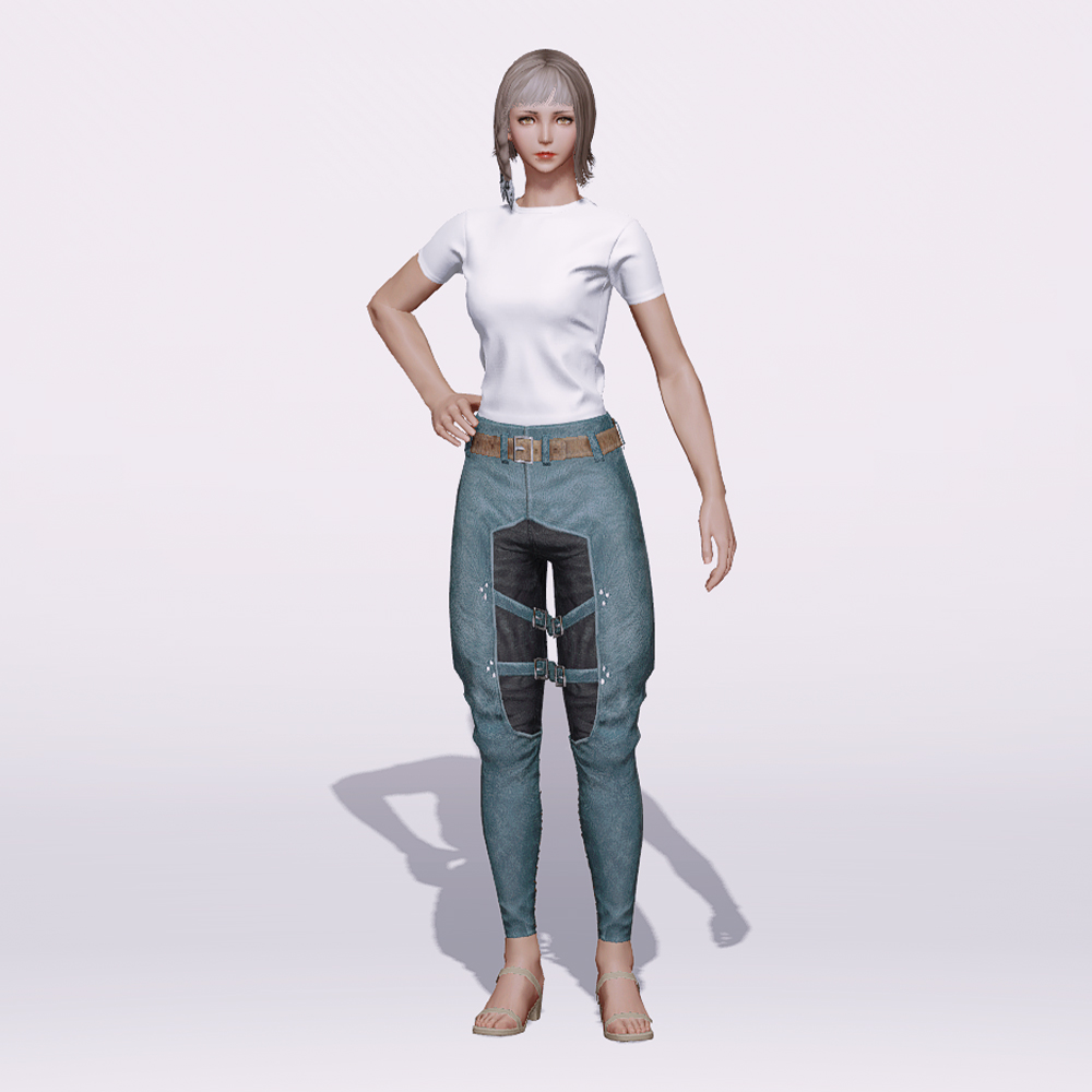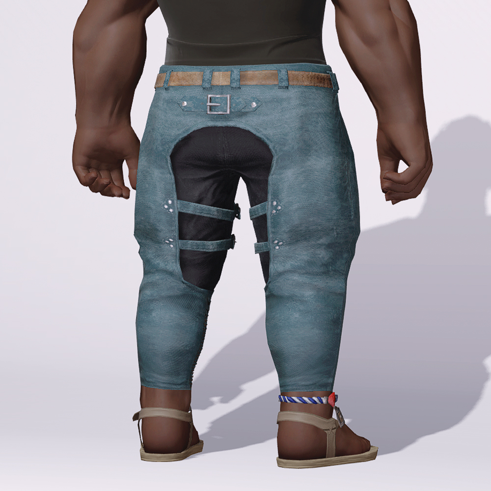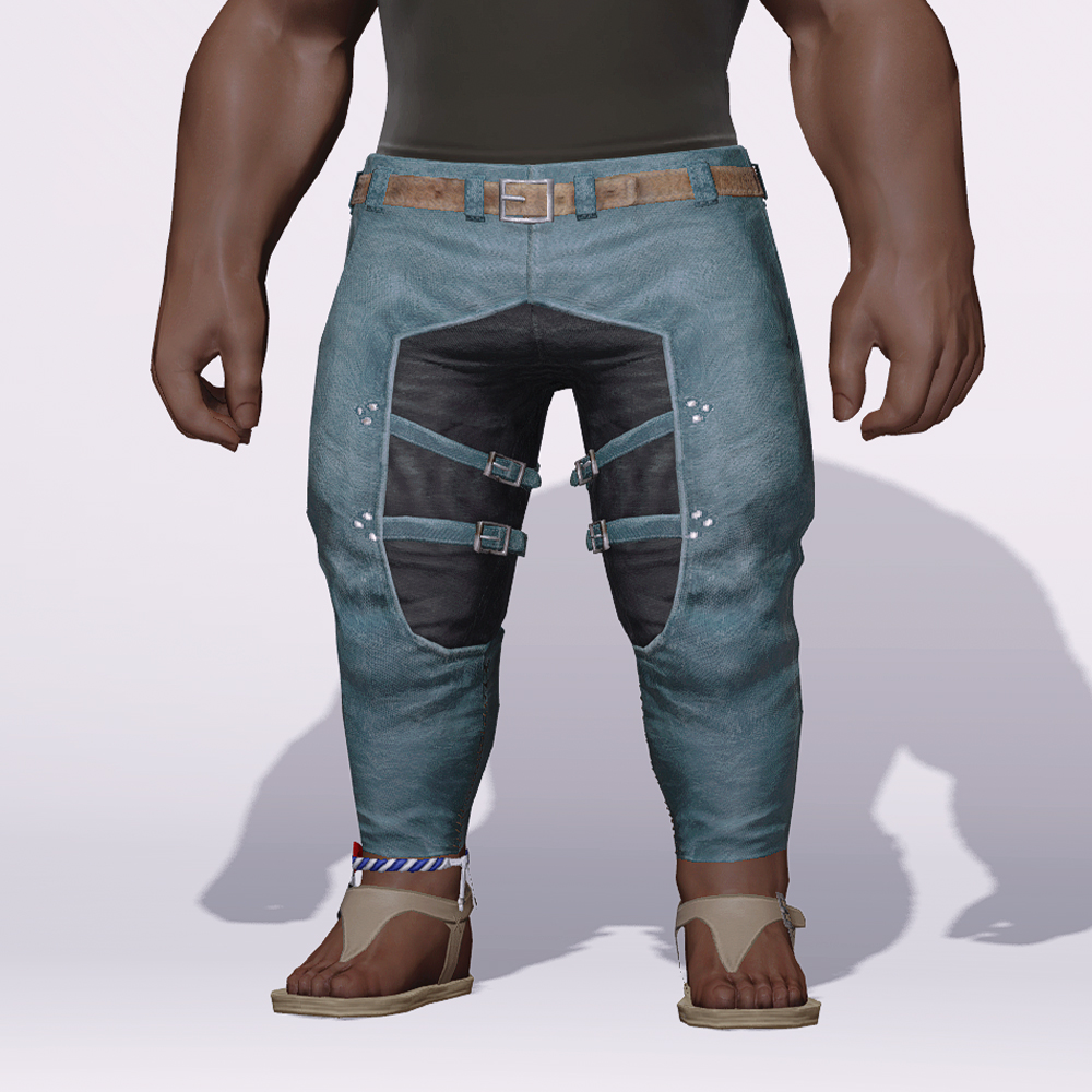 허벅지를 두꺼운 벨트로 고정해 든든한 바지입니다. 바지의 안쪽과 외부 염색을 다르게할 수 있어 허벅지 부분 코디에 용이하게 사용할 수 있겠습니다.