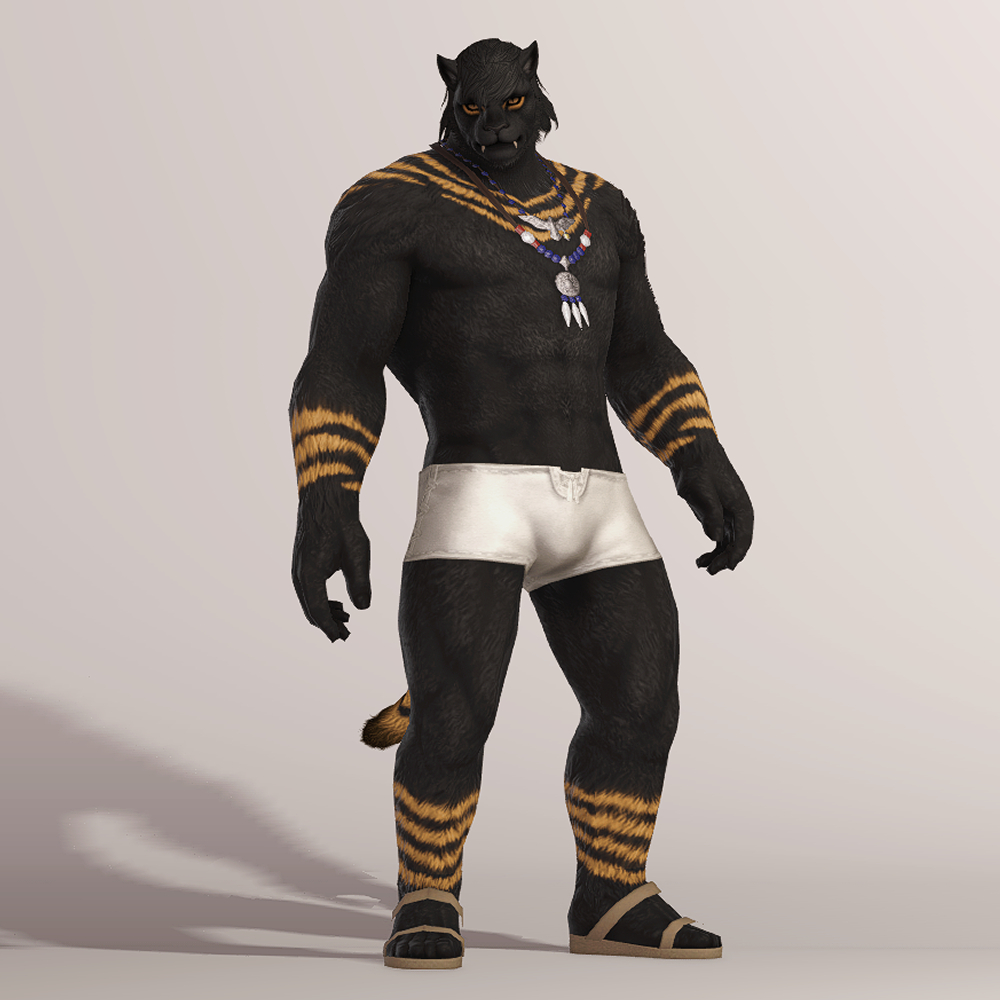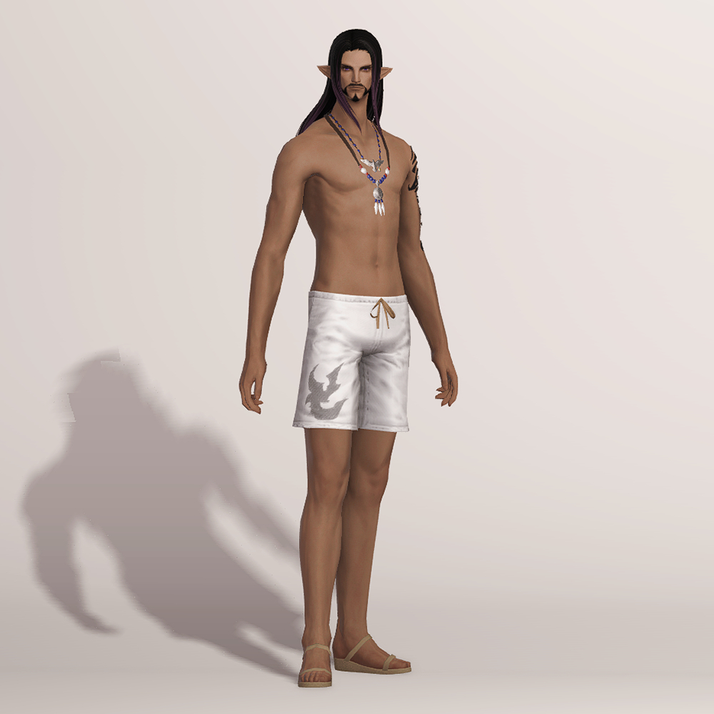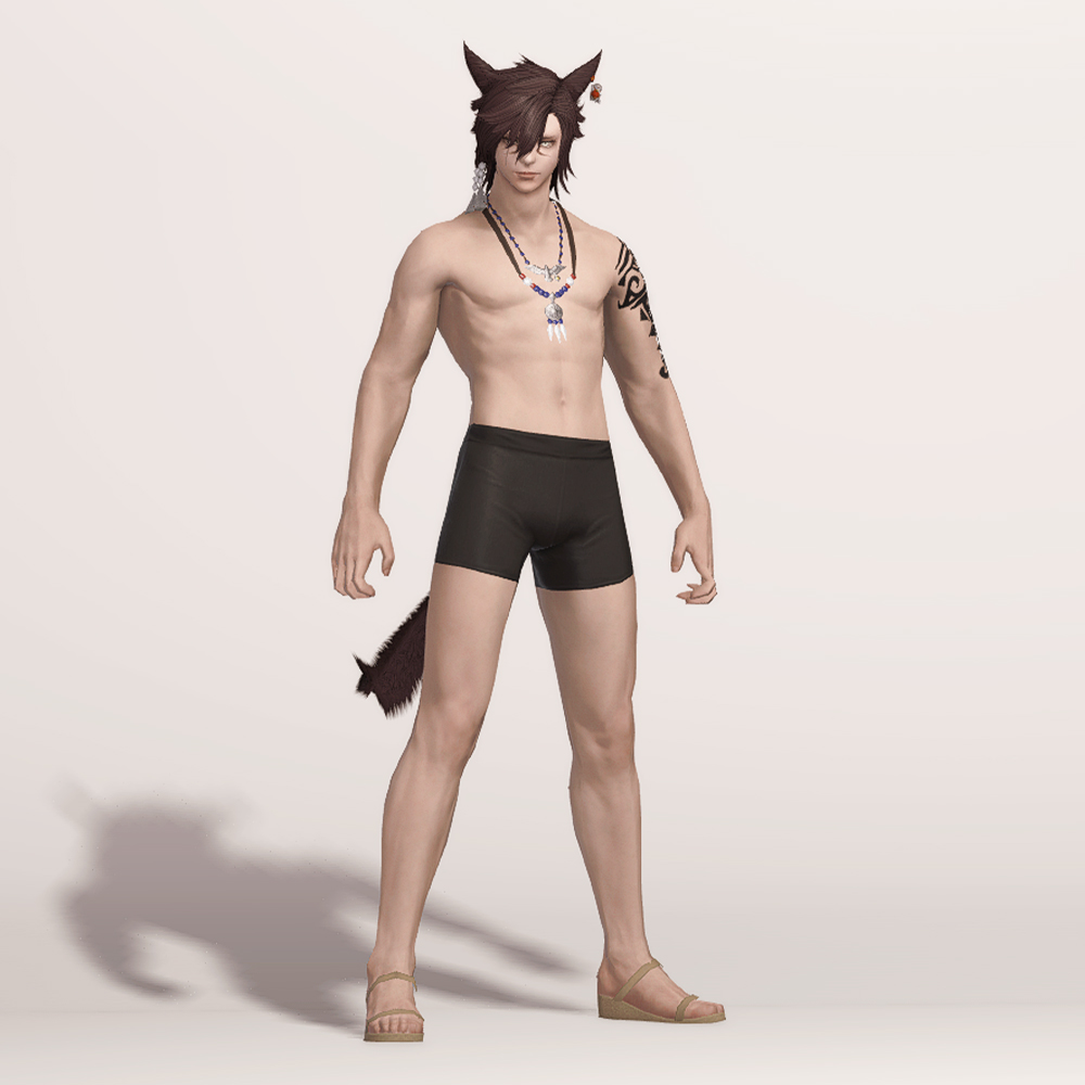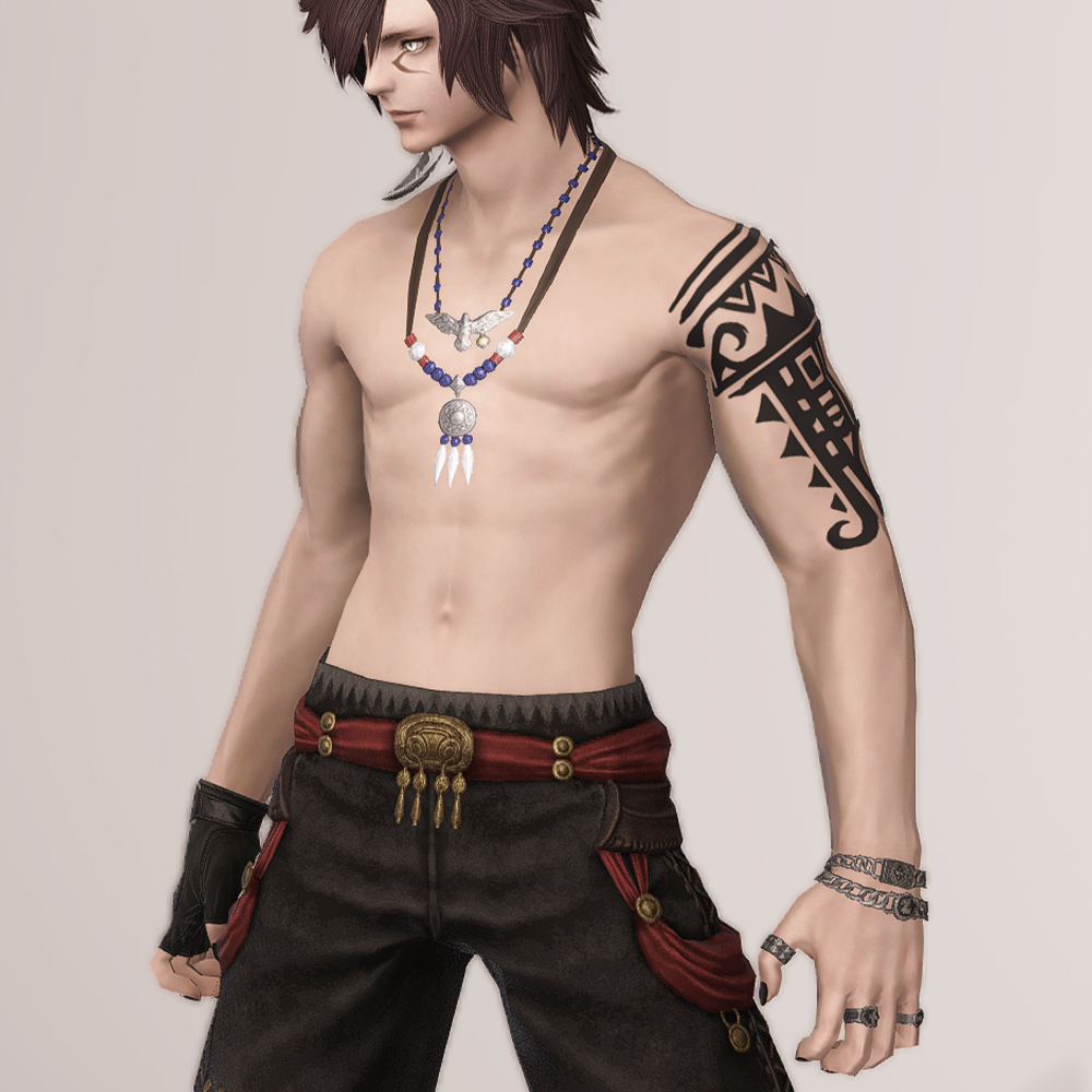 주술구라고 적혀 있어서 흑마스러운 아이템이라고 생각하면 오산입니다. 여름 해변가에서 입기 딱 좋은 아이템으로 보는 사람을 기준으로 오른쪽 팔뚝에 화려한 검은 문신이 새겨져 있으며, 남쪽 바다의 색을 담은 것 같은 푸른 구슬 목걸이를 하고 있습니다. 수영복 대용으로도 좋고, 자르노트 고원의 마수왕 라이언처럼 코디해 입는 것도 좋습니다.