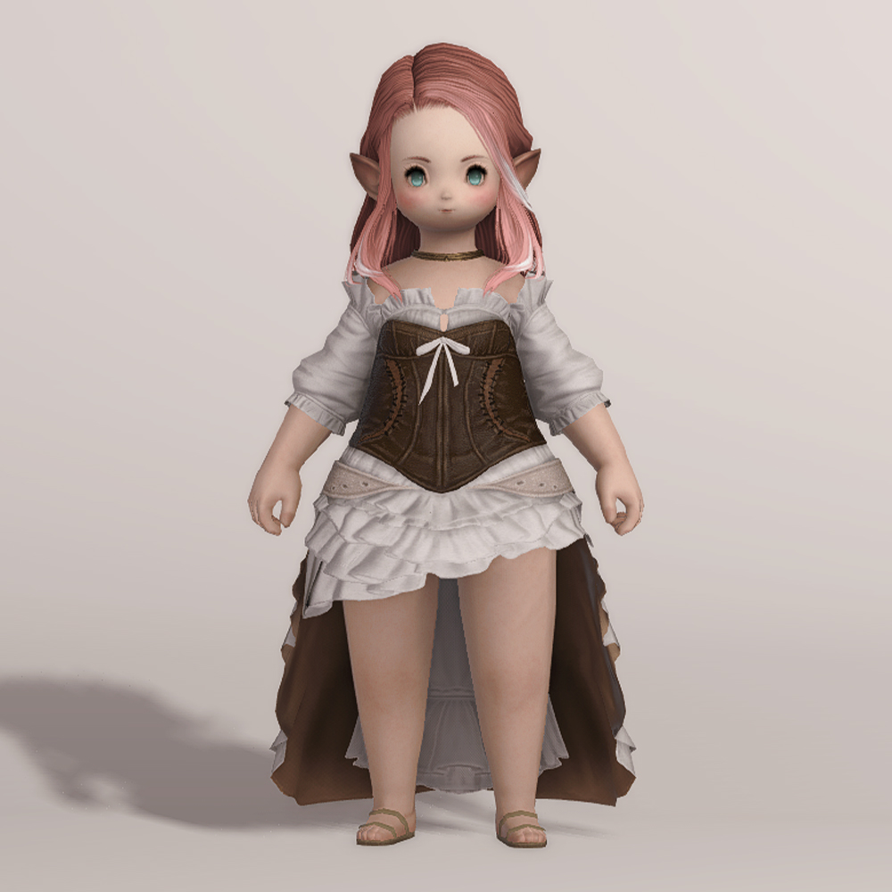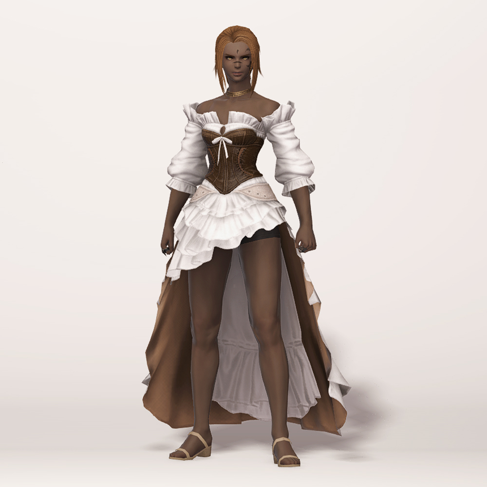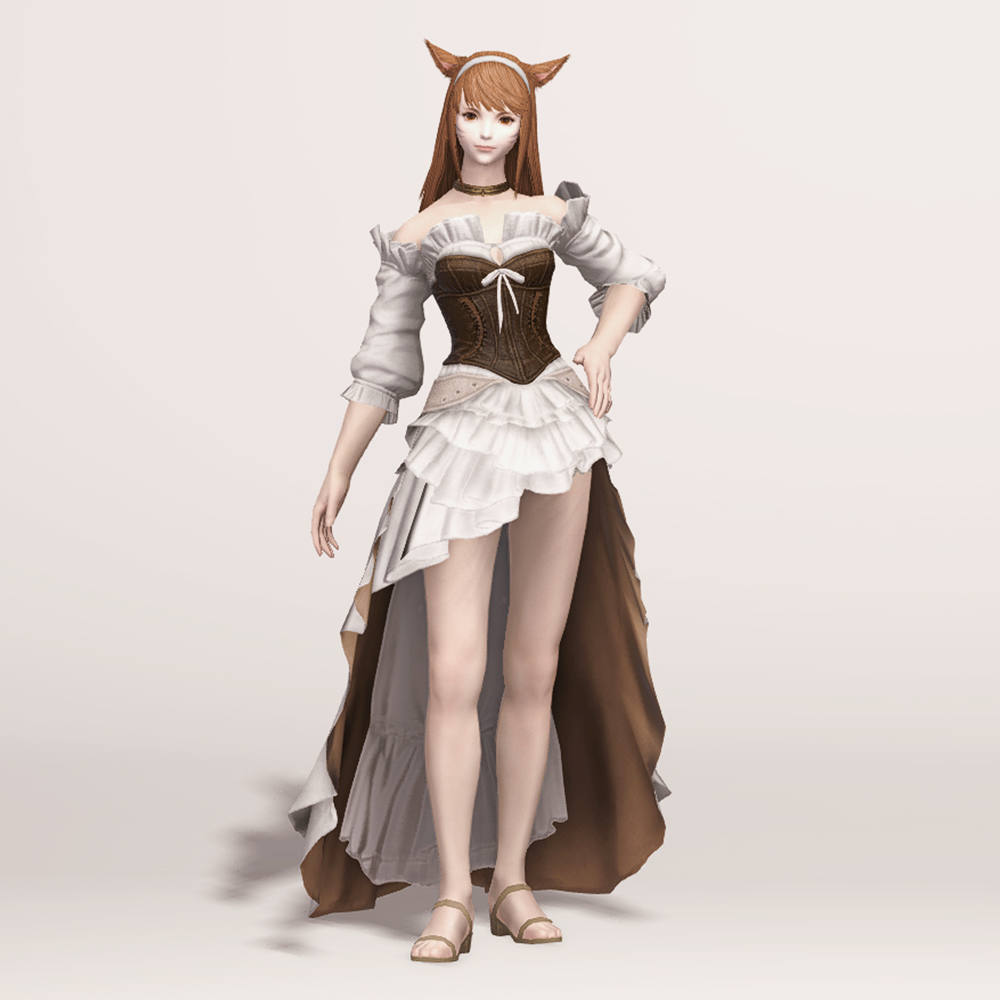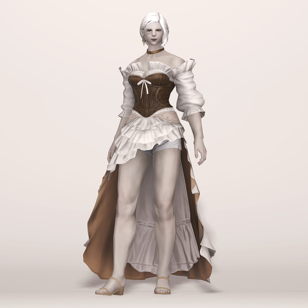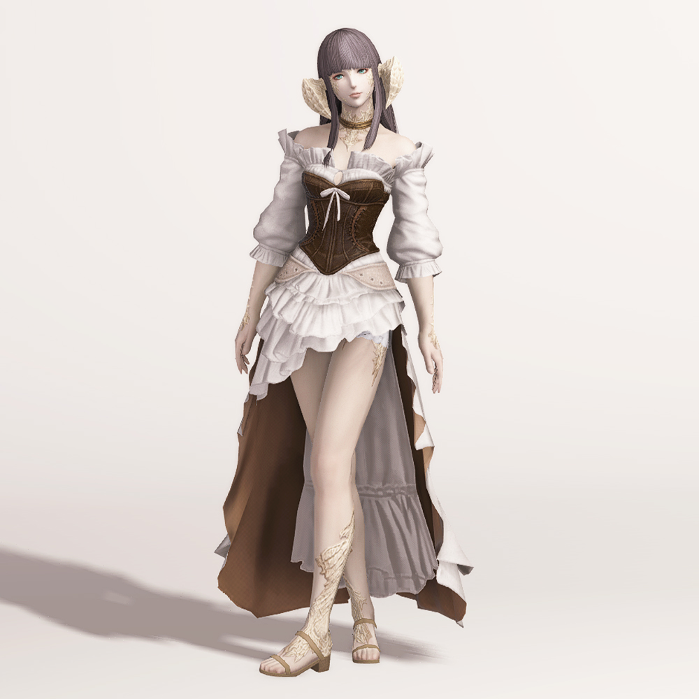 금속 목걸이를 차고 있는 오프숄더 퍼프 원피스입니다. 전체적으로 프릴이 들어가 화려하면서도 우아하며 남캐 외형과 차이가 큽니다. 하반신에서 사선으로 짧게 프릴 스커트가 달려 양다리가 드러납니다.