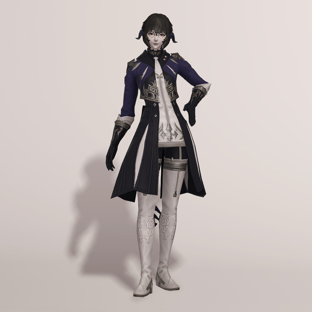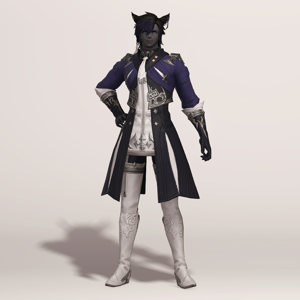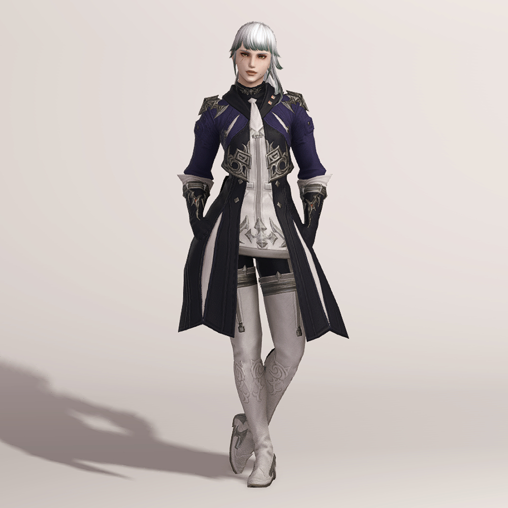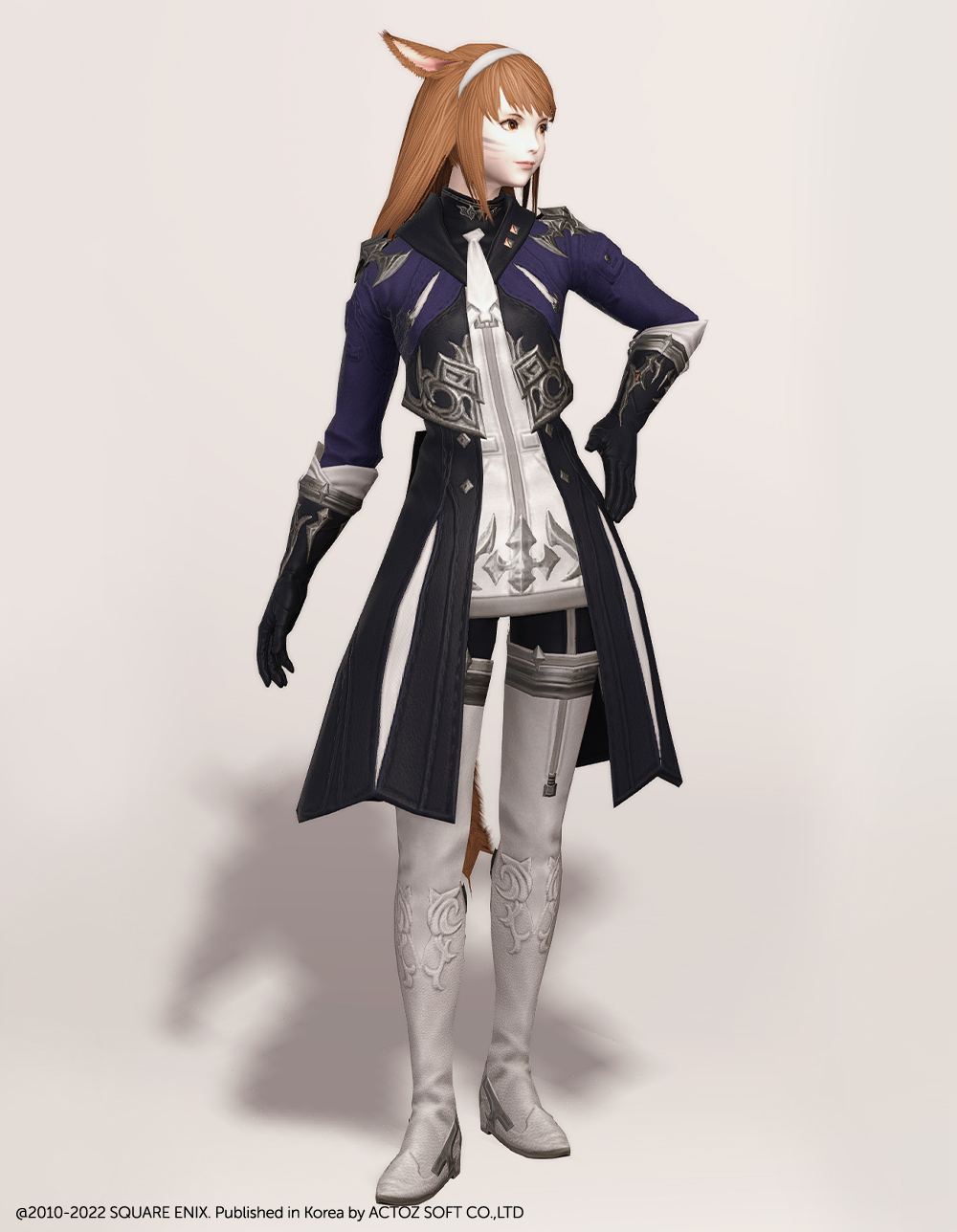 옆에 모험가가 버젓이 서있는데도 불구하고 알피노만 받은 타타루의 수제 옷입니다. 섬세하게 장식된 이너와 부츠, 여기에 볼레로와 A라인의 코트를 조합한 푸른색 자켓이 인상적이며, 짧은 기장의 넥타이가 포인트입니다. 블루포인트를 좋아하시는 분들은 격식 있는 정장 느낌으로 착용 가능해 추천드립니다.