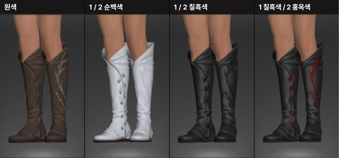 1염색 - 장화 전체 염색 /2염색 - 여밈부분 가죽끈 및 장식무늬 염색