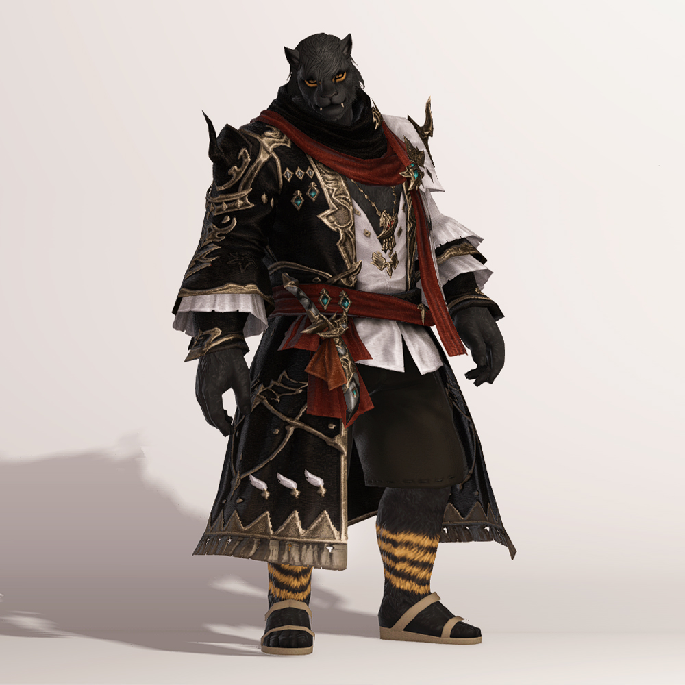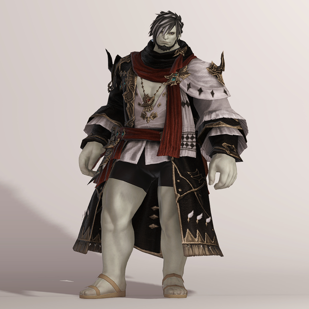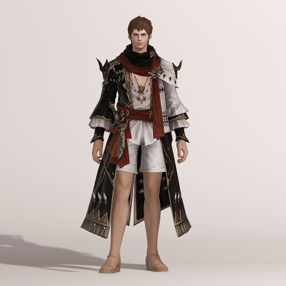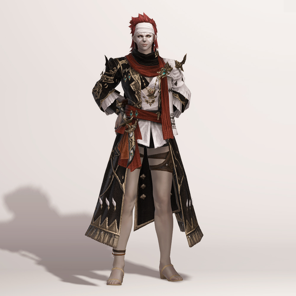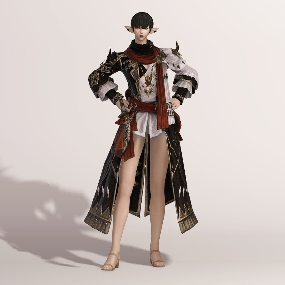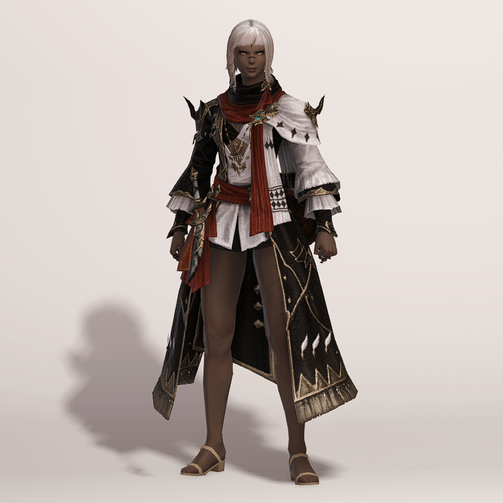 보는 사람을 기준으로 왼쪽은 검은색, 오른쪽은 흰색으로 나누어진 아수라 백작 스타일의 음유시인 상의입니다. 반반 나뉜 색상의 옷은 자칫 촌스럽다고 느낄 수도 있으나 화려한 금속 장식과 스카프, 곳곳에 포인트로 들어간 붉은 색상 덕분에 전체적으로 조화로우면서도 고급스럽습니다.