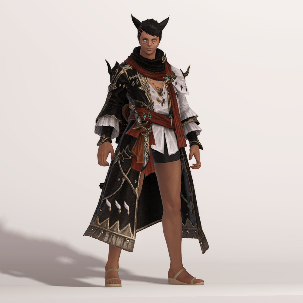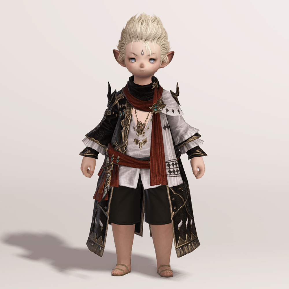 허리 앞쪽에는 단검이, 뒤쪽에는 우쿨렐레가 부착되어 있습니다. 특이하게도 양쪽 어깨에 뿔 같은 가시 장식이 부착되어 있는데, 전체적인 옷 느낌이나 색상 팔레트가 90 소환사 잡룩인 소집자 외투와 비슷해 트윈룩으로 맞출 수 있습니다.