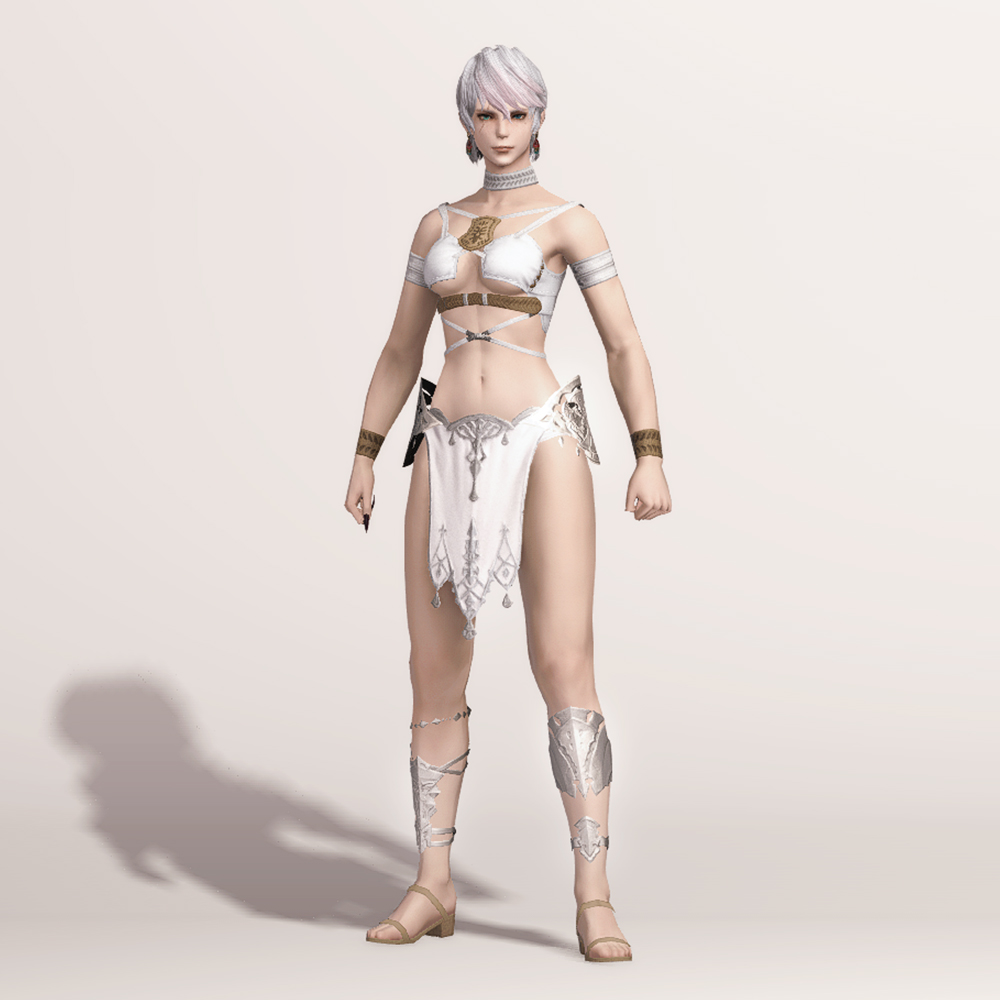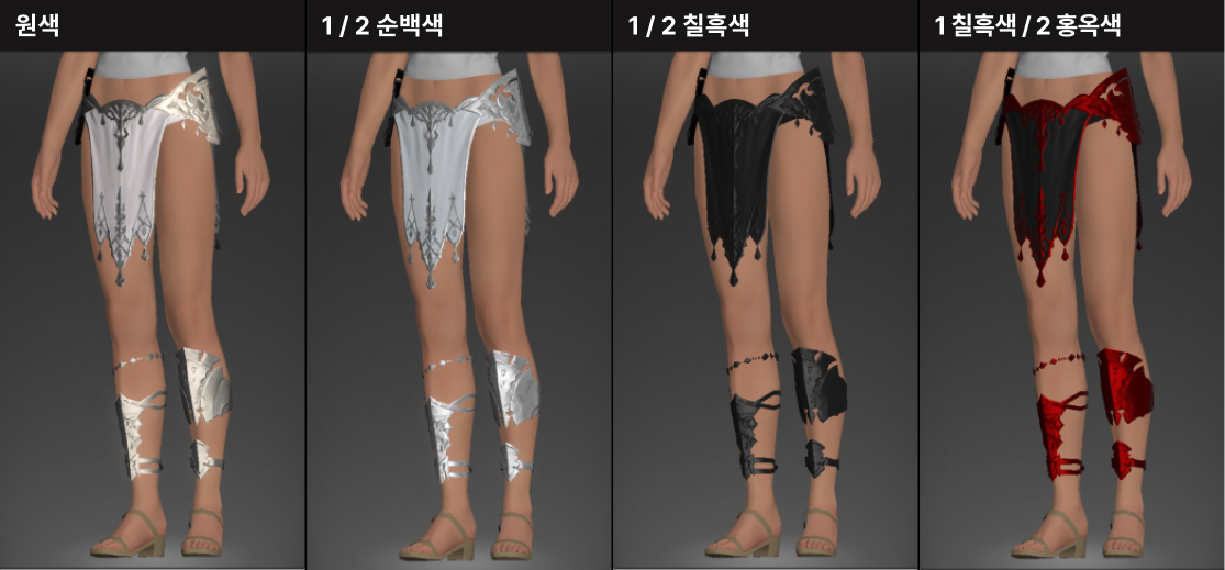 앞뒤로 독특한 금속 문양과 장식이 포인트로 들어간 하의입니다. 금속 종아리 보호대와 함께 단순하게 하의만 입고 다니기에는 코디하기 조금 까다로운 편이지만, 상의가 허벅지나 엉덩이를 조금이라도 덮는 상의를 입을시 종아리 보호대만 표시됩니다. 이를 이용해 키톤 종류의 상의와 함께 매치하시는 것을 추천드립니다.