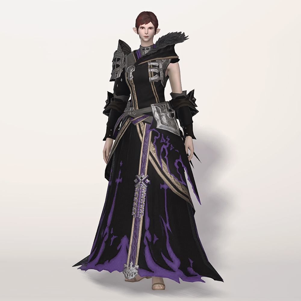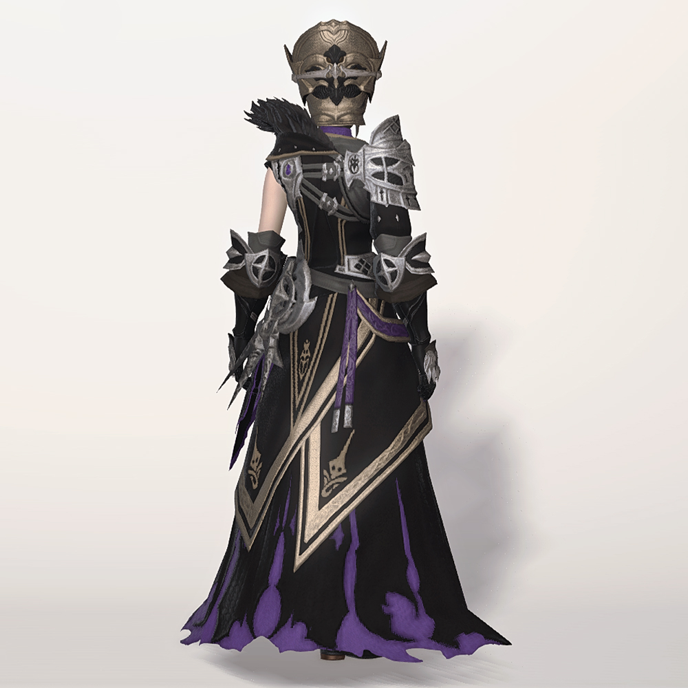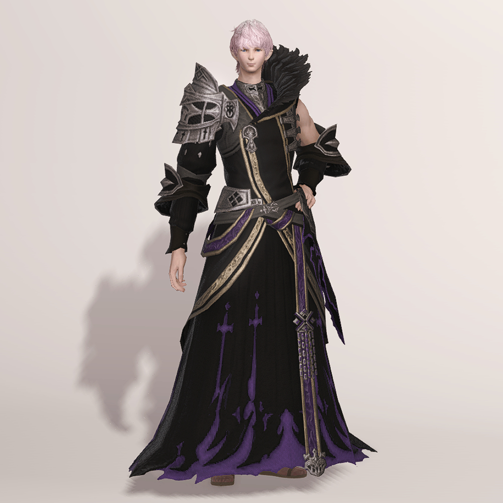 어딘가의 군주가 입었을 법한 느낌의 상의입니다. 보는 사람을 기준으로 오른쪽 가슴 쪽에 갈비뼈와 유사한 느낌의 금속 장식이 눈에 띄며, 허리에 매어져 바닥으로 흘러내린 독특한 무늬의 띠와 장신구는 동양풍스러운 느낌을 만들어냅니다.