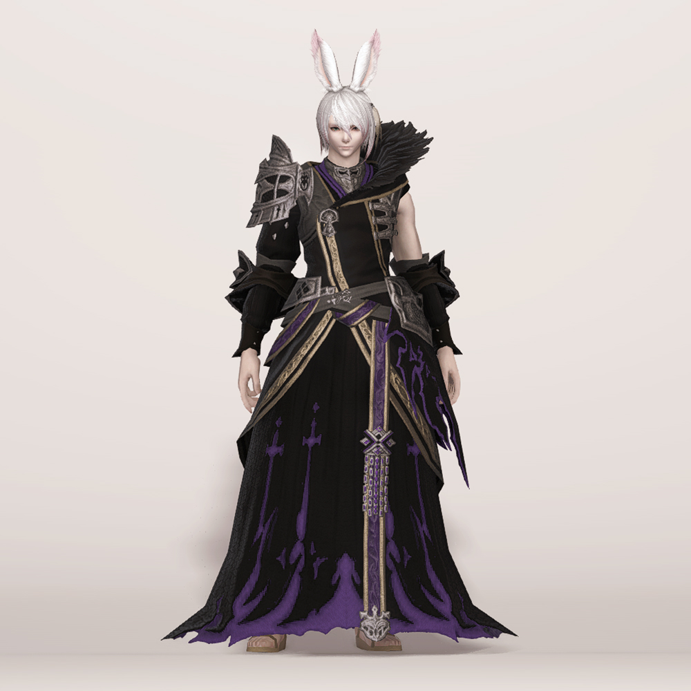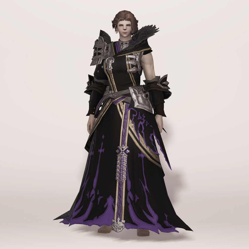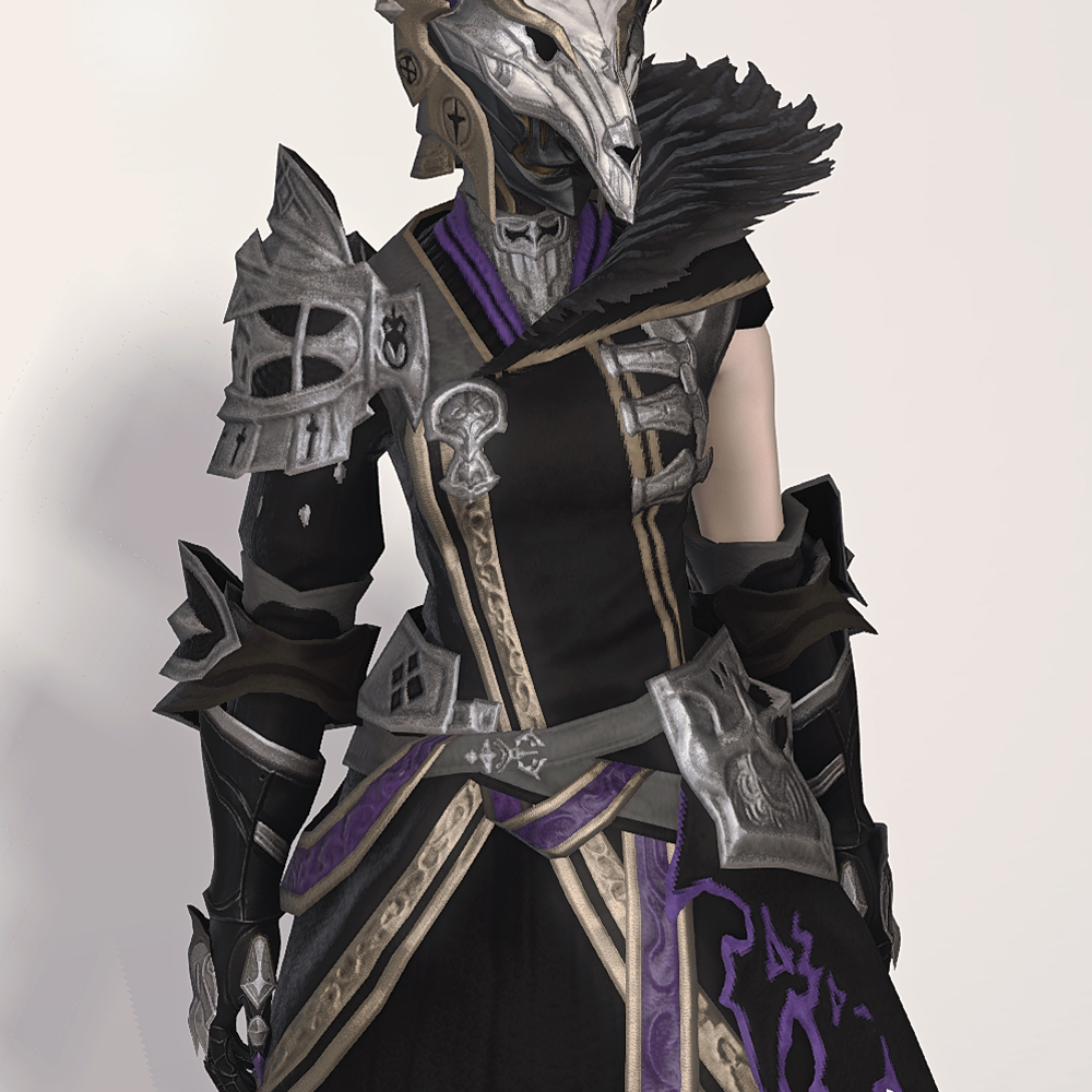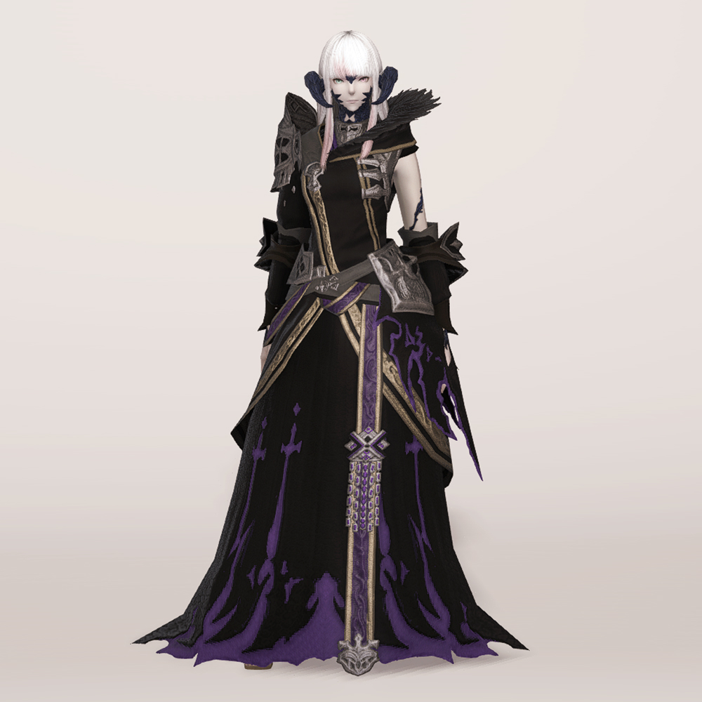 어딘가의 군주가 입었을 법한 느낌의 상의입니다. 보는 사람을 기준으로 오른쪽 가슴 쪽에 갈비뼈와 유사한 느낌의 금속 장식이 눈에 띄며, 허리에 매어져 바닥으로 흘러내린 독특한 무늬의 띠와 장신구는 동양풍스러운 느낌을 만들어냅니다.