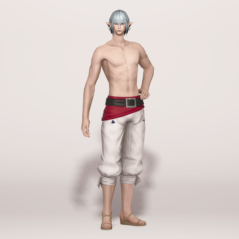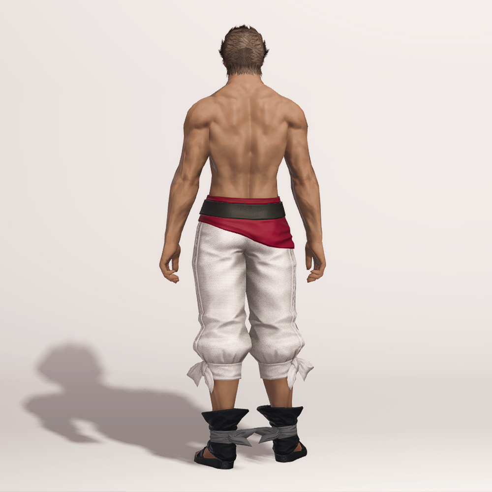 곡선핏이 귀여운 반바지입니다. 시보리 처리한 밑단 바깥쪽에 귀여운 리본 매듭이 포인트입니다. 허리띠와 사선으로 내려오는 천은 염색이 불가능하기 때문에 산길잡이 도복처럼 허리를 덮을 수 있는 상의와 매치해 코디하는 것을 추천드립니다.