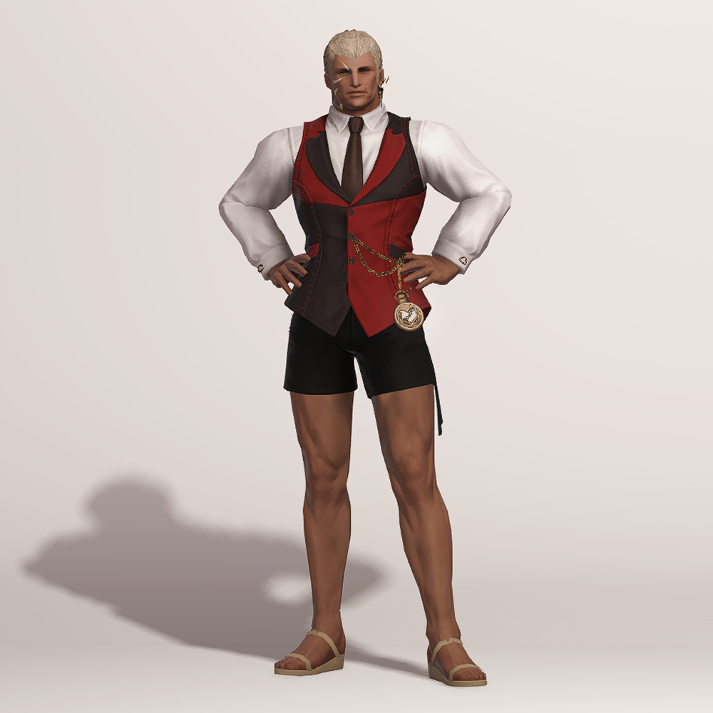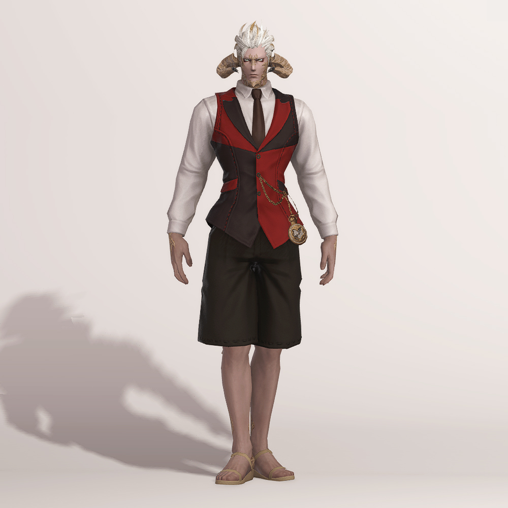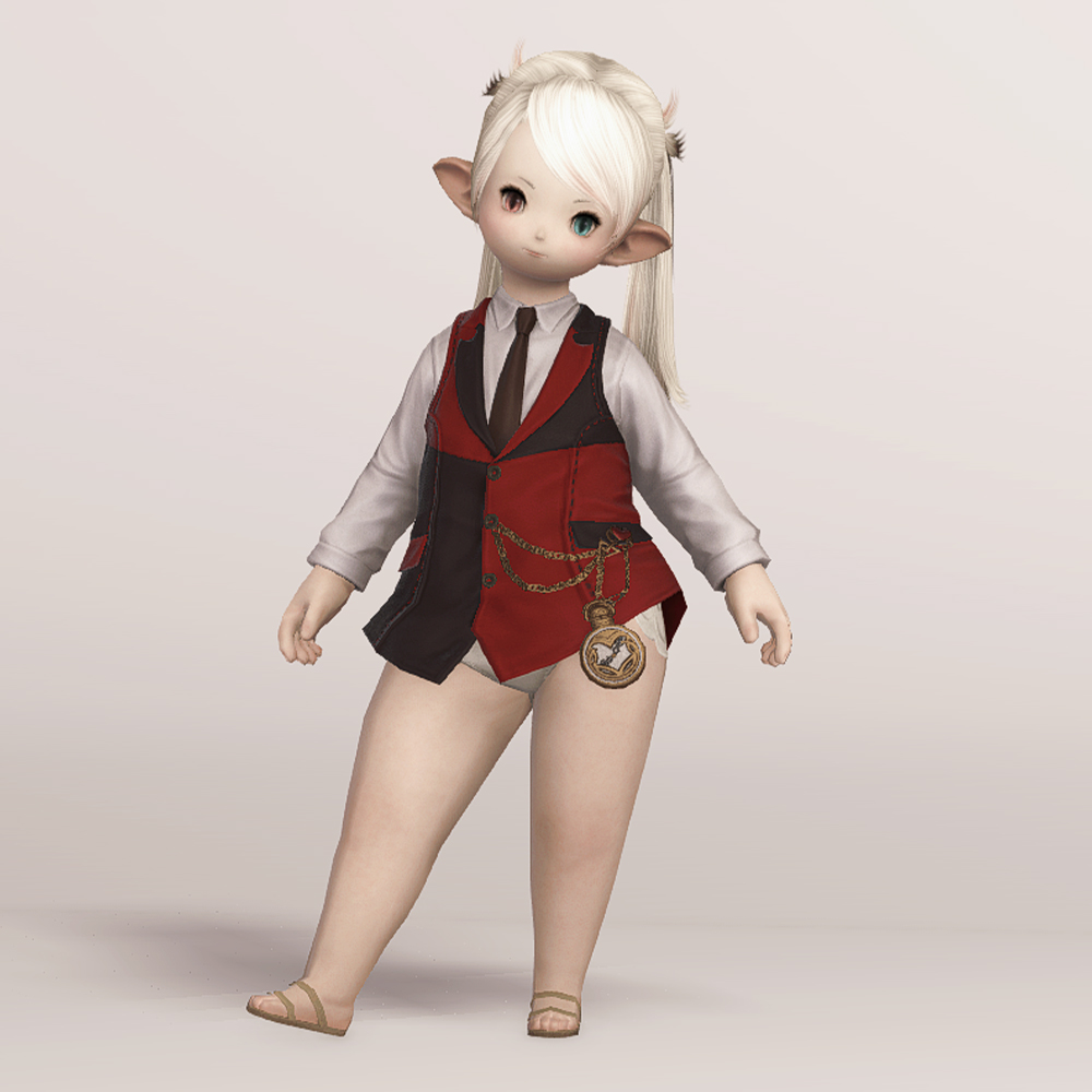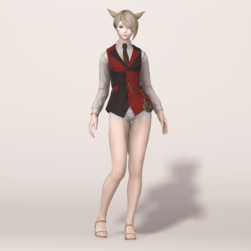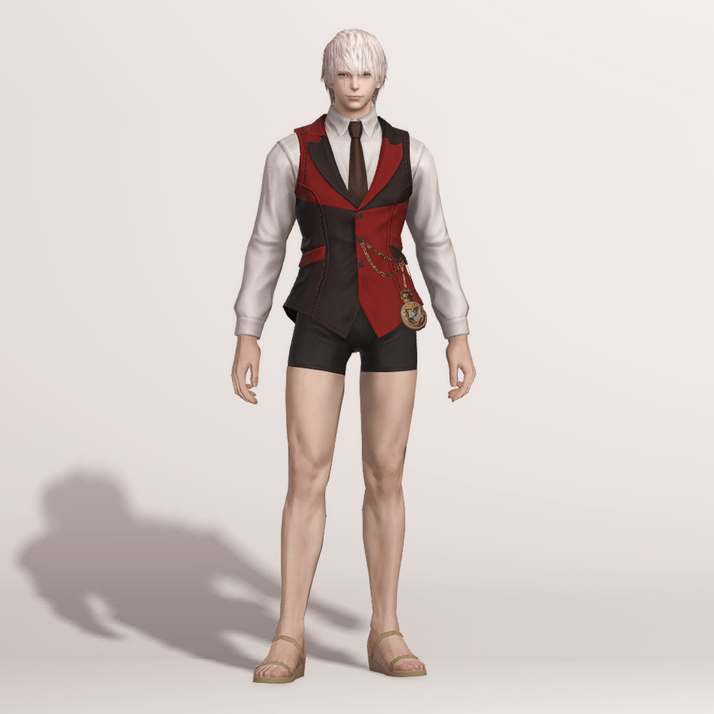 발렌티온 데이를 기념하여 만들어진 깔끔한 핏의 정장 조끼입니다. 흰색 와이셔츠와 넥타이, 그리고 조끼의 조합은 최고입니다. 소매의 단추가 하트 모양으로 굉장히 귀여우며, 취향에 따라 이대로 입어도 괜찮지만 장미조끼의 경우 짙은 갈색으로 염색하는 것을 적극적으로 추천드립니다. 허리춤의 회중시계를 보면 어쩐지 시계 토끼가 떠오릅니다.