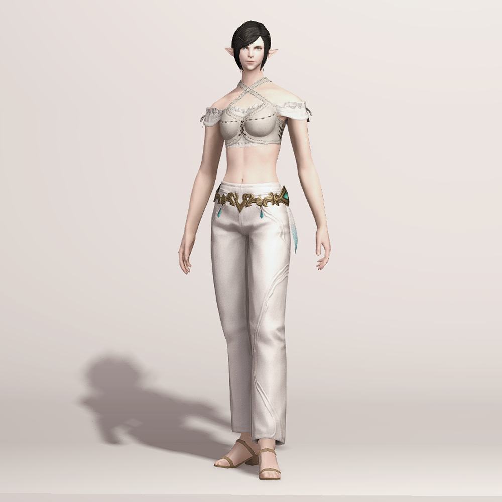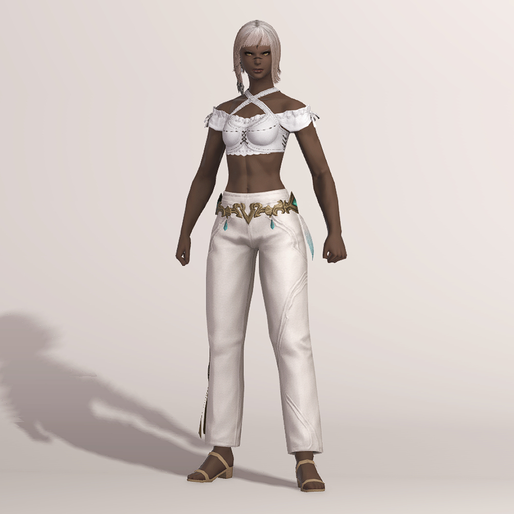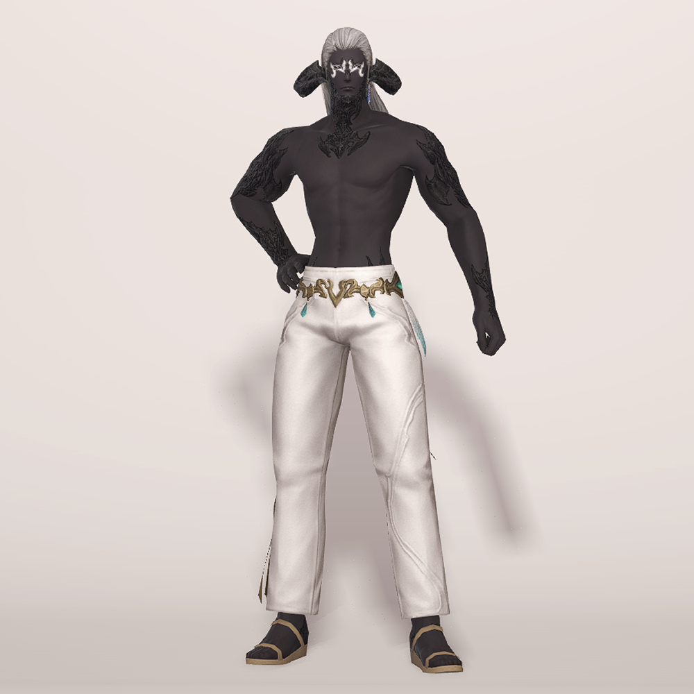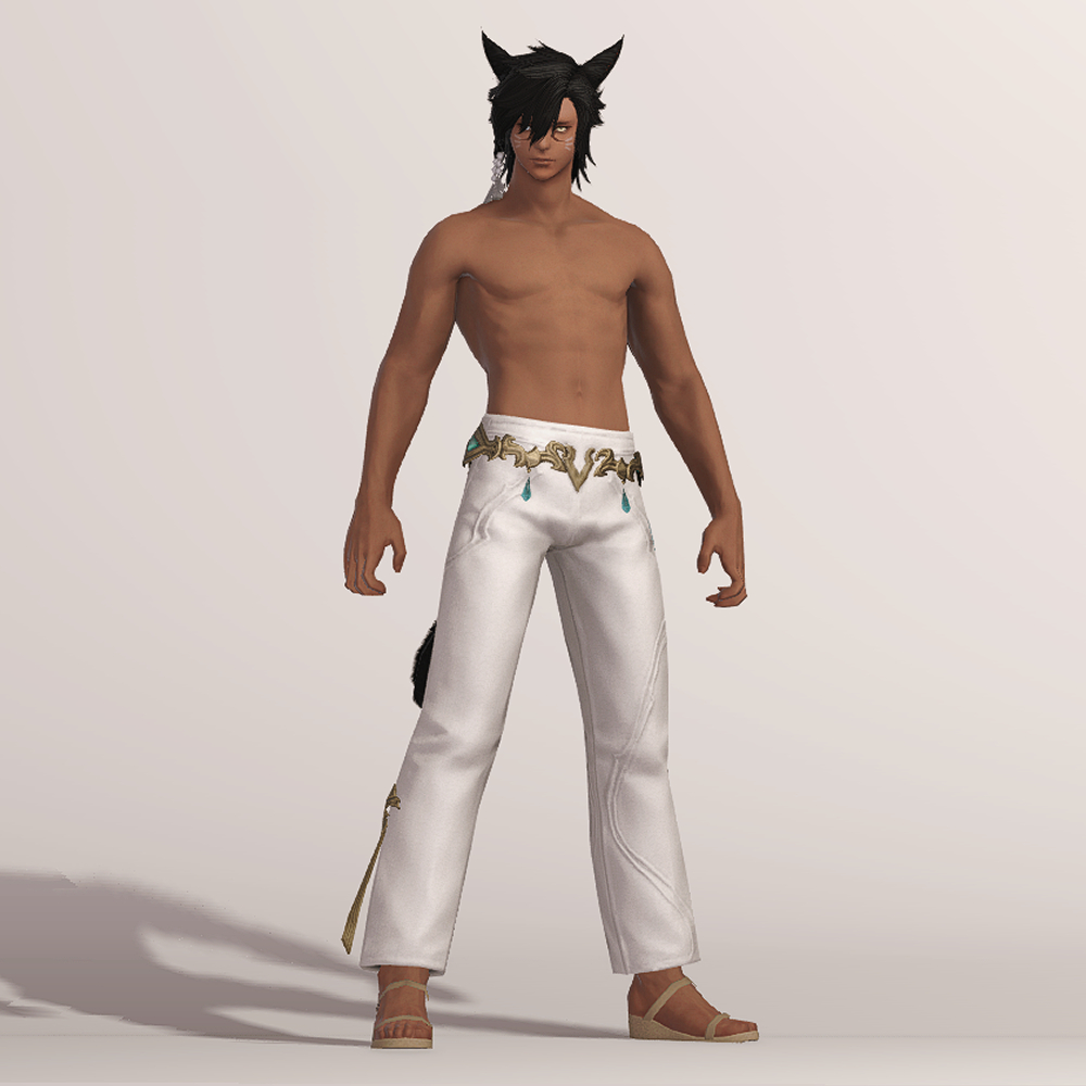 깔끔한 핏을 자랑하는 일자바지입니다. 마치 벨트처럼 금속 장식이 허리를 감싸고 있으며 양옆의 청록색 보석과 깃털이 눈에 띕니다. 세트로 나온 악마의 일자바지와 거의 동일한 실루엣을 가지고 있으며 밑단의 끈 장식이 보는 사람을 기준으로 왼쪽에 위치하고 있습니다.