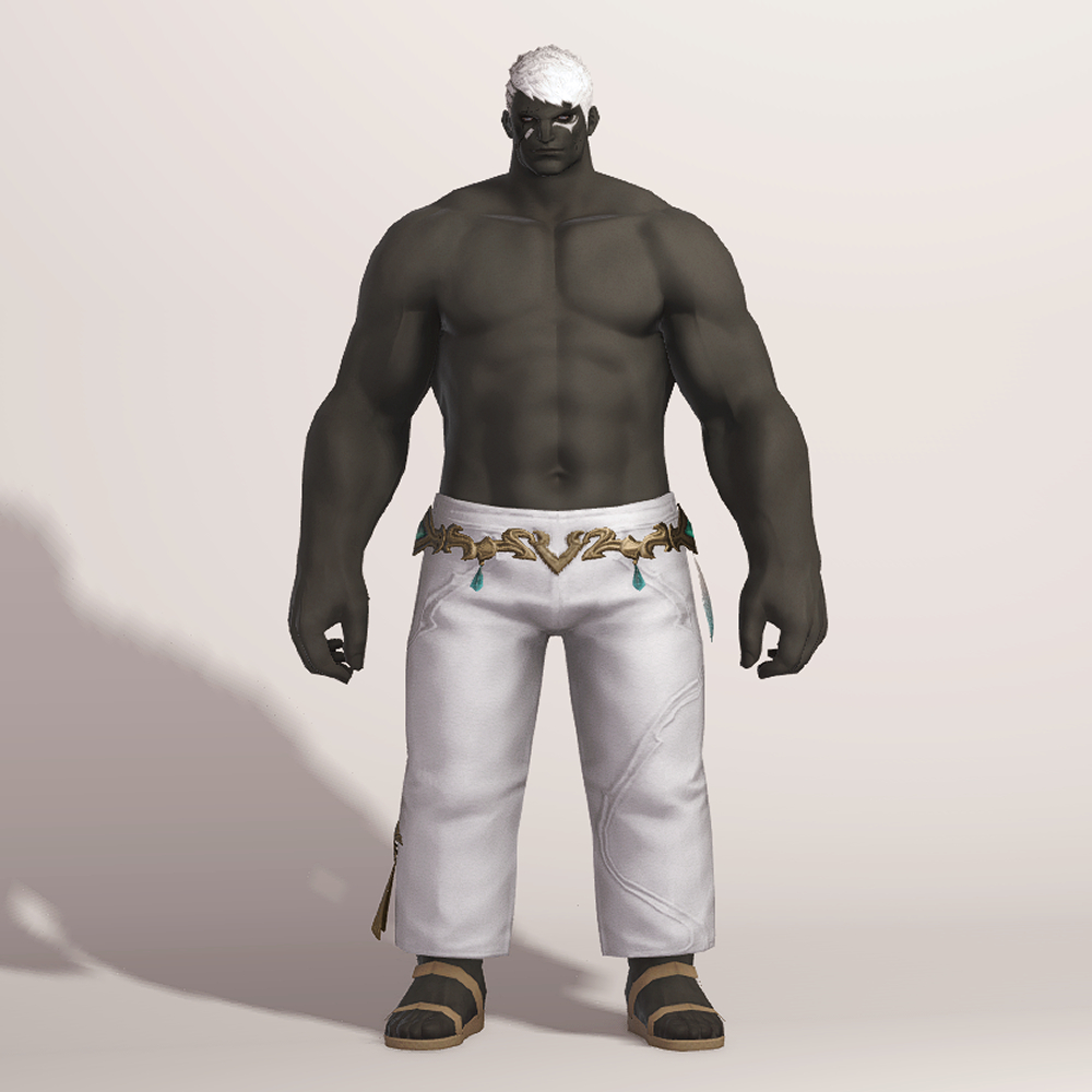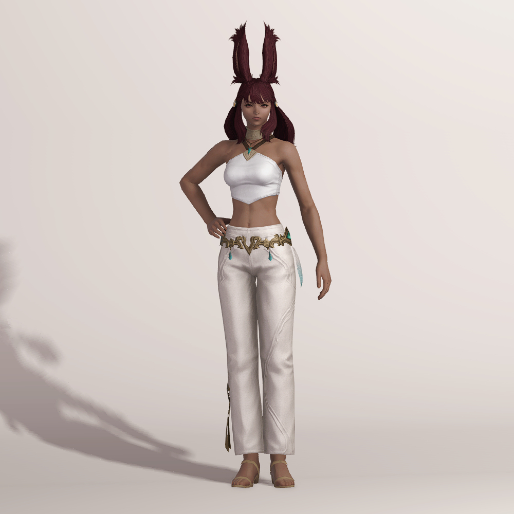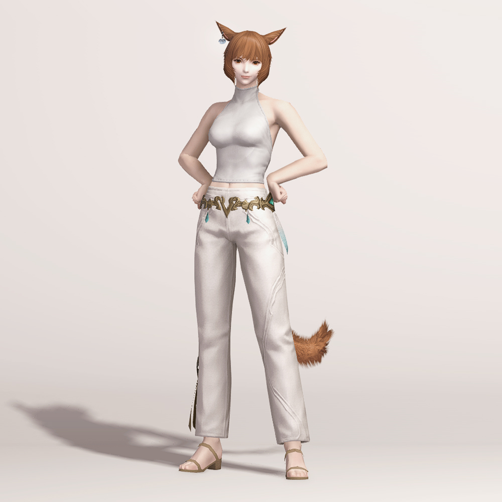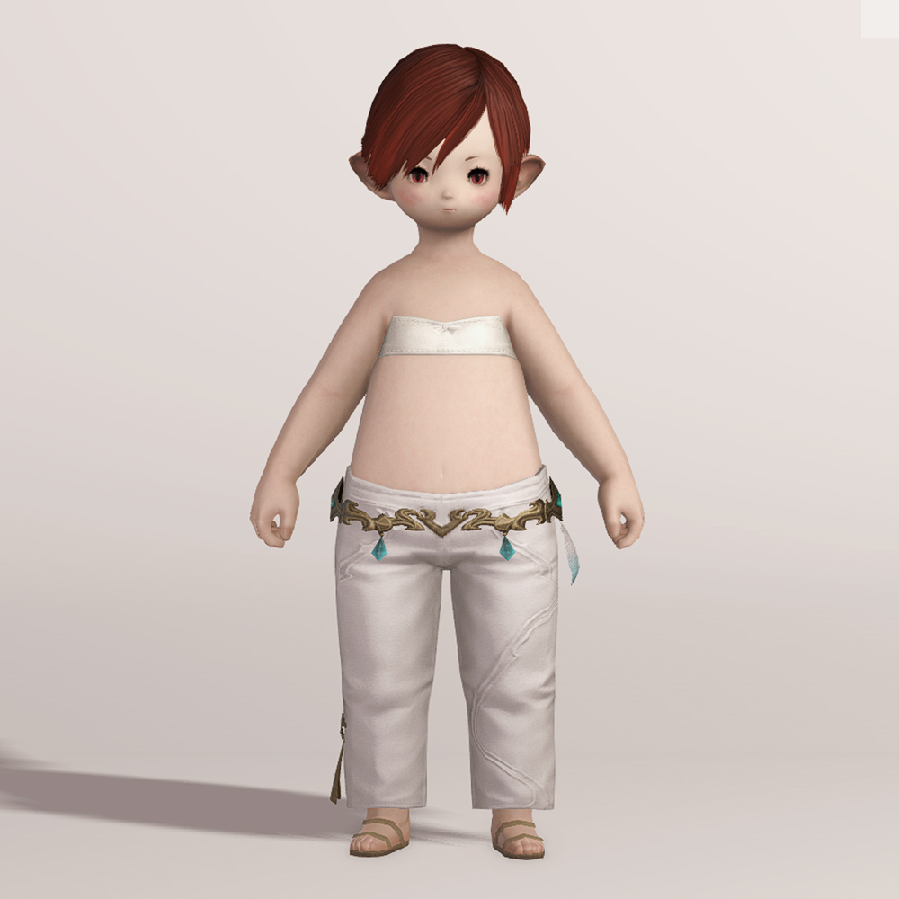 깔끔한 핏을 자랑하는 일자바지입니다. 마치 벨트처럼 금속 장식이 허리를 감싸고 있으며 양옆의 청록색 보석과 깃털이 눈에 띕니다. 세트로 나온 악마의 일자바지와 거의 동일한 실루엣을 가지고 있으며 밑단의 끈 장식이 보는 사람을 기준으로 왼쪽에 위치하고 있습니다.