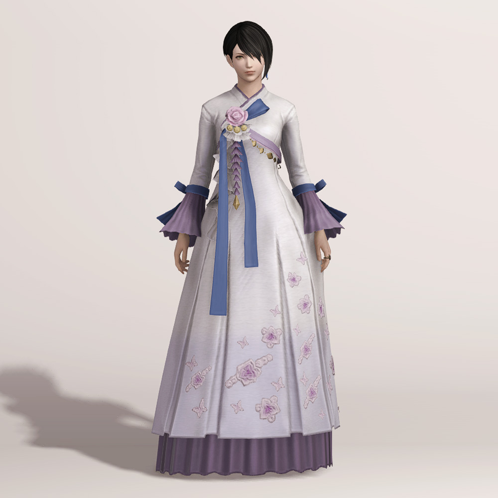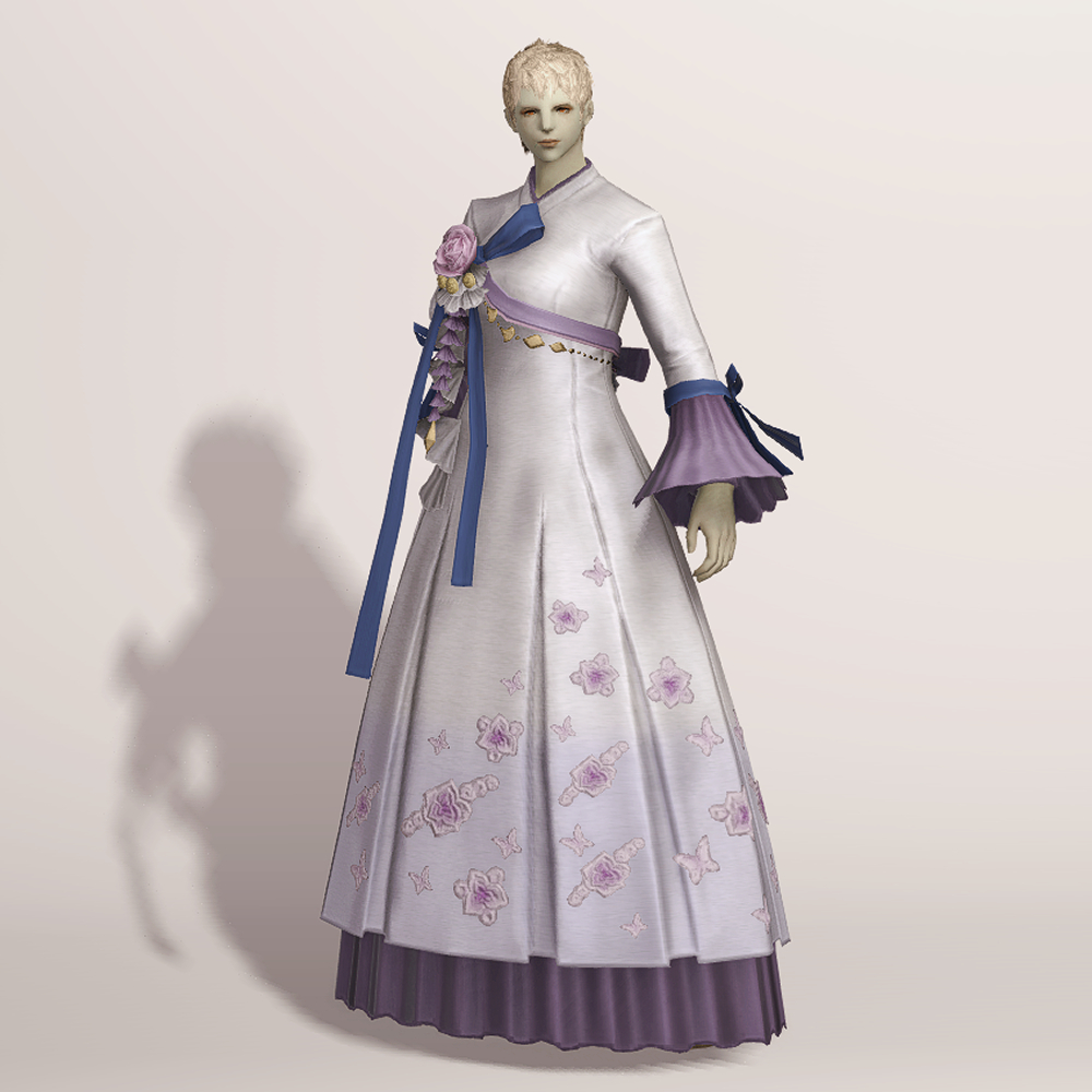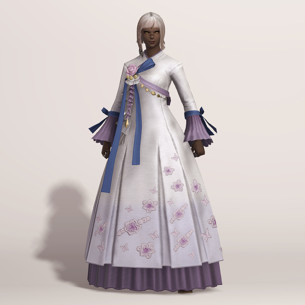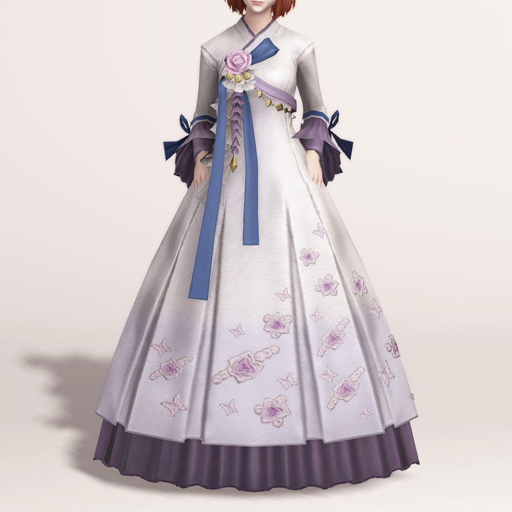밑단의 꽃과 나비 자수 디테일이 돋보여 동방 특유의 느낌을 볼 수 있는 아름다운 한복입니다. 동방 미인의 머리장식에 들어간 동일한 장미와 금속 장식, 푸른색 고름이 눈에 띄며, 나팔 소매와 허리 뒤쪽의 리본이 포인트로 귀엽게 들어갔습니다.