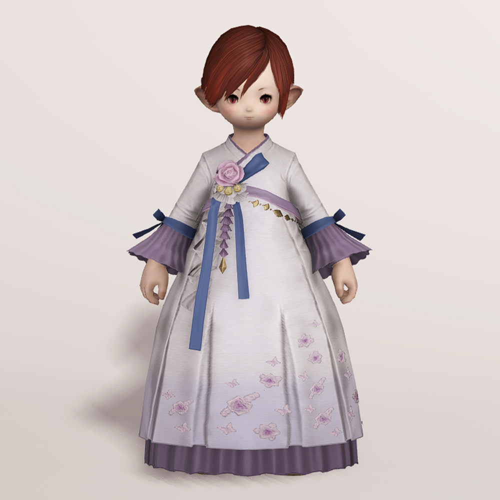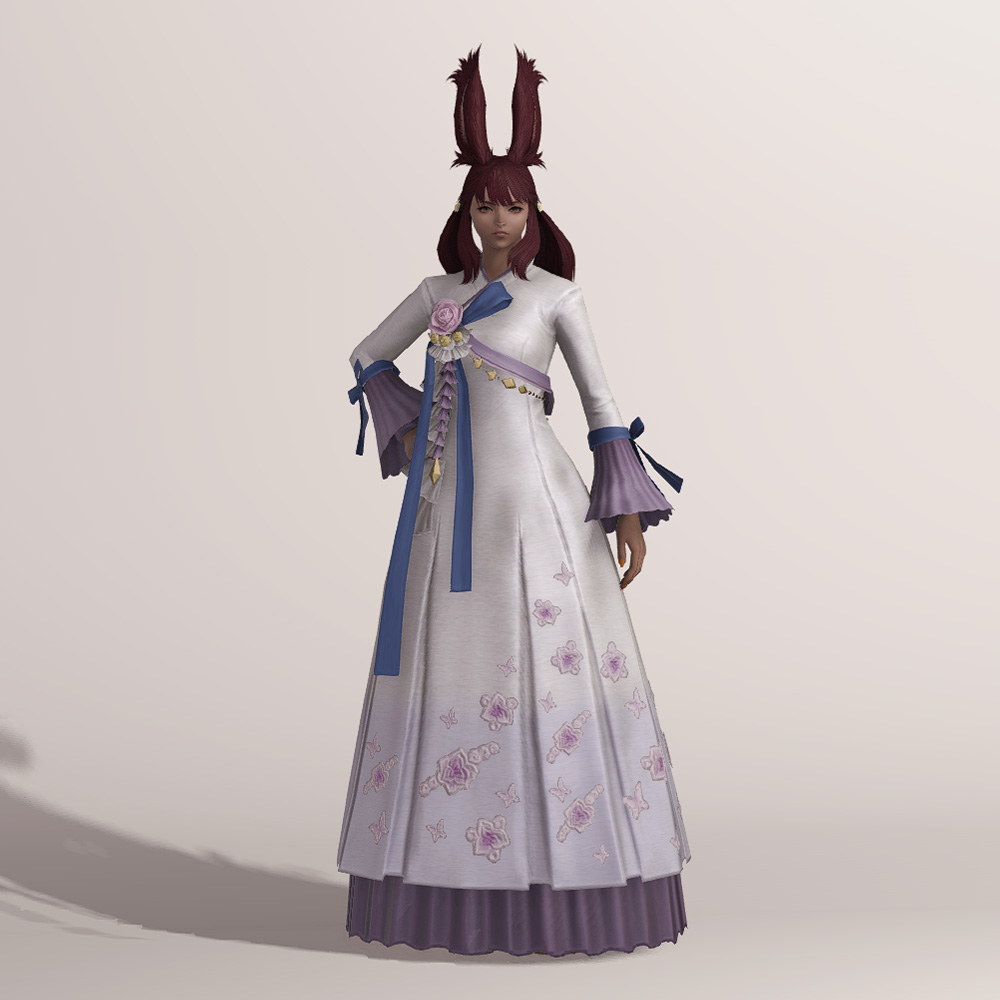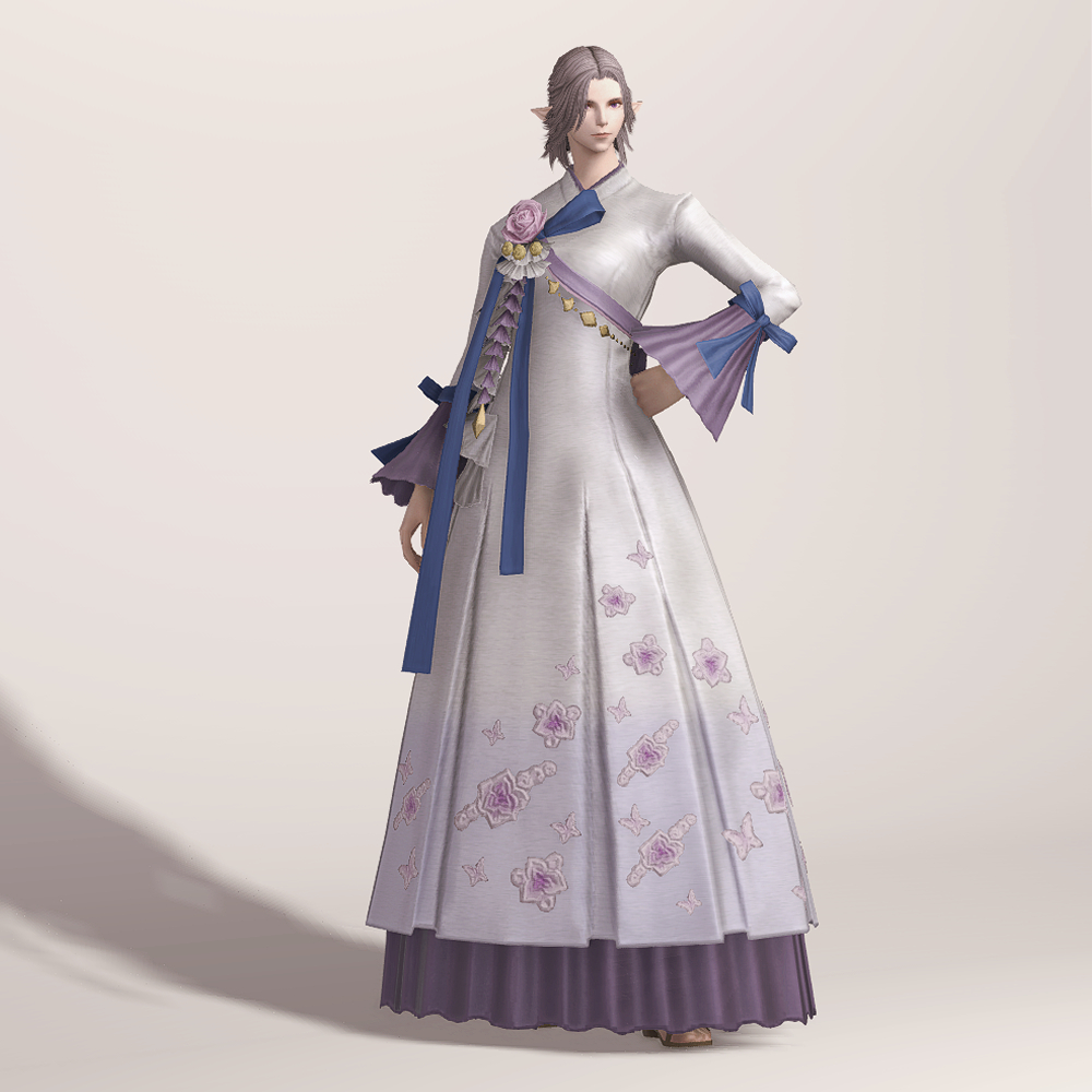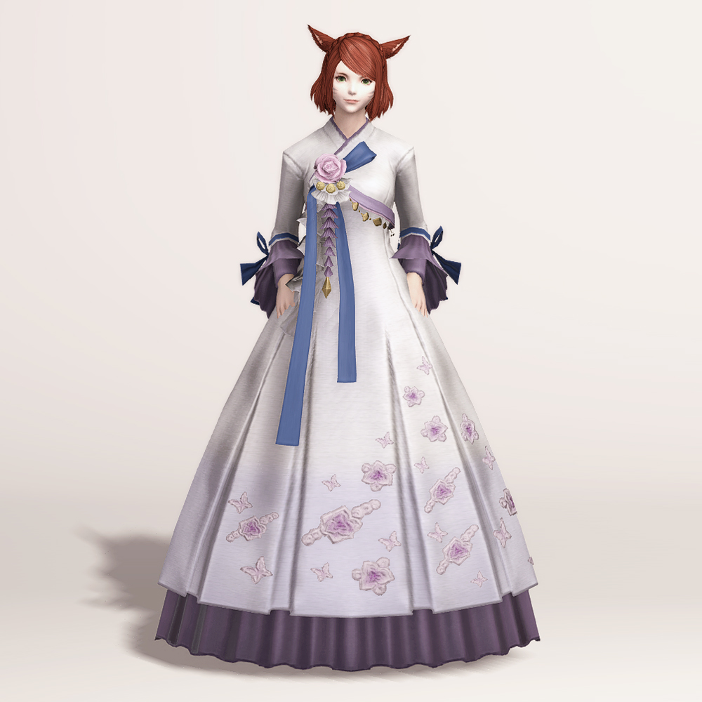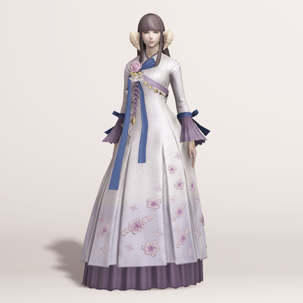 밑단의 꽃과 나비 자수 디테일이 돋보여 동방 특유의 느낌을 볼 수 있는 아름다운 한복입니다. 동방 미인의 머리장식에 들어간 동일한 장미와 금속 장식, 푸른색 고름이 눈에 띄며, 나팔 소매와 허리 뒤쪽의 리본이 포인트로 귀엽게 들어갔습니다.
