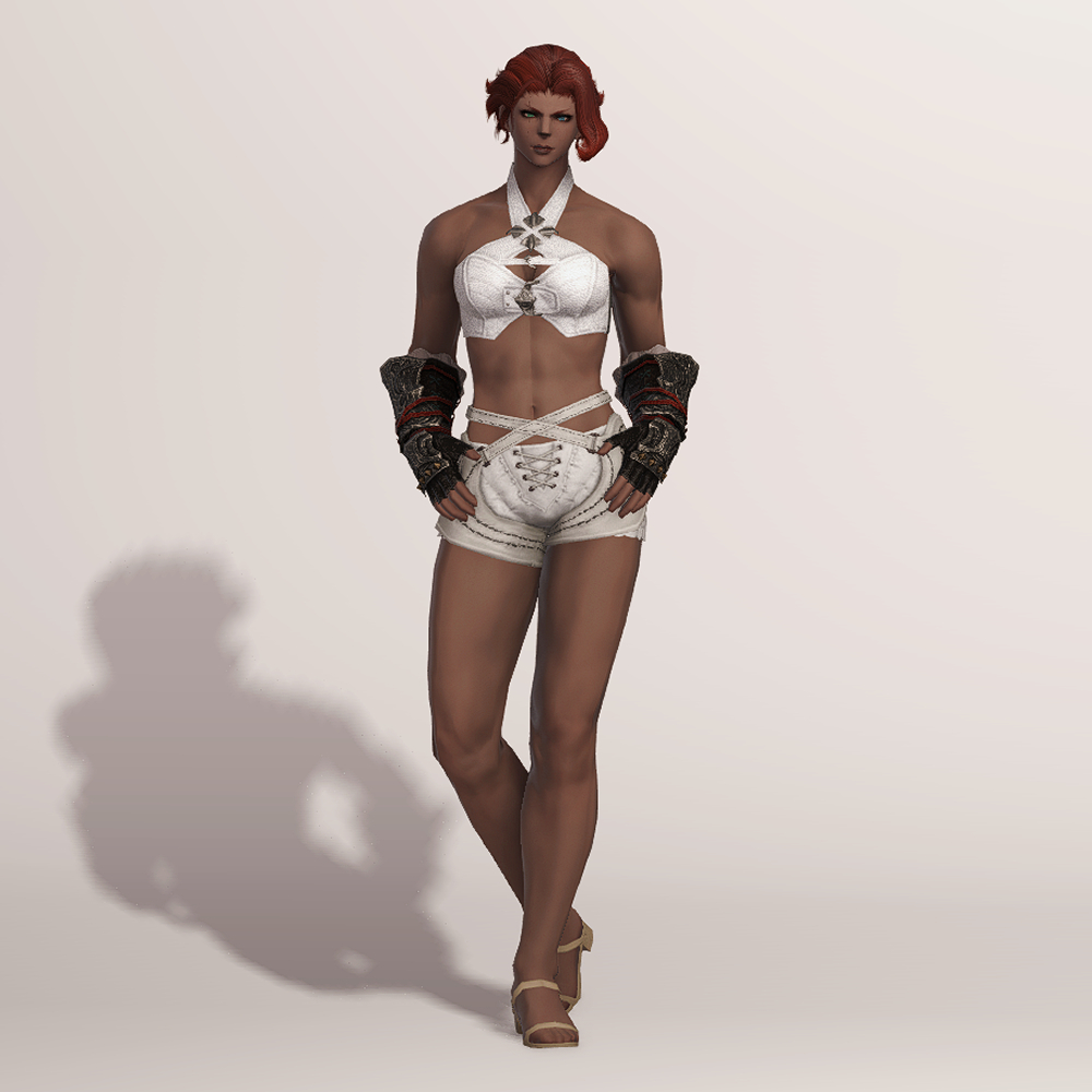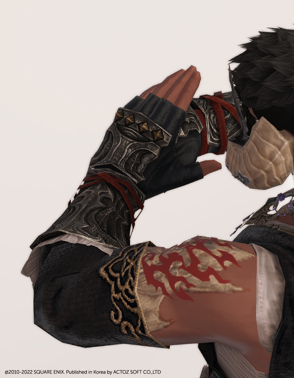 날렵한 딜을 묵직하게 날리기 위해 갑주가 덧대진 완갑입니다. 갑주장화와 세트로 디자인 되었으며, 디자인은 동일하게 가죽방어구 위에 갑주를 달고, 붉은 끈으로 마무리하였습니다. 반장갑 스타일로, 가벼운 경갑스타일의 동양풍 코디에 매치하기 좋겠습니다.
