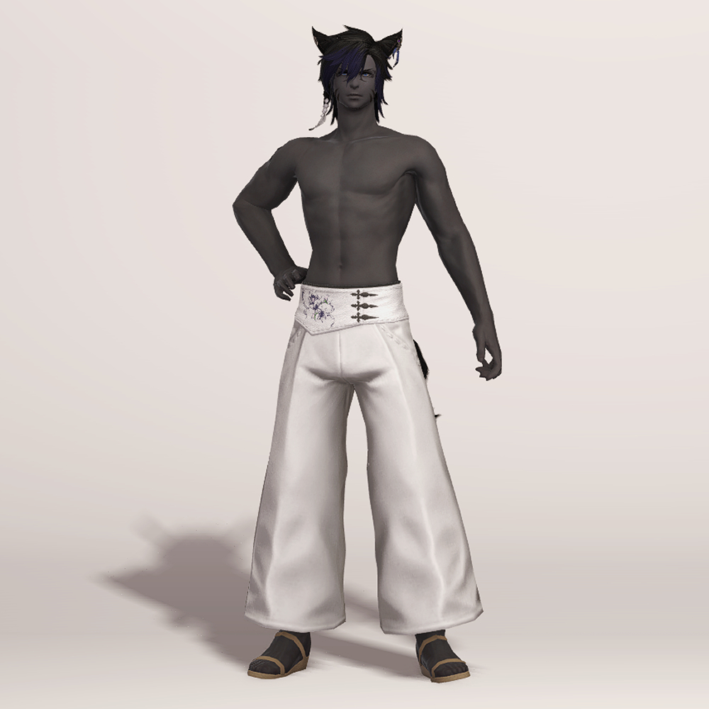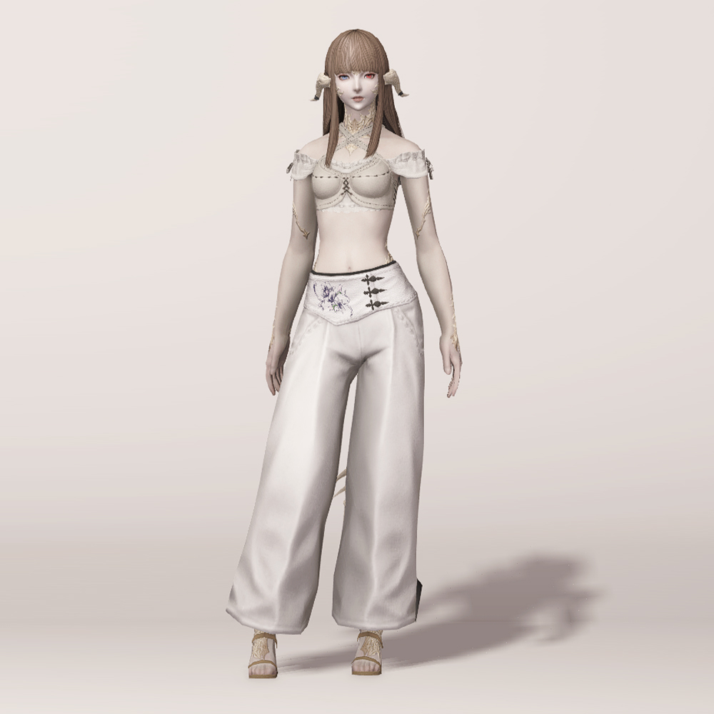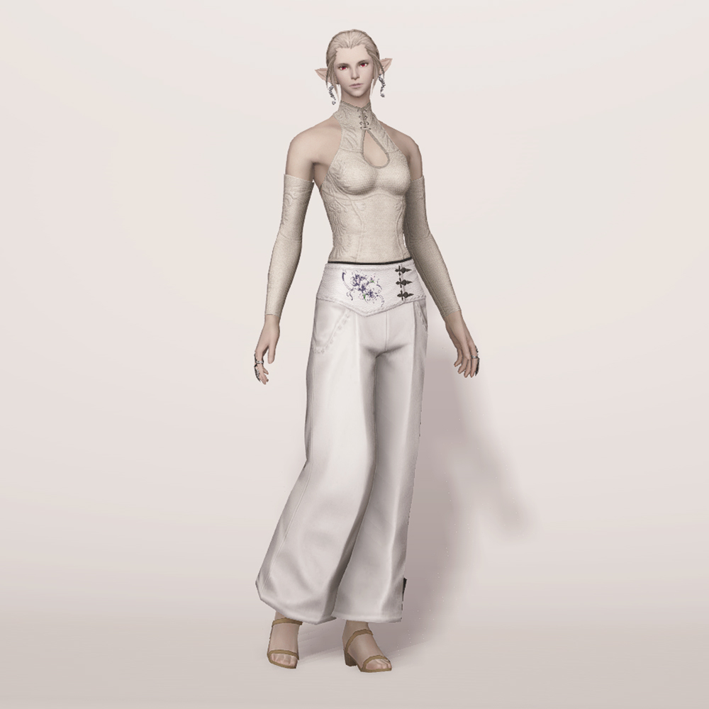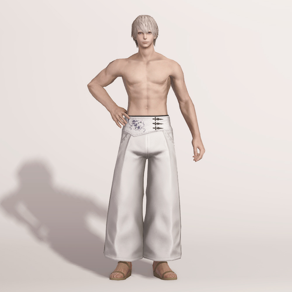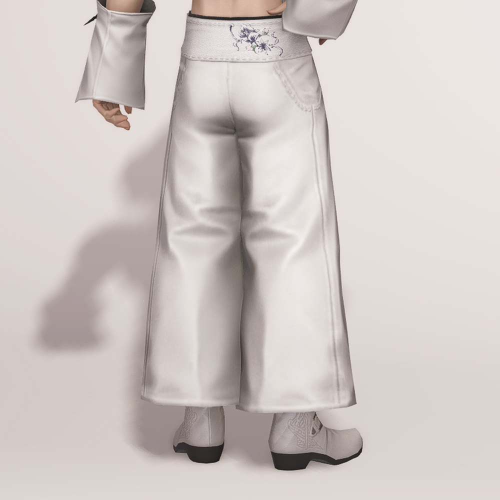 호화로운 자수로 멋을 낸 모던한 느낌의 와이드핏 하의입니다. 깔끔한 디자인에 허리 쪽의 디테일한 자수와 장식, 스티치가 눈에 띕니다. 늑대인간 발과 매치하면 발목 부분이 하의에 가려져 진짜 늑대 발처럼 변하며 달마스카 주름옷 상의, 바나스파티에서 드랍되는 팔라카 옷 등과 매치하면 잘 어울려 추천드립니다.