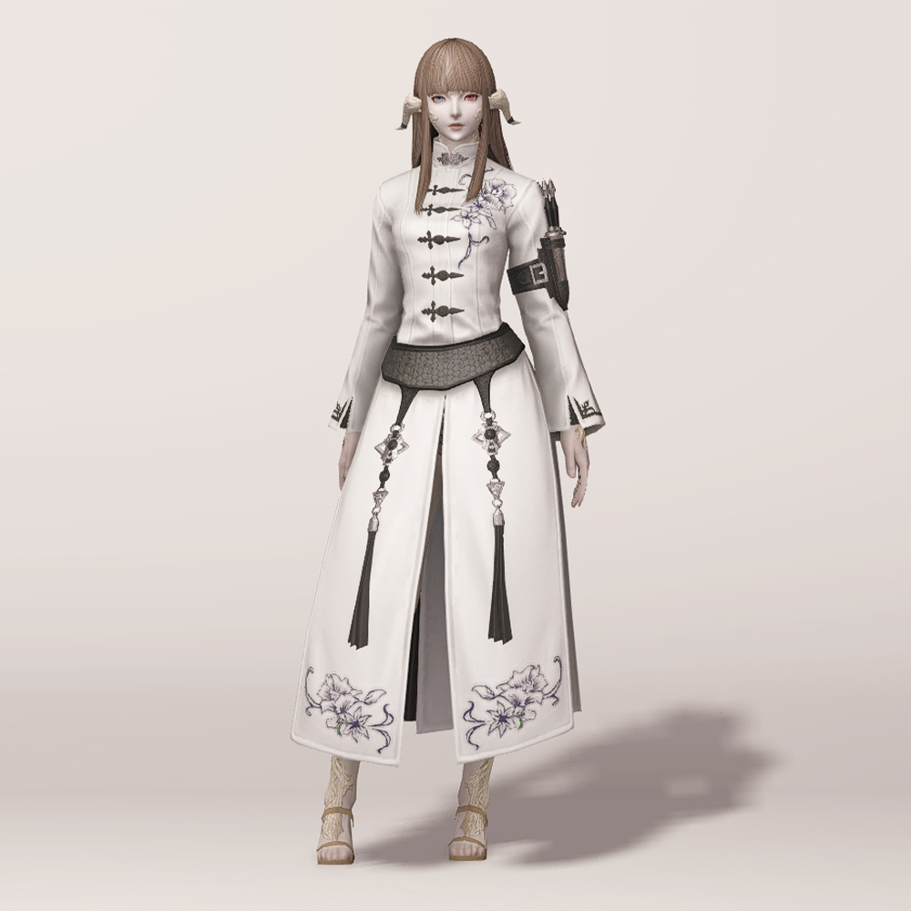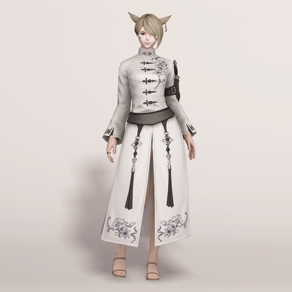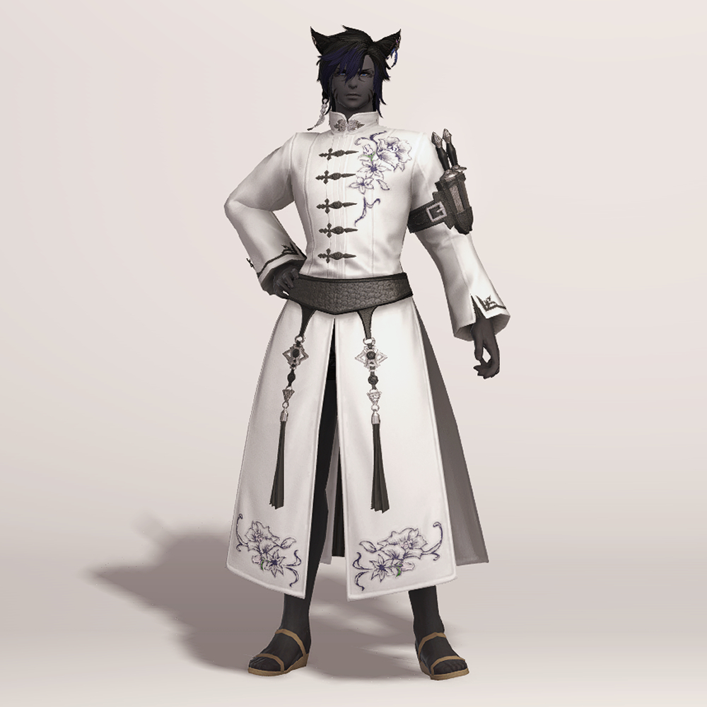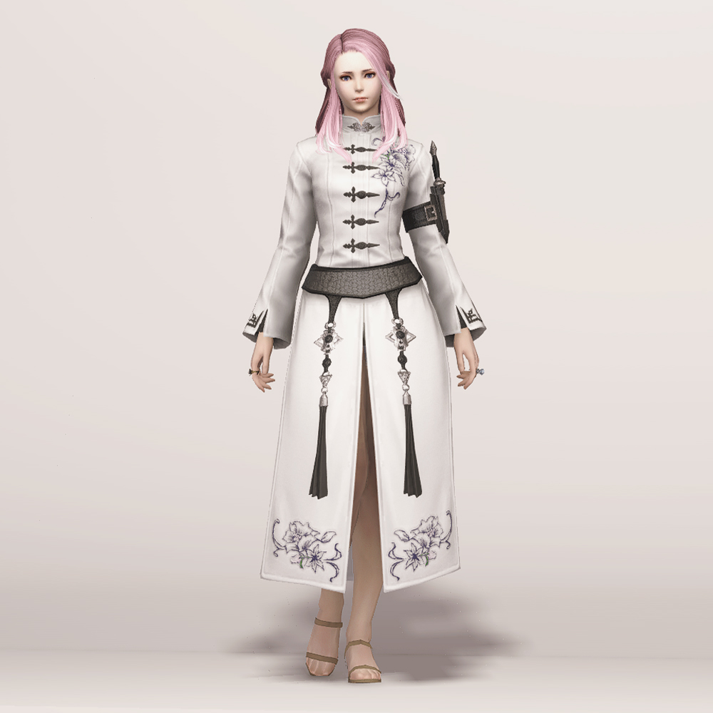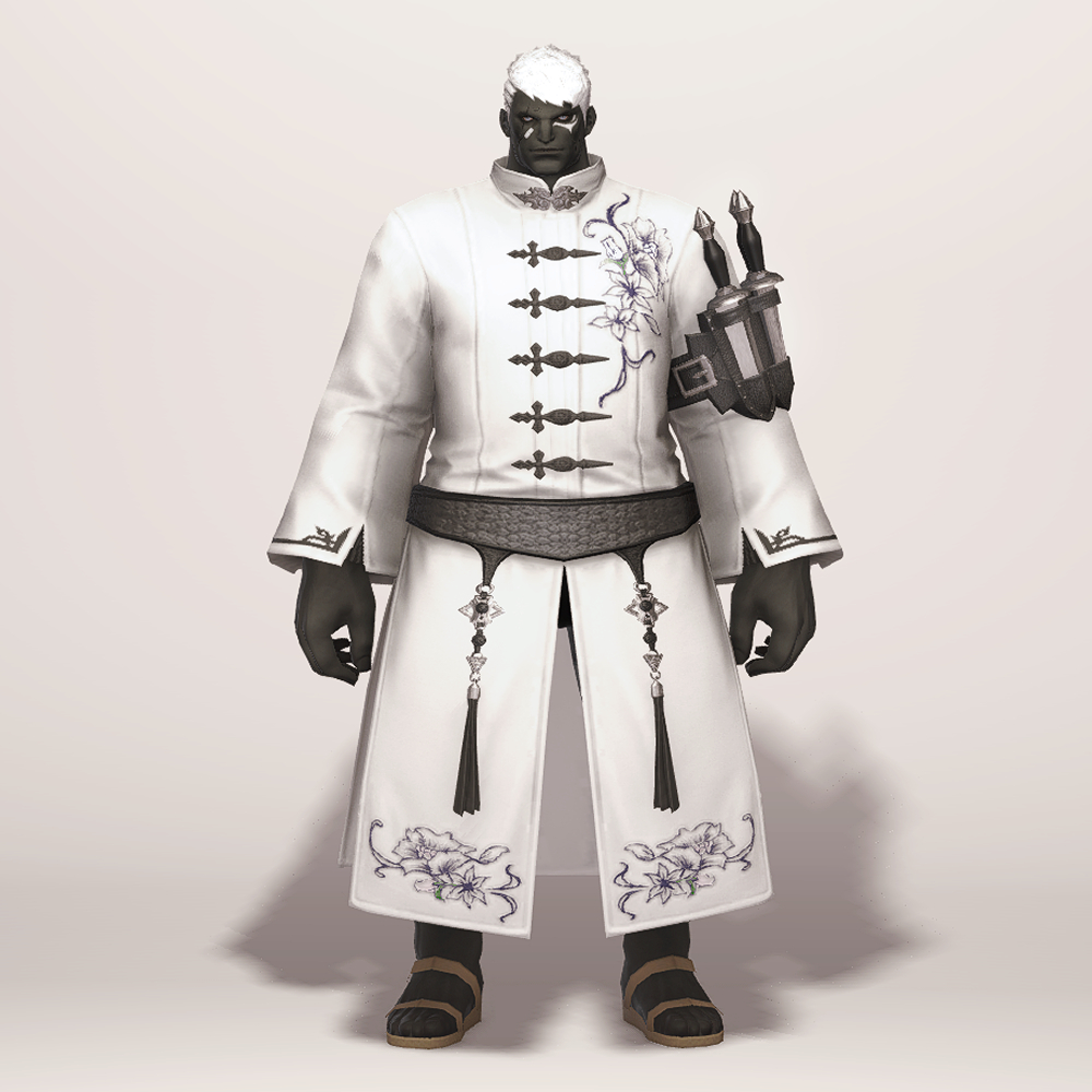 호화로운 자수로 멋을 낸 모던한 느낌의 상의입니다. 깔끔하면서도 고급스러운 디자인에 기품 있어 보이며 가슴과 등 쪽의 꽃 자수가 디테일합니다. 곳곳의 금속 장식들도 눈에 띄지만 보는 사람을 기준으로 오른쪽 팔뚝의 3개의 나이프가 유독 더 눈에 띕니다. 나이프가 거슬린다면 쿰비라 그리핀 장갑처럼 팔뚝까지 오는 장갑과 함께 매치하는 것을 추천드립니다.