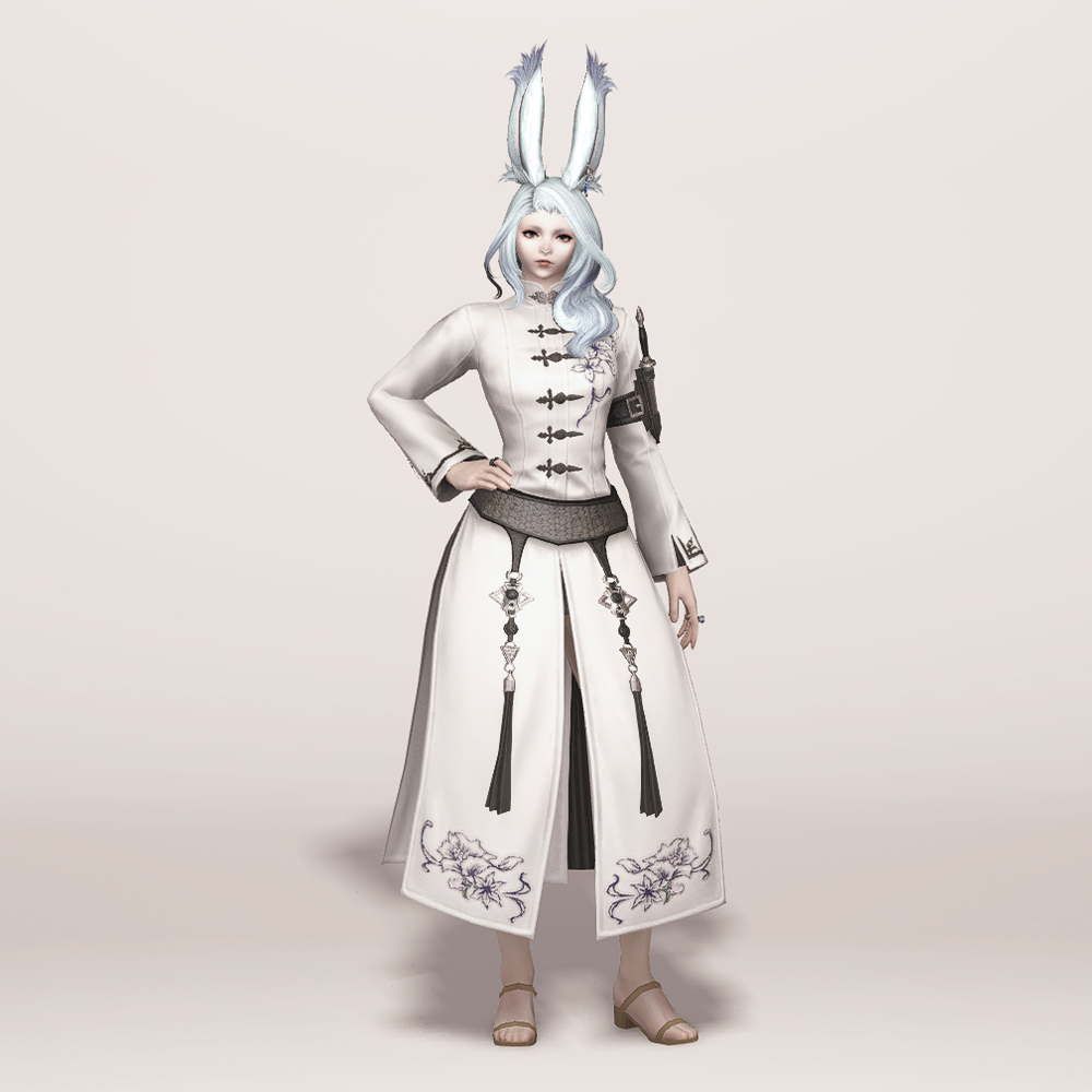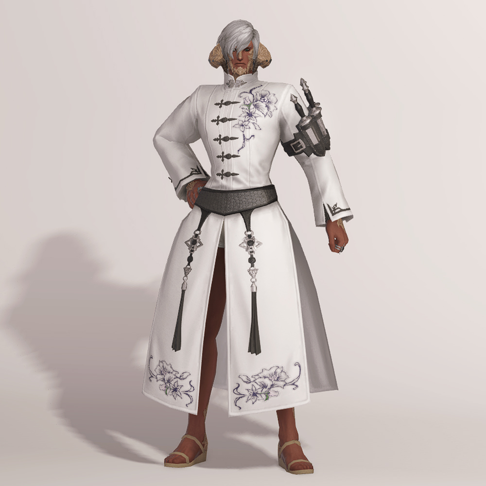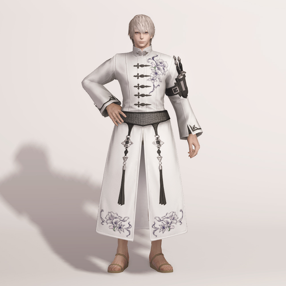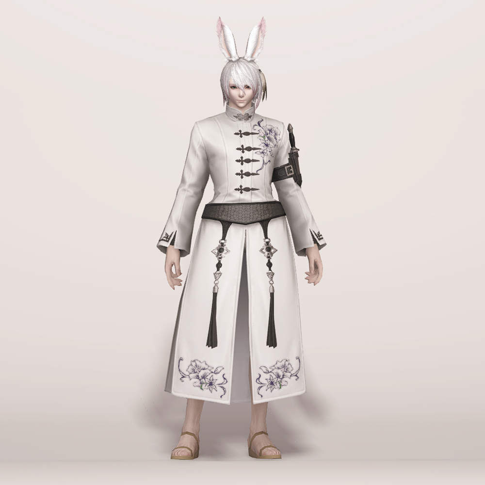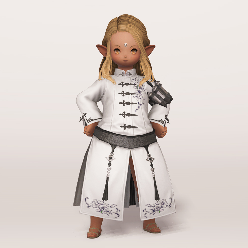 호화로운 자수로 멋을 낸 모던한 느낌의 상의입니다. 깔끔하면서도 고급스러운 디자인에 기품 있어 보이며 가슴과 등 쪽의 꽃 자수가 디테일합니다. 곳곳의 금속 장식들도 눈에 띄지만 보는 사람을 기준으로 오른쪽 팔뚝의 3개의 나이프가 유독 더 눈에 띕니다. 나이프가 거슬린다면 쿰비라 그리핀 장갑처럼 팔뚝까지 오는 장갑과 함께 매치하는 것을 추천드립니다.