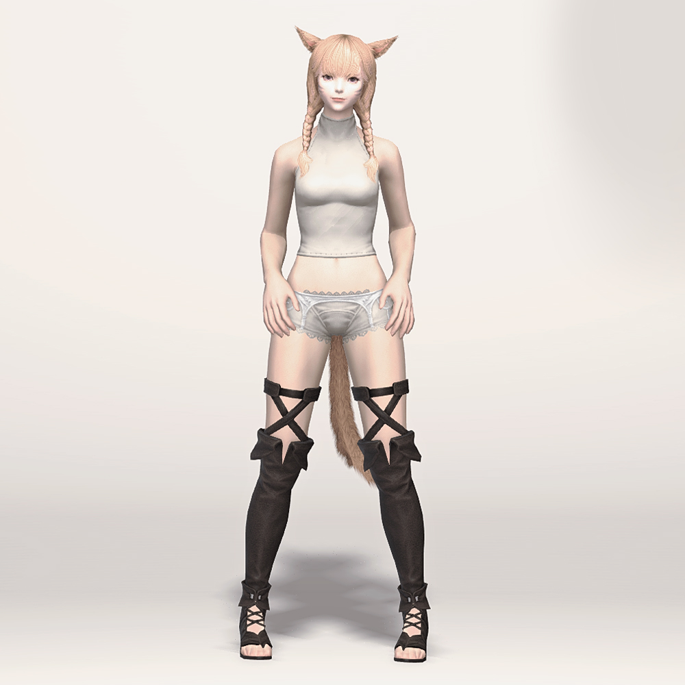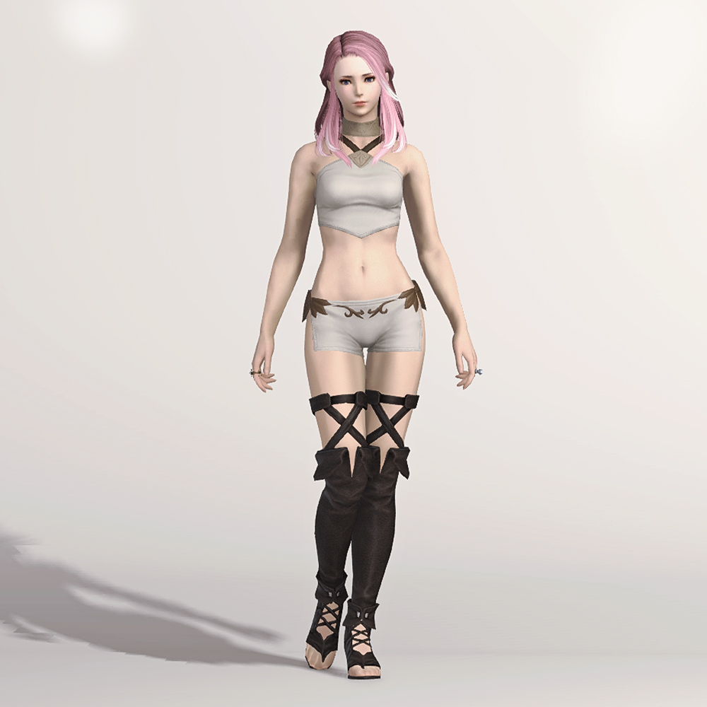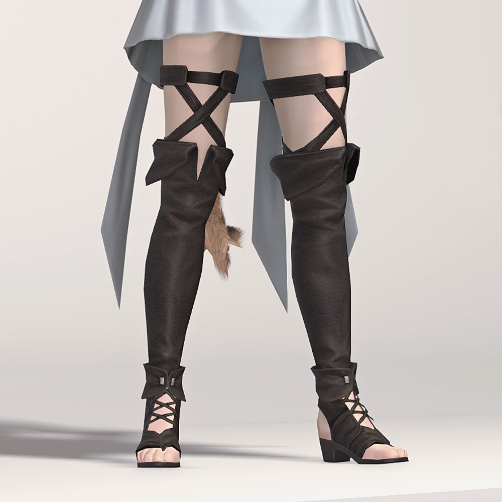 빛의 무녀 린의 신발로 샌들을 변형한 니하이 부츠입니다. 허벅지의 엑스 자 모양의 스트랩이 눈에 띄며, 긴 바지와 매치하면 전부 반바지로 만들어버립니다. (X스트랩부분의 하의부분이 아예 표시되지 않습니다)동방 미희 속곳은 스타킹까지 반으로 잘라버리고 파고스 치마바지(여)의 오버니삭스 같은 경우는 아예 사라져 매치에 신경 쓴다면 다양하게 활용할 수 있습니다. 성스러운 무지개 하의, 탐험대 반바지, 신이슈가르드 유격대 하의 등처럼 가터벨트류와 매치하면 잘 어울려 추천드립니다.