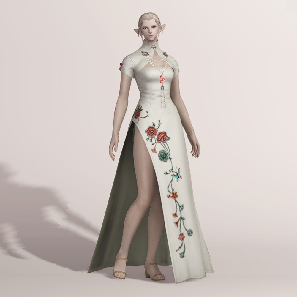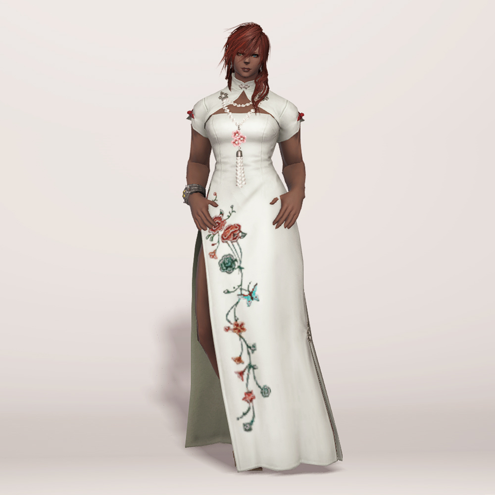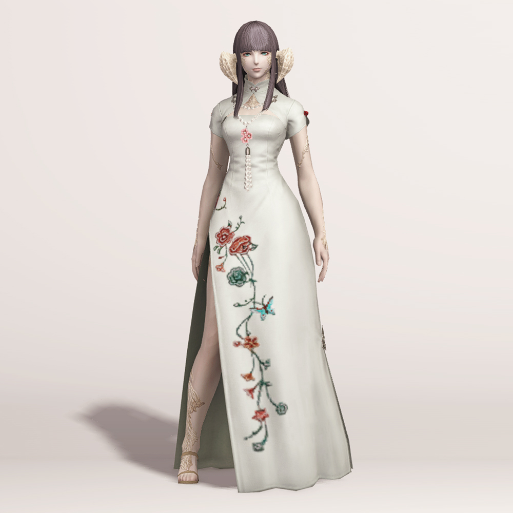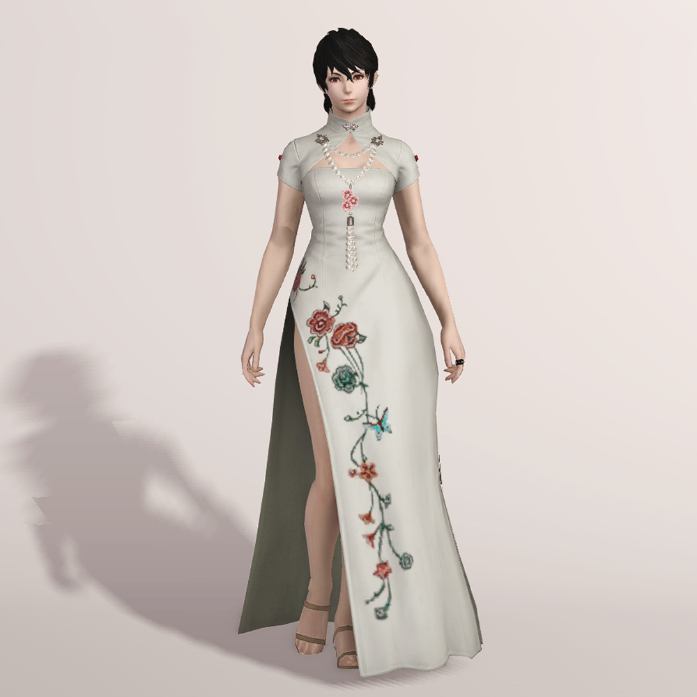 호화롭고 디테일한 자수로 멋을 낸 모던한 느낌의 롱치파오 원피스입니다. 가슴과 등이 과감하게 노출되어 있는 백리스로 크롭 볼레로 재킷을 걸쳤습니다. 진주처럼 예쁘게 빛나는 장식들이 포인트로 들어가 전체적으로 고급스러우면서도 기품 있습니다.