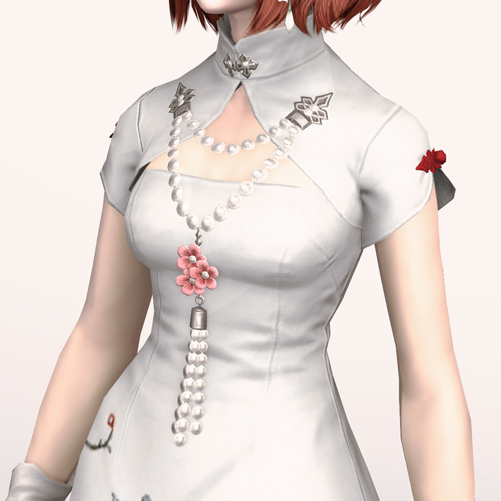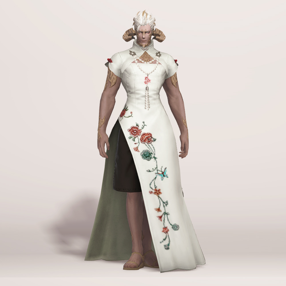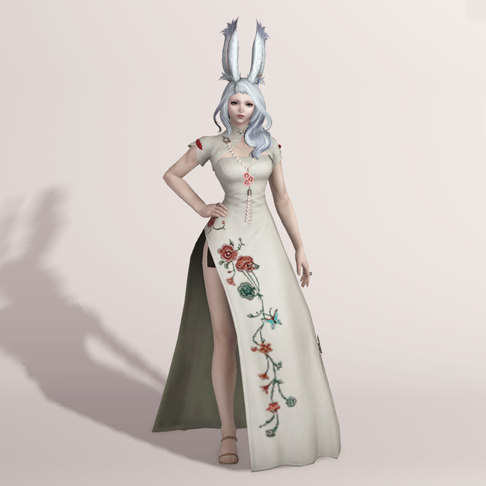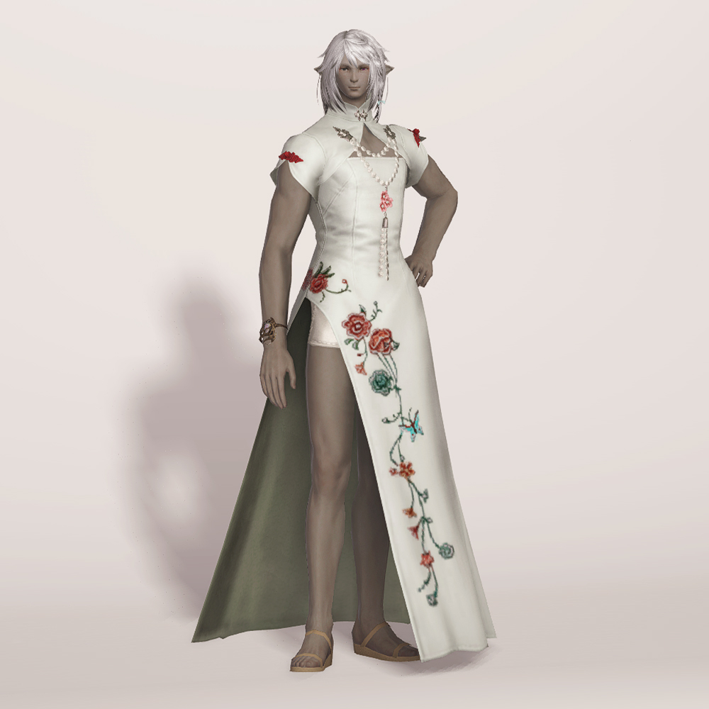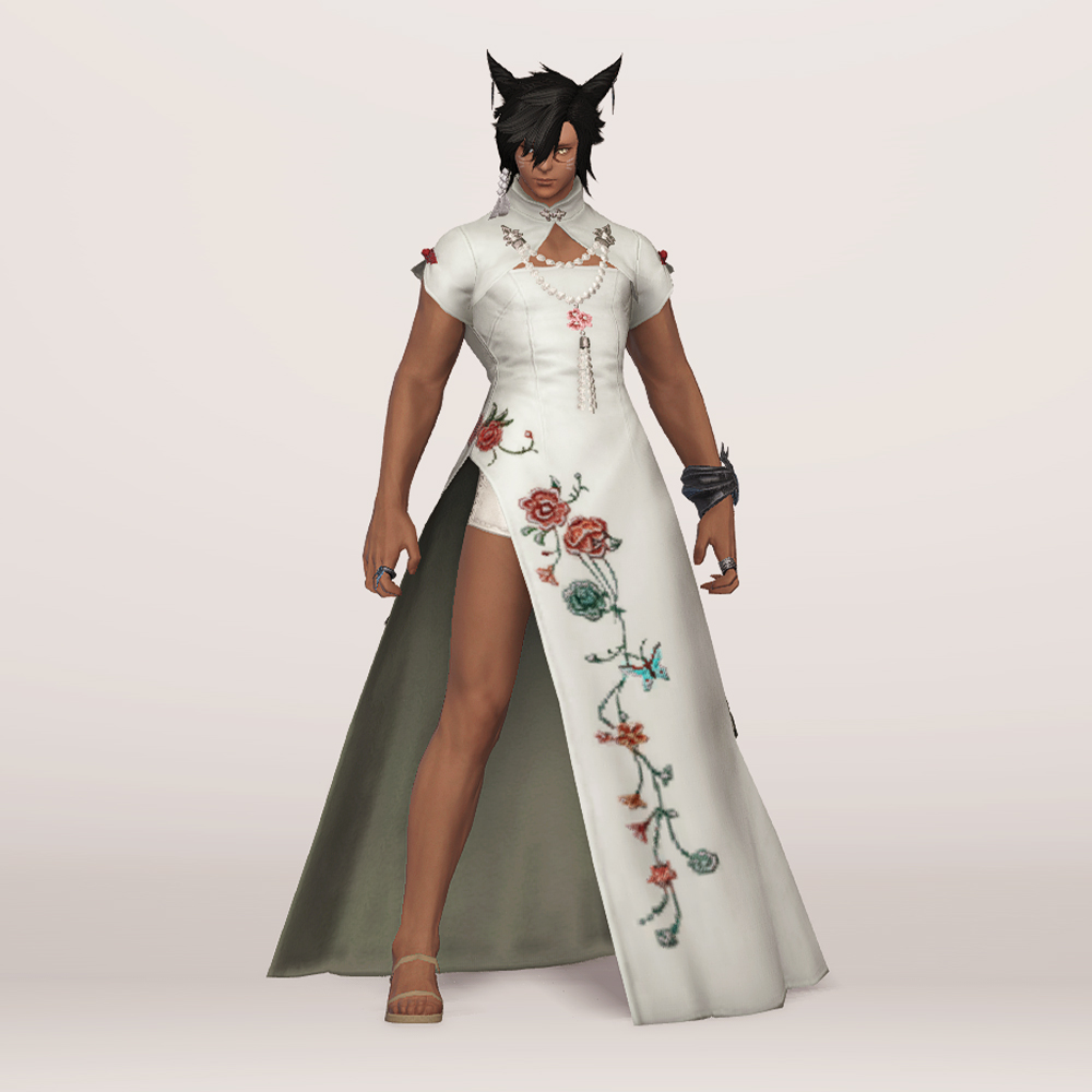 호화롭고 디테일한 자수로 멋을 낸 모던한 느낌의 롱치파오 원피스입니다. 가슴과 등이 과감하게 노출되어 있는 백리스로 크롭 볼레로 재킷을 걸쳤습니다. 진주처럼 예쁘게 빛나는 장식들이 포인트로 들어가 전체적으로 고급스러우면서도 기품 있습니다.